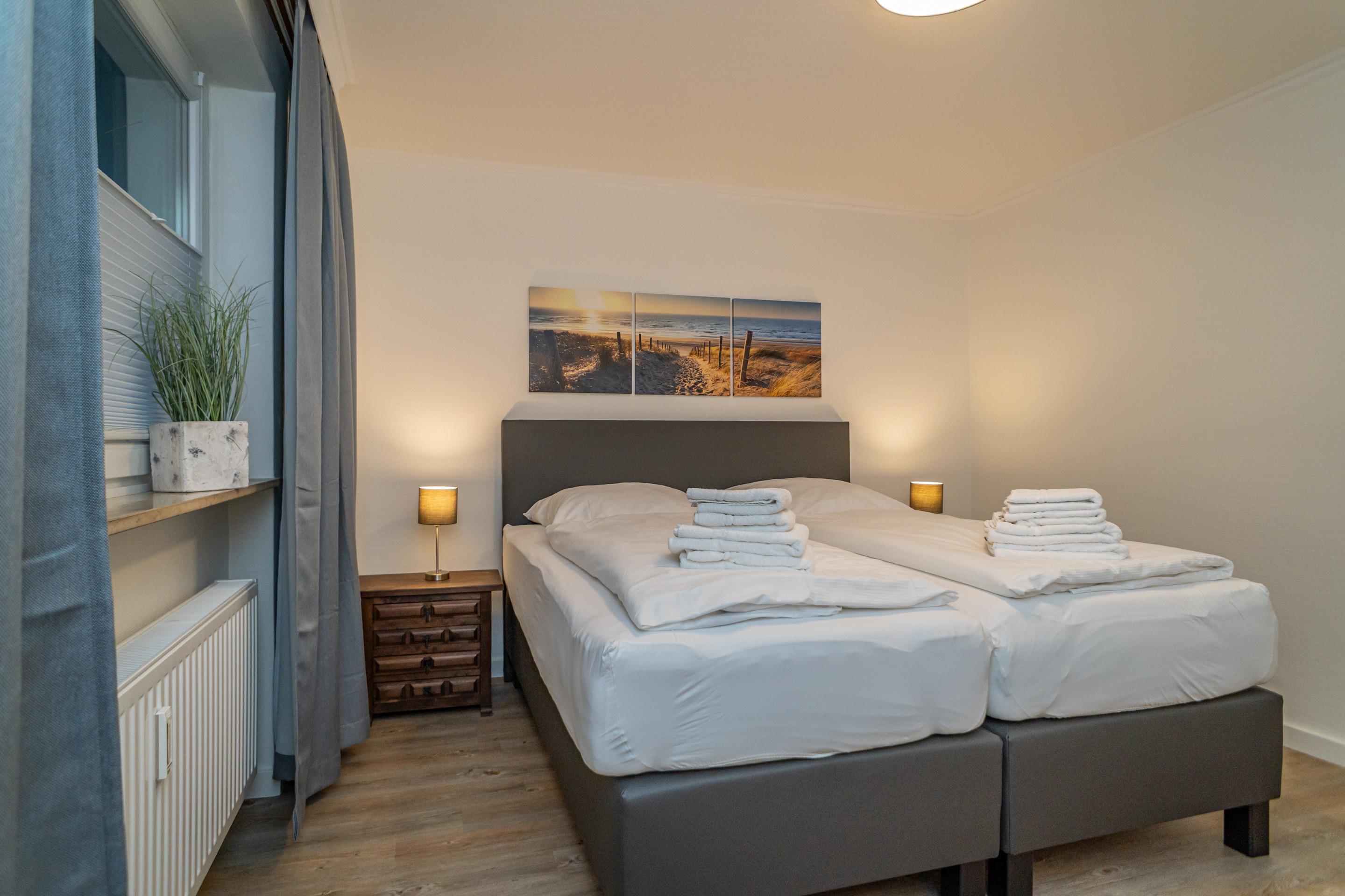 Das großzügige Schlafzimmer hat ein neues Boxspringbett (Liegefläche 2 m x 1,80, 2 Einzelmatratzen jeweils mit eigenem Topper) in Komfortliegehöhe und zwei bequemen Armlehnstühlen.