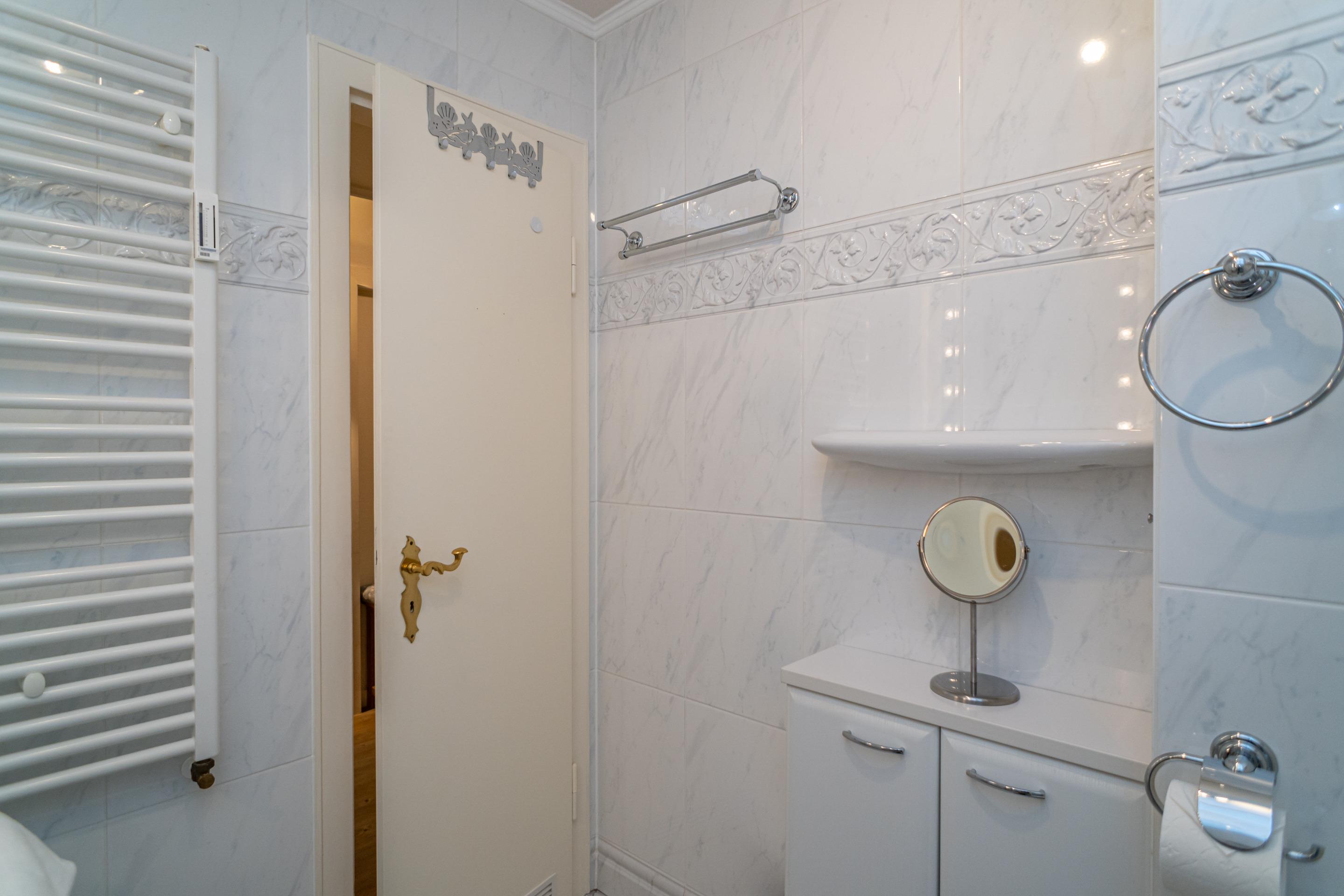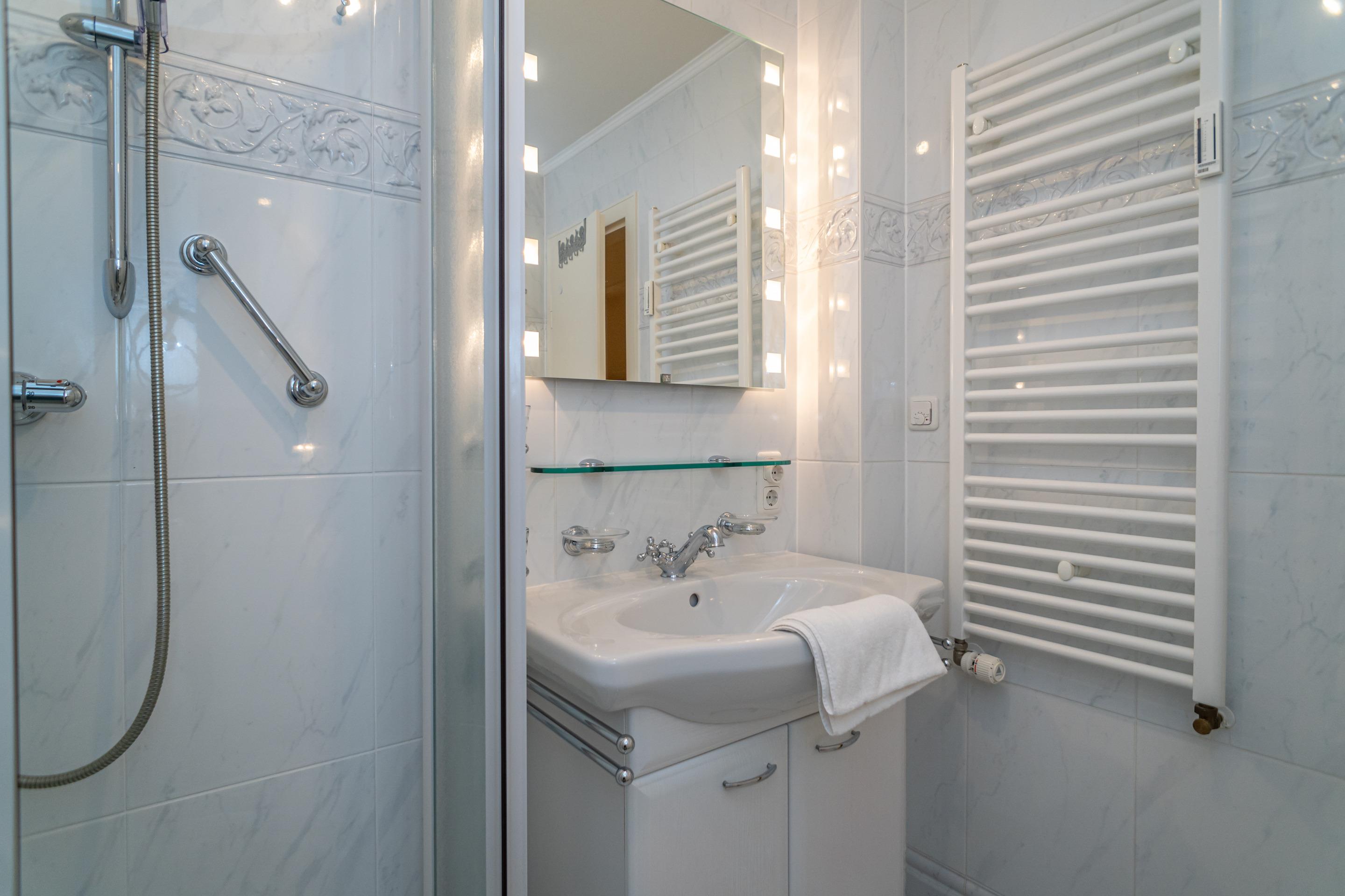 Das neuwertige Badezimmer ist mit Dusche, Waschtisch, Handtuchtrockner und WC ausgestattet.