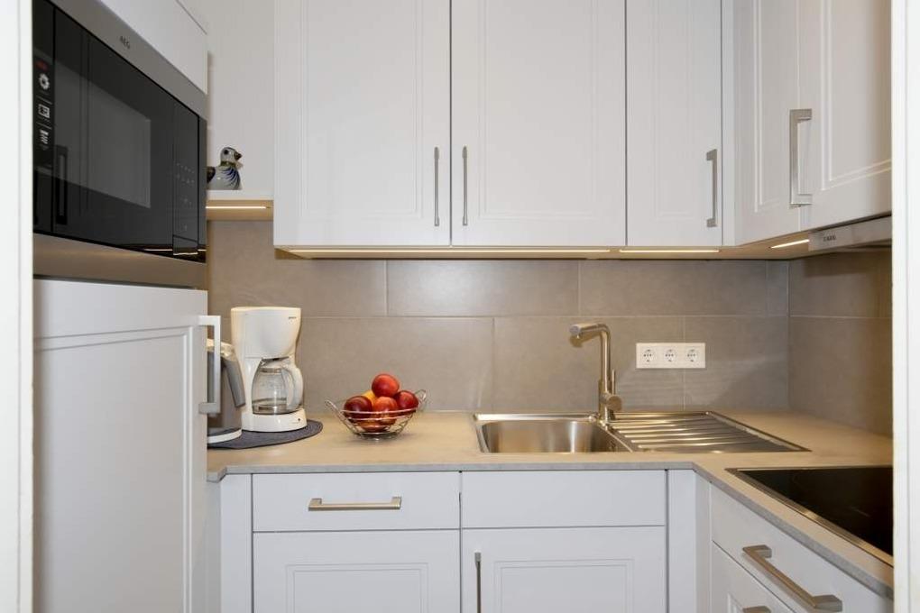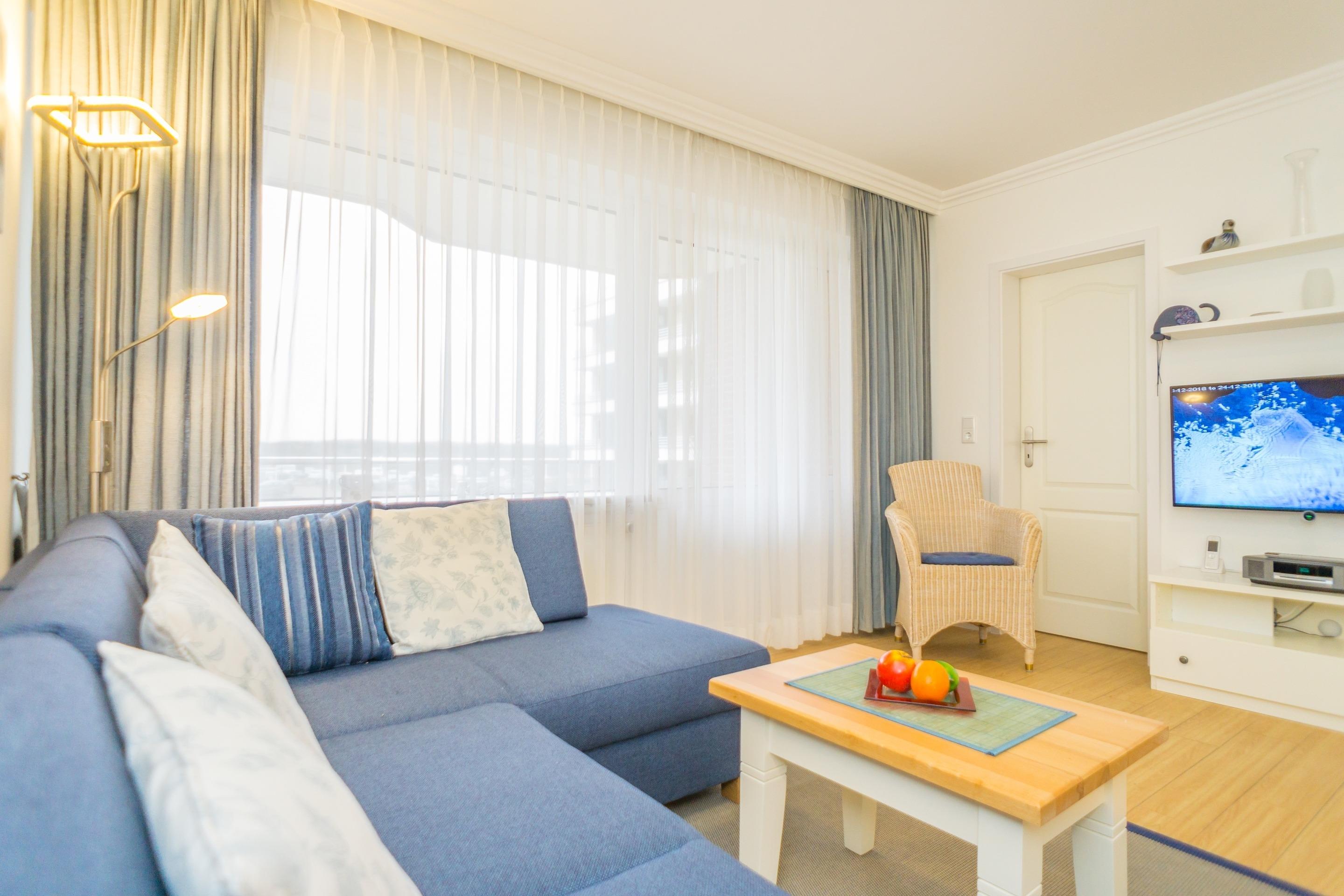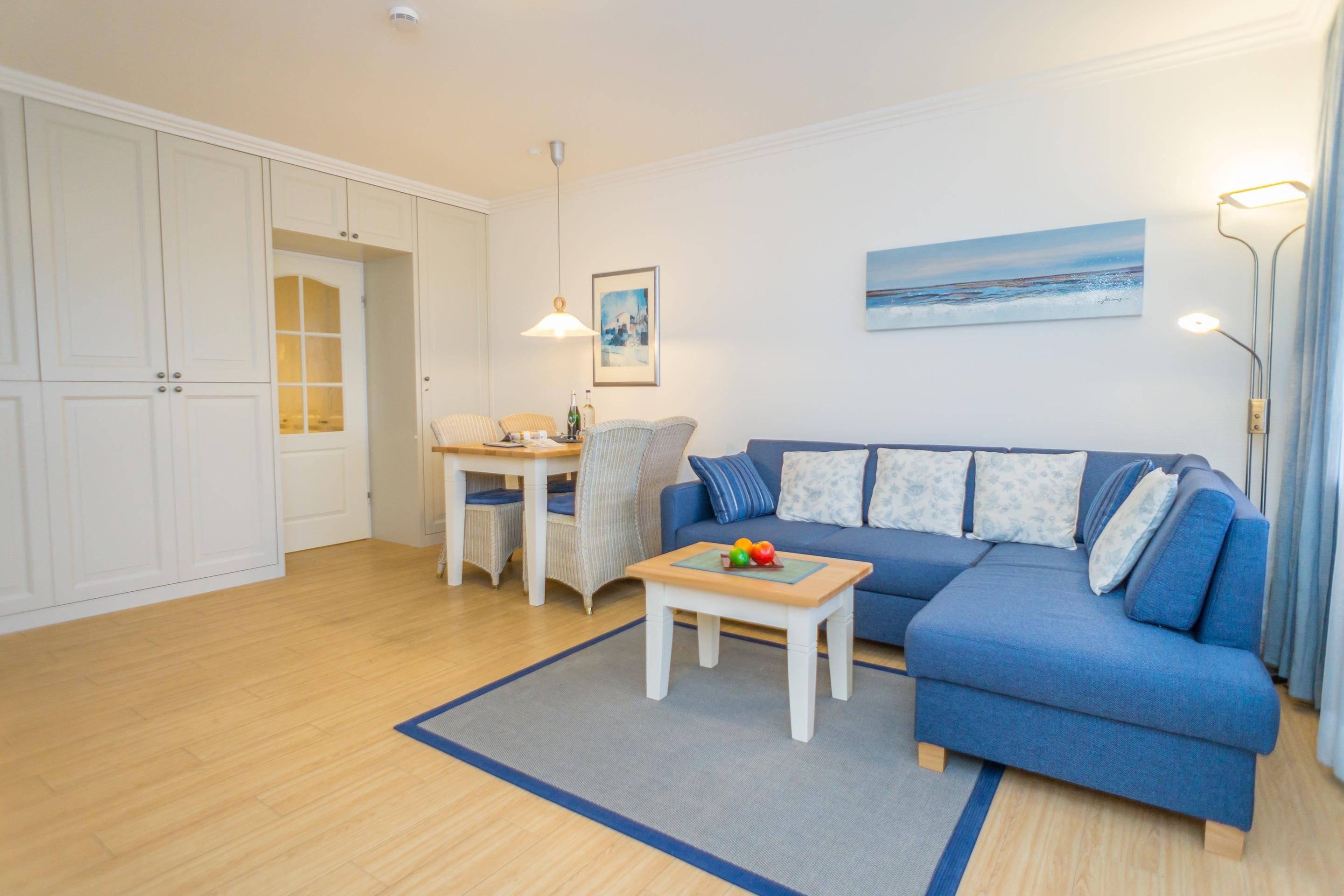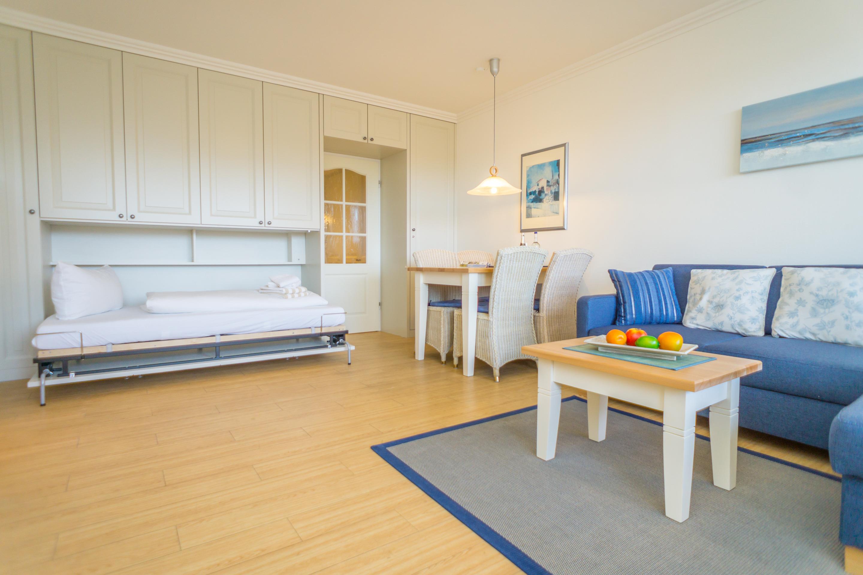 Das Wohnzimmer verfügt über einen Essplatz, eine Sitzecke mit Schlafmöglichkeit (1,20m x 1,80m), eine Vitrine mit Beleuchtung, Flachbildfernseher, Bose-Musikanlage und einer Schrankwand mit einem Querschläfer (0,90m x 2,00 m). Angrenzend befindet sich die offene, modern ausgestattete Kochnische mit Geschirrspüler, Mikrowelle, Ceranfeld, Kaffeemaschine, Wasser- und Eierkocher, sowie Geschirr und Besteck. Der höher eingebaute Kühlschrank bietet eine bequeme Handhabung.