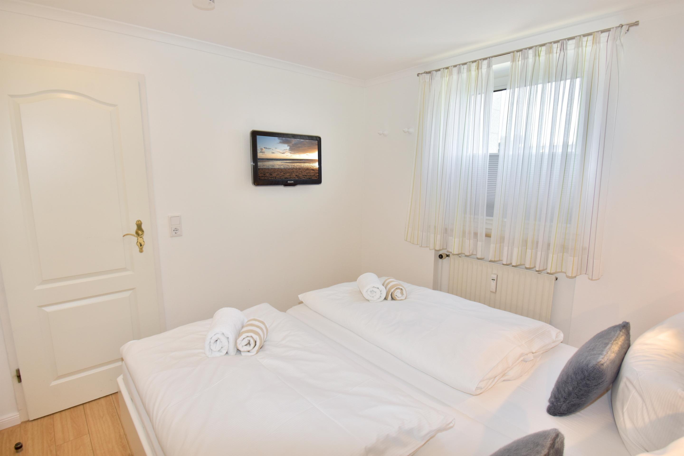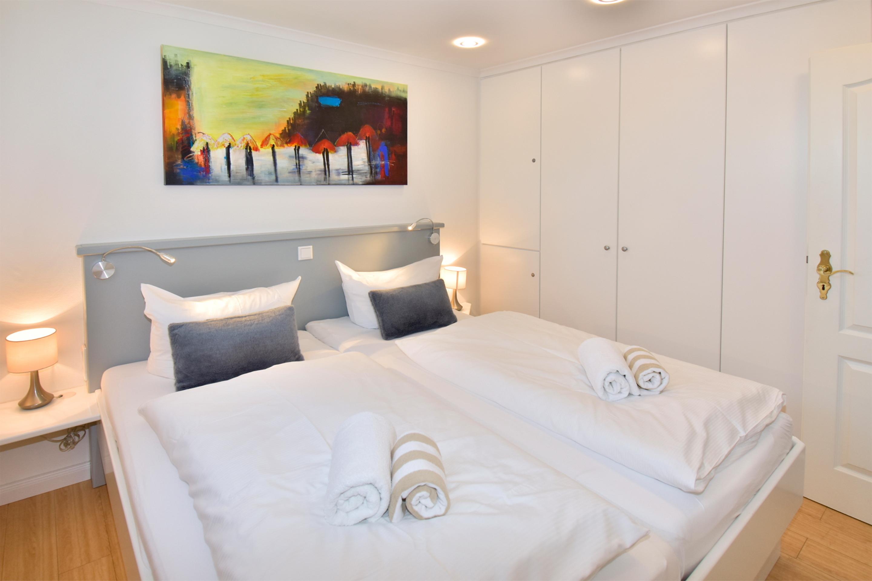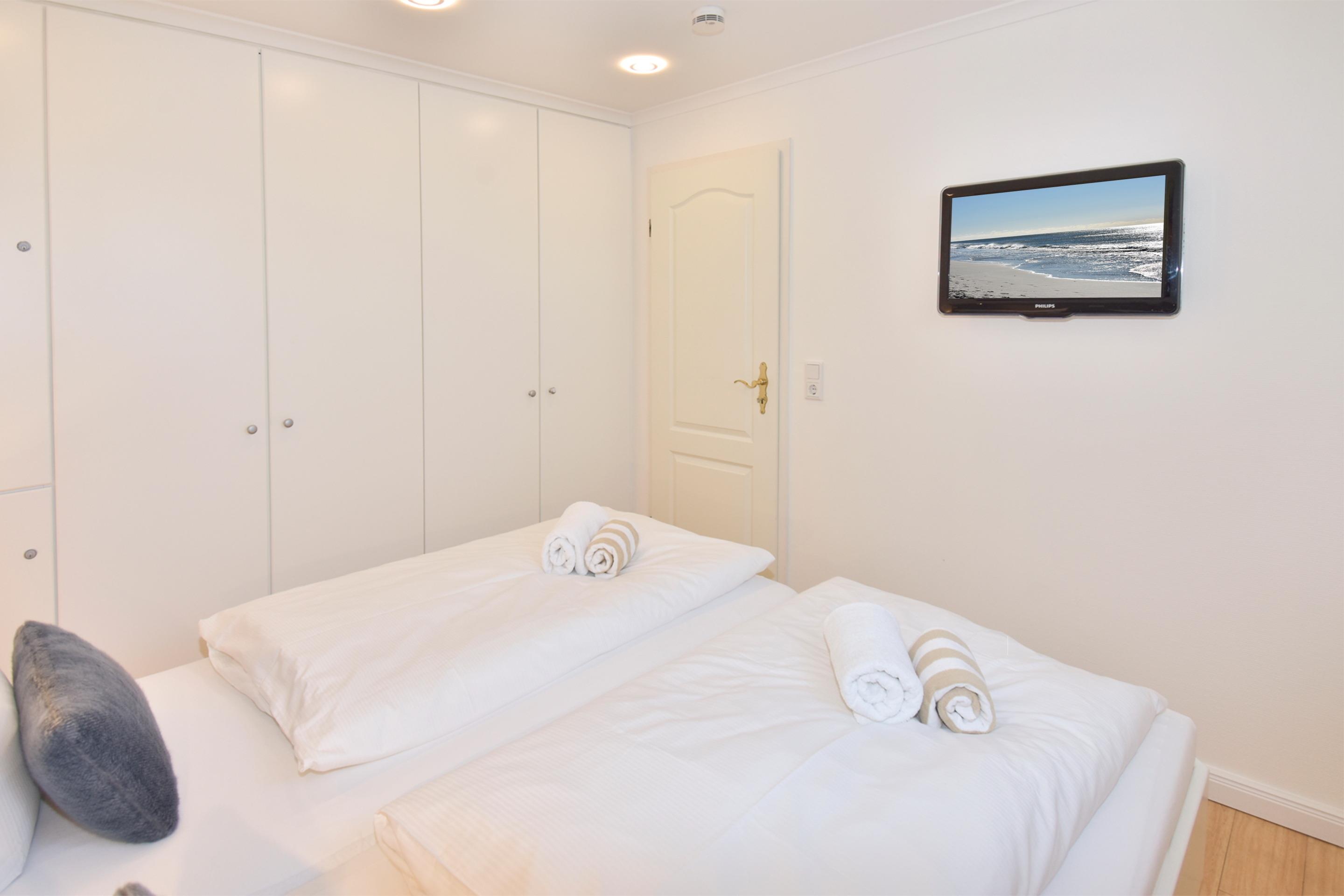 Das Schlafzimmer verfügt über ein Doppelbett ( Einzelmatratzen je 0,90m x 2, 00 m) mit komfortabler Einstiegshöhe und Extrabeleuchtung, einer Schrankwand und einem Fernseher.