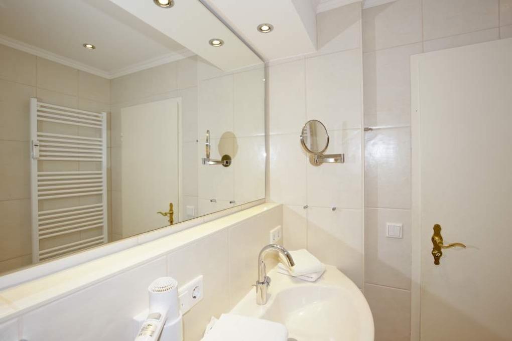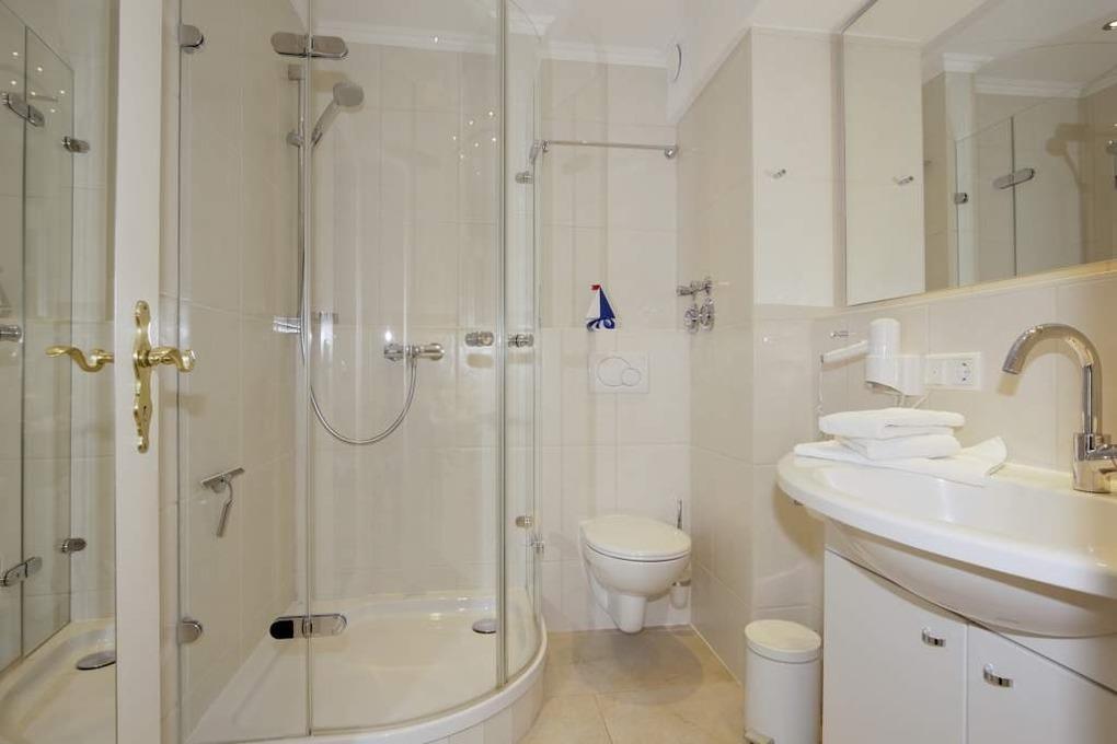Das Bad ist mit hellen Fliesen modern ausgestattet und verfügt über ein Duschbad, WC, Fön und Kosmetikspiegel.