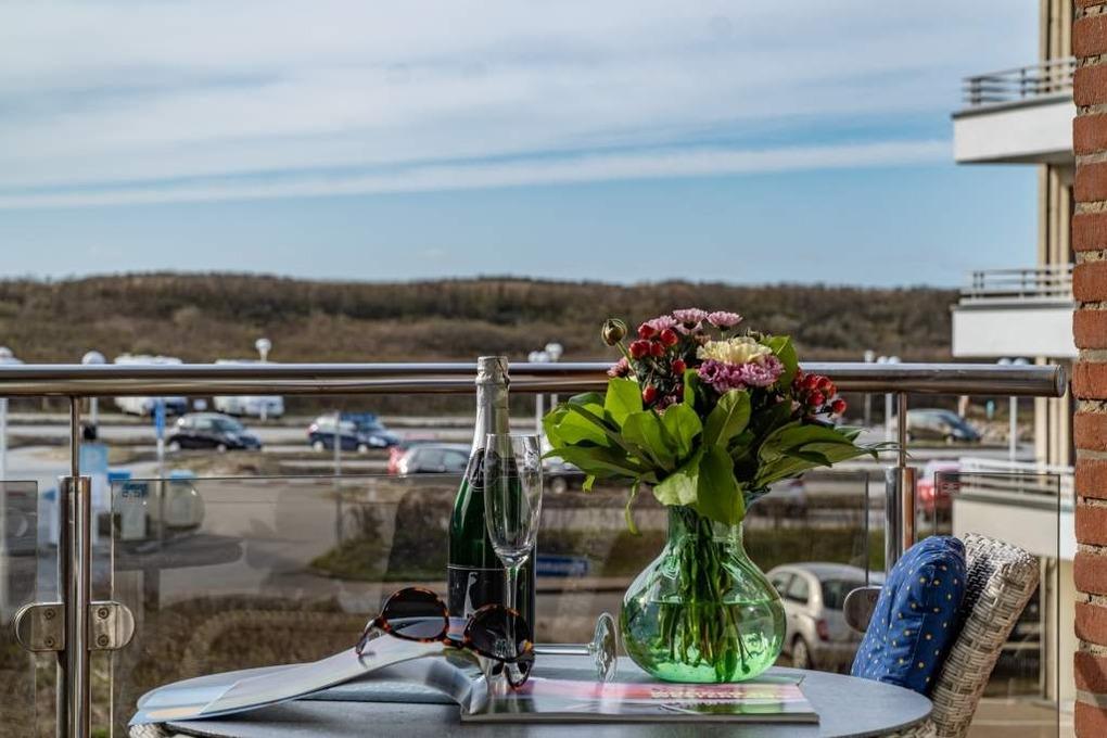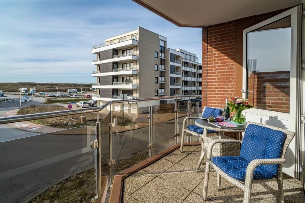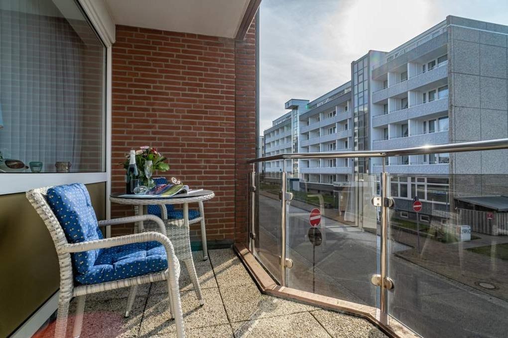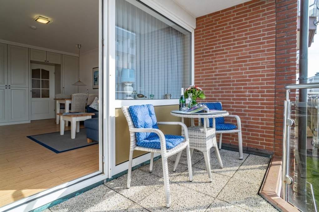 Neu gestaltete Zweiraum-Wohnung (53 qm) mit Inselflair in der 1. Etage für 3 Personen. Auf dem Balkon zur Westseite befinden sich Sitzmöbel und ein kleiner Tisch.
