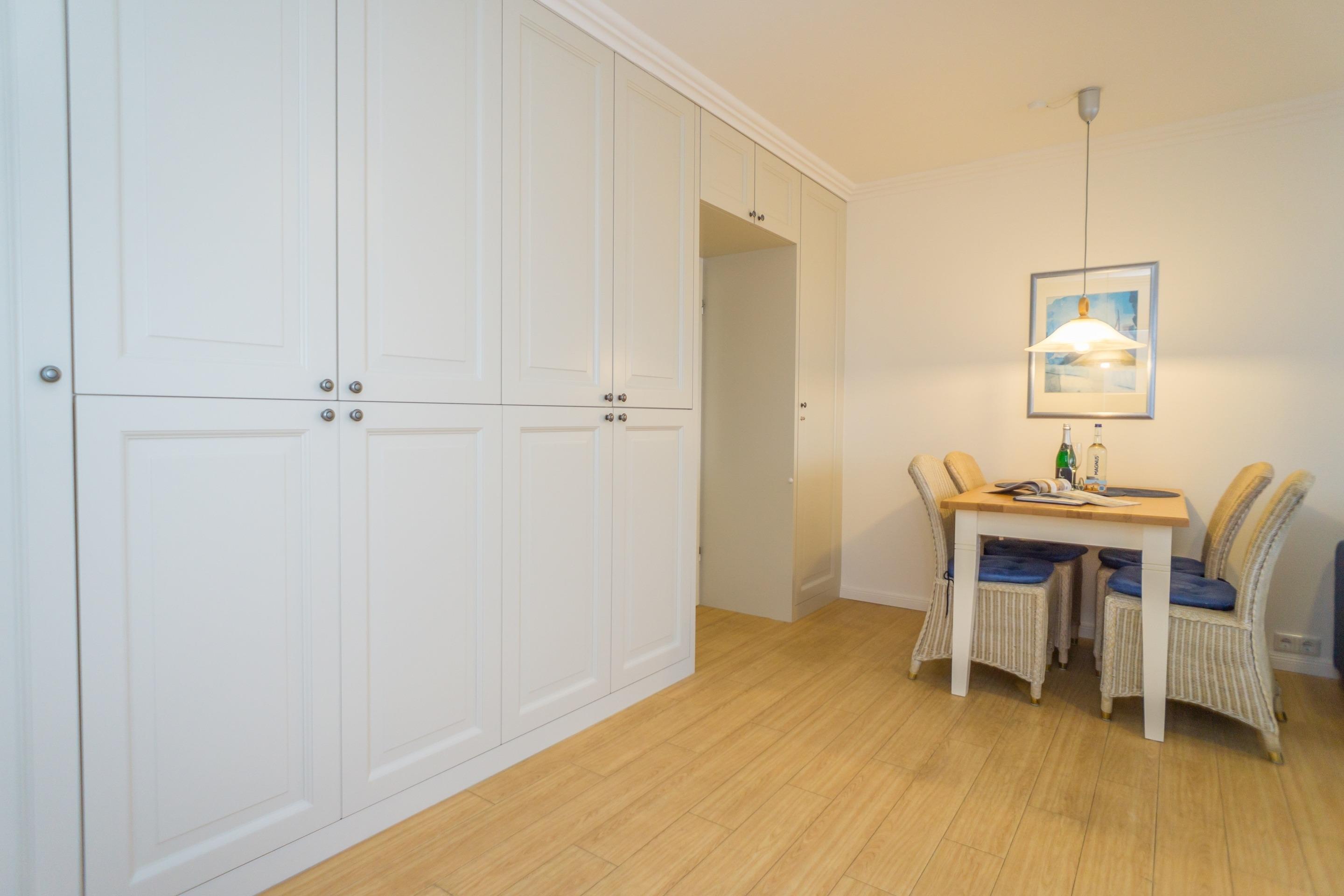 Im Vorflur befinden sich Einbauschränke und ein großer Spiegel an der Tür zum Bad.