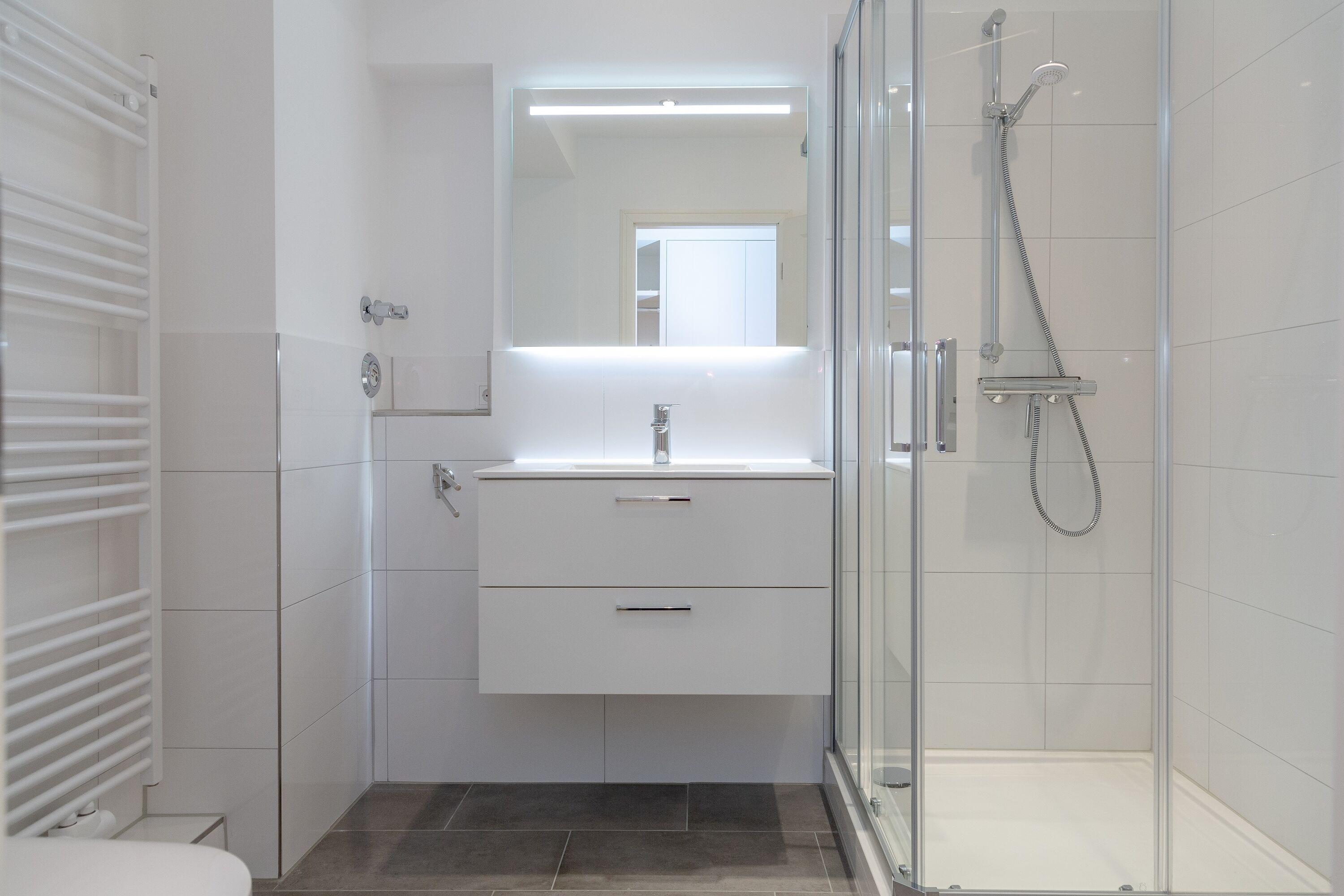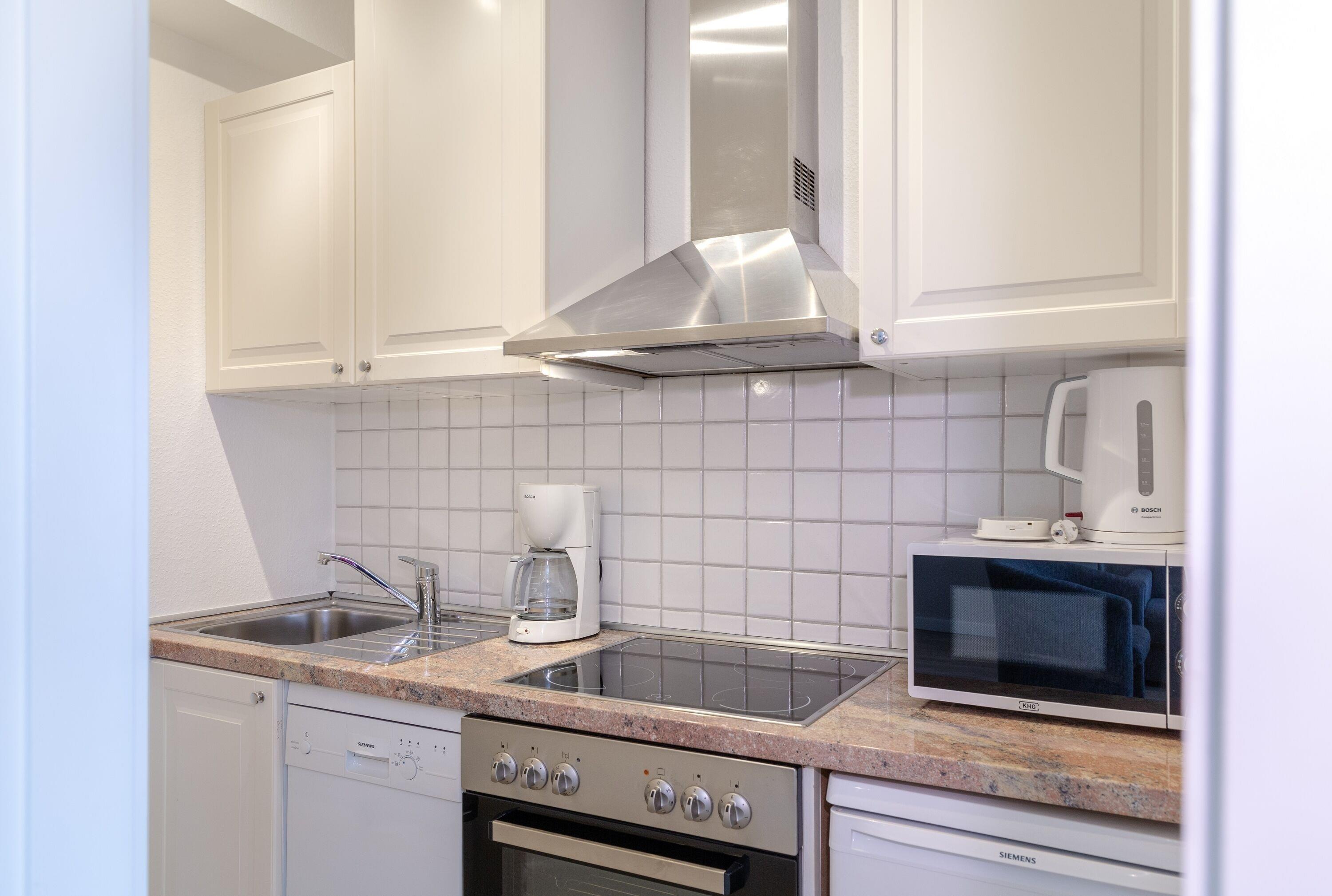 Die Küche ist mit Geschirrspüler, Mikrowelle, Cerankochfeld, Backofen und Dunstabzugshaube ausgestattet.