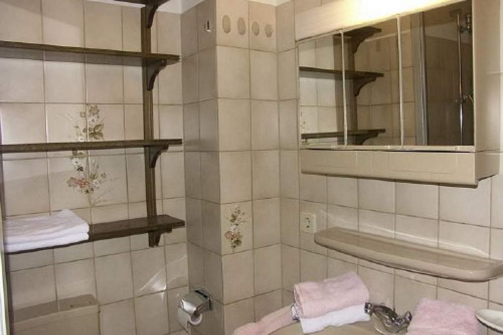 Das Duschbad hat einen Waschtisch, eine Dusche und ein WC.