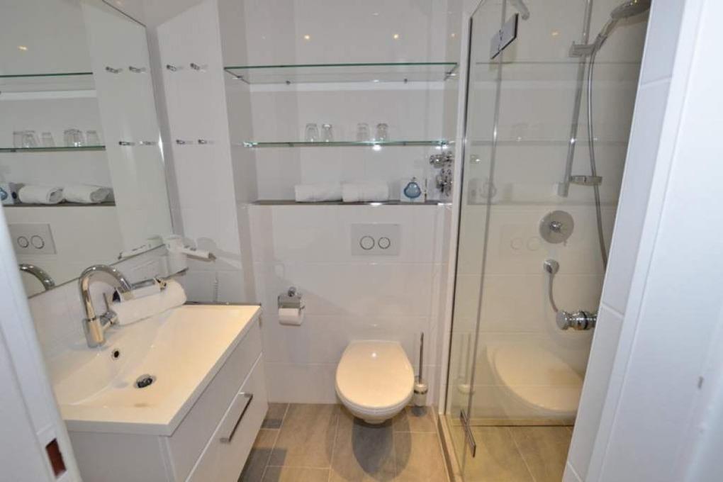 Das neue, moderne Bad bietet eine Dusche mit extra flachem Einstieg, Waschtisch, Handtuchtrockner, Fön und WC.