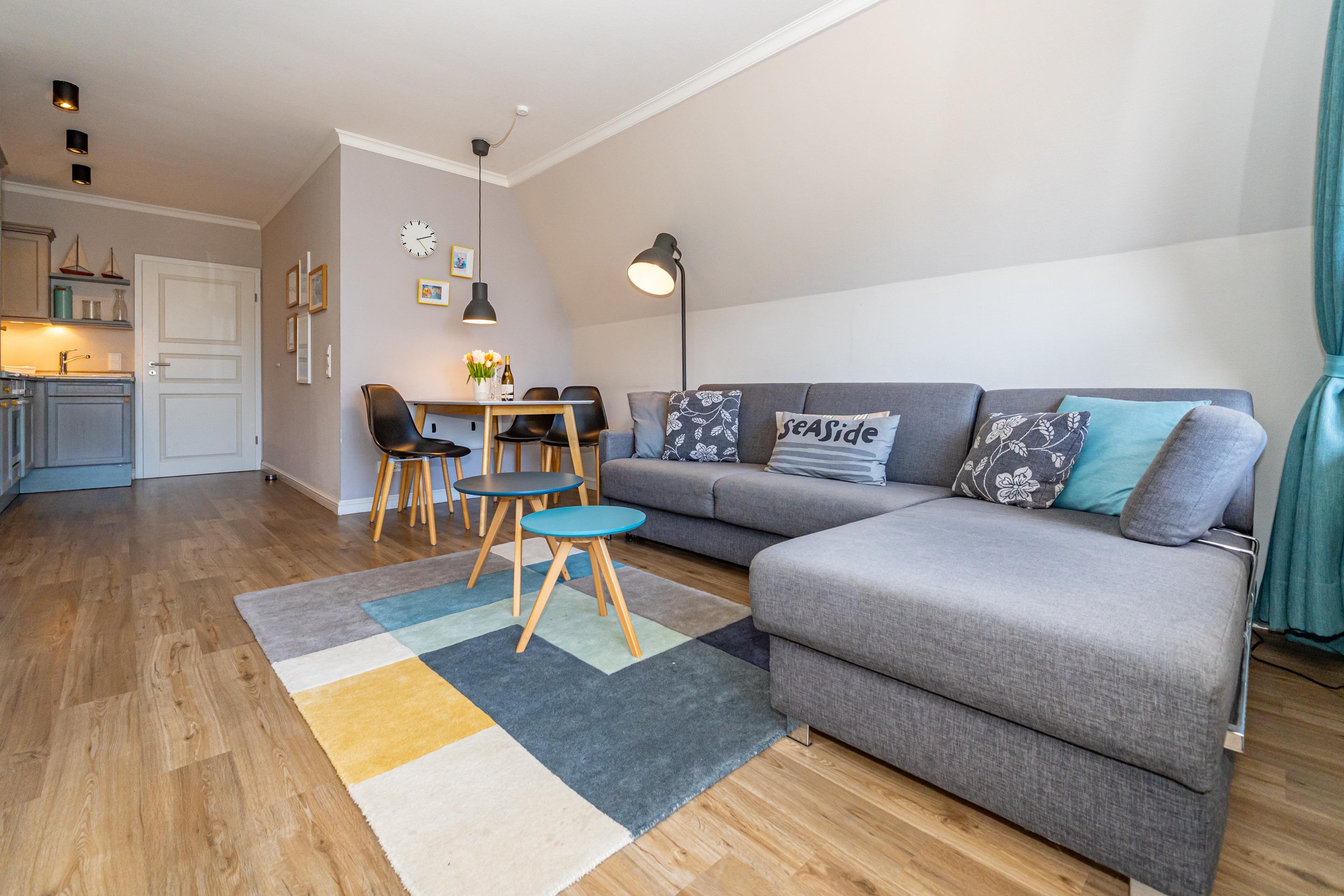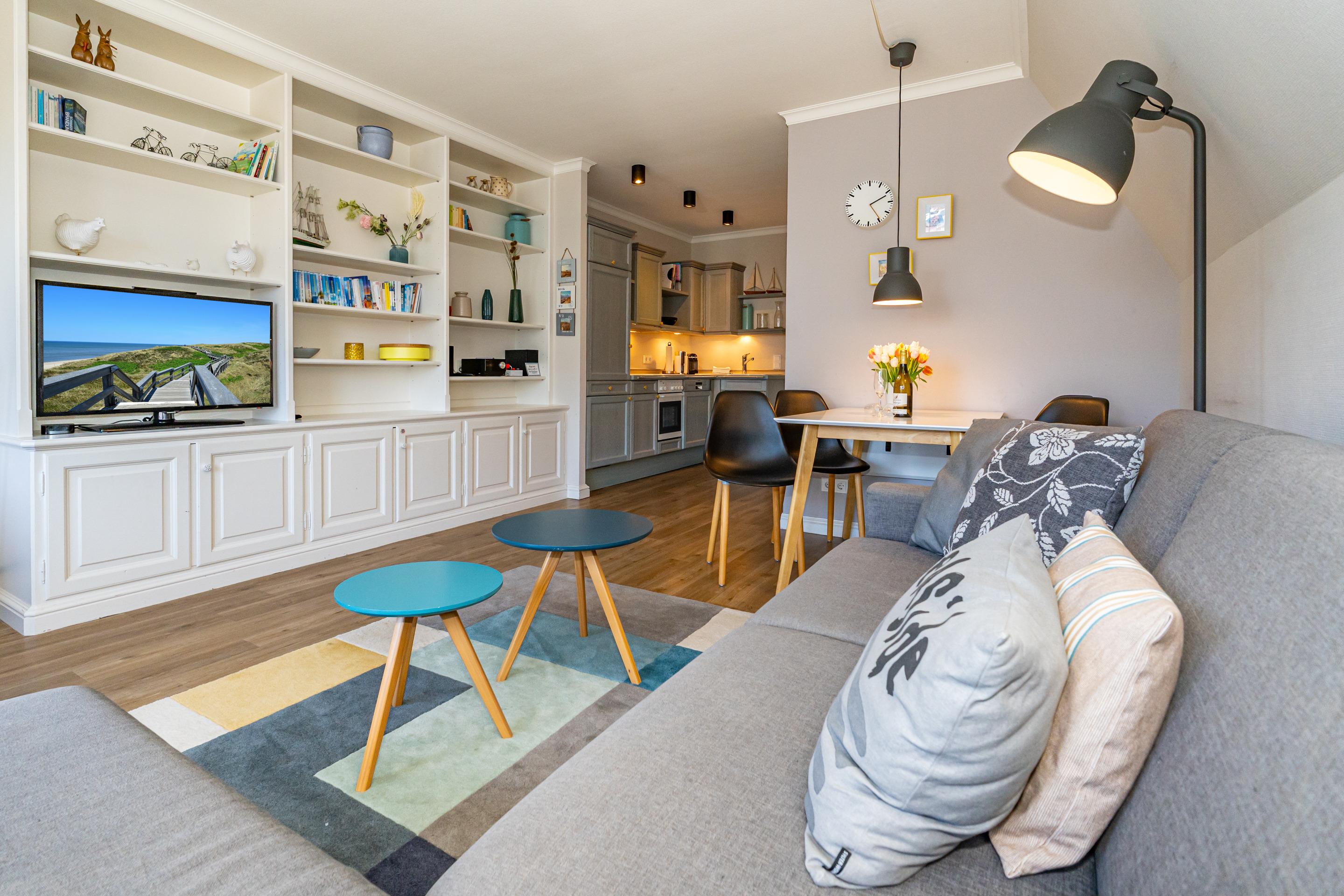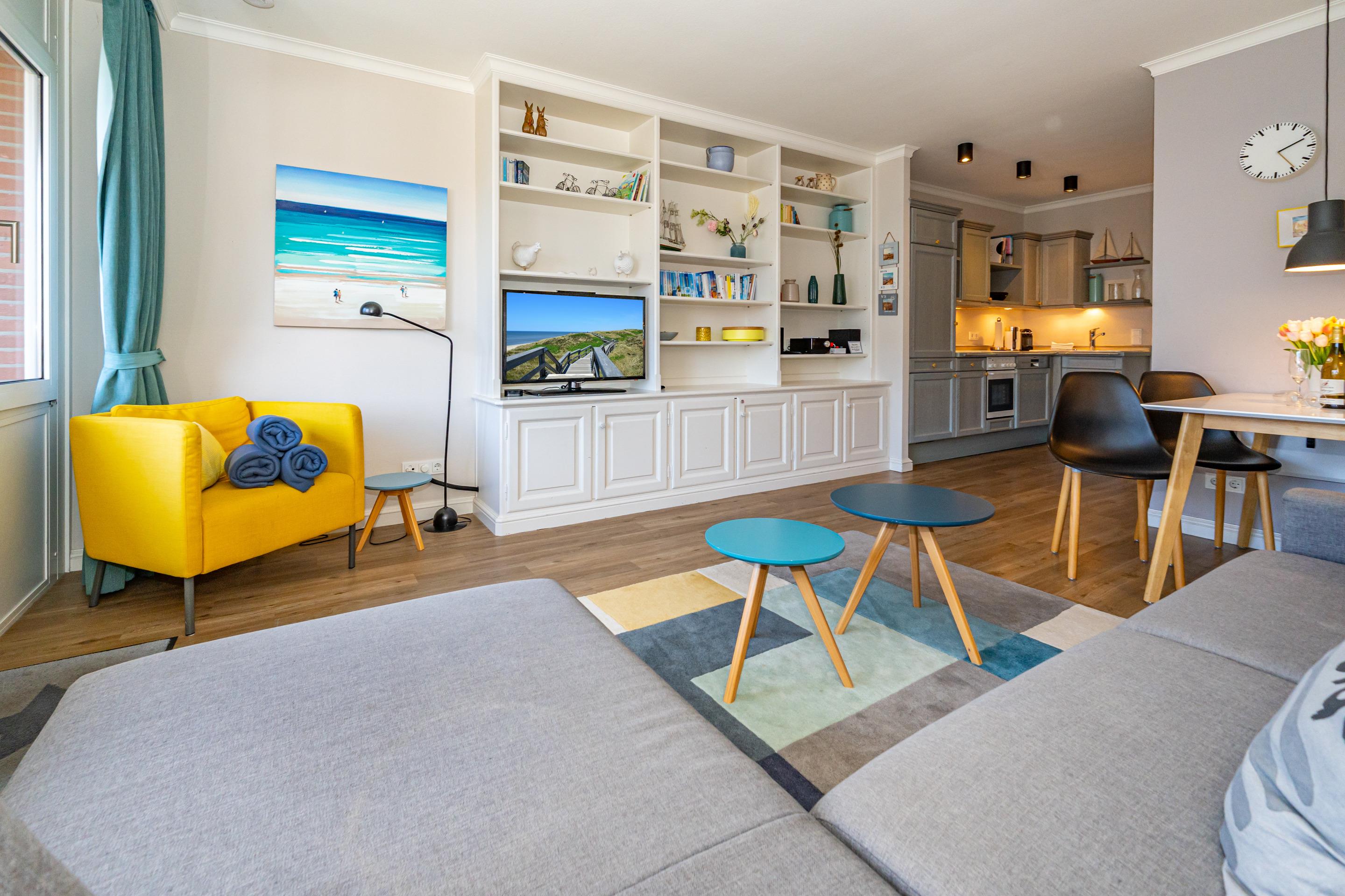 Mit pastelligen Farben und einem modernen Möbelmix bietet diese hochwertig ausgestattete Ferienwohnung "Sylter Glück" in Westerland auf einer Fläche von 75 m² Platz für maximal 4 Personen. Sie befindet sich in der 2. Etage und verfügt neben dem Wohnzimmer über ein Schlafzimmer sowie ein Badezimmer. Zur Ausstattung gehören ein Ostbalkon mit Balkonmöbeln, Auflagen, sowie ein offener WLAN Hotspot im Haus. Der Wohnbereich vereint eine gemütliche Schlafcouch (Liegefläche 1,40 x 2m), einen Flachbild-TV sowie eine voll ausgestattete offene Einbauküche mit Backofen, Geschirrspüler, Cerankochfeld sowie Nespressomaschine (Kapseln). Kühlschrank, Kaffeemaschine, Toaster und Wasserkocher gehören zur Grundausstattung. Vom Wohnzimmer aus hat man Zutritt auf den geschützten Balkon, der bei schönem Wetter zum sonnenbaden und verweilen einlädt. Für einen guten Start in den Tag sorgt das trendige großzügige Badezimmer, das nicht nur ein optischer Hingucker ist, sondern mit Regendusche, Fön und Handtuchtrockner entsprechende Annehmlichkeiten mit sich bringt.