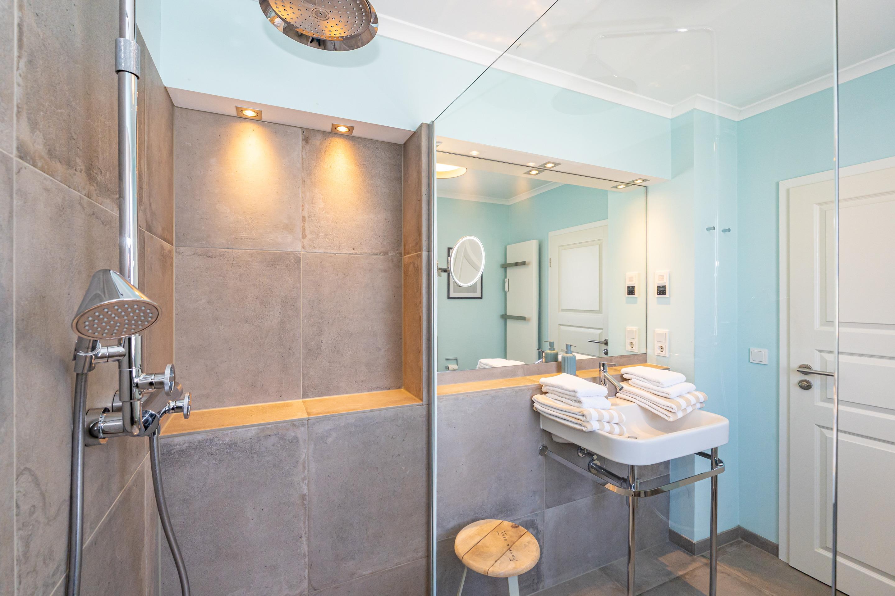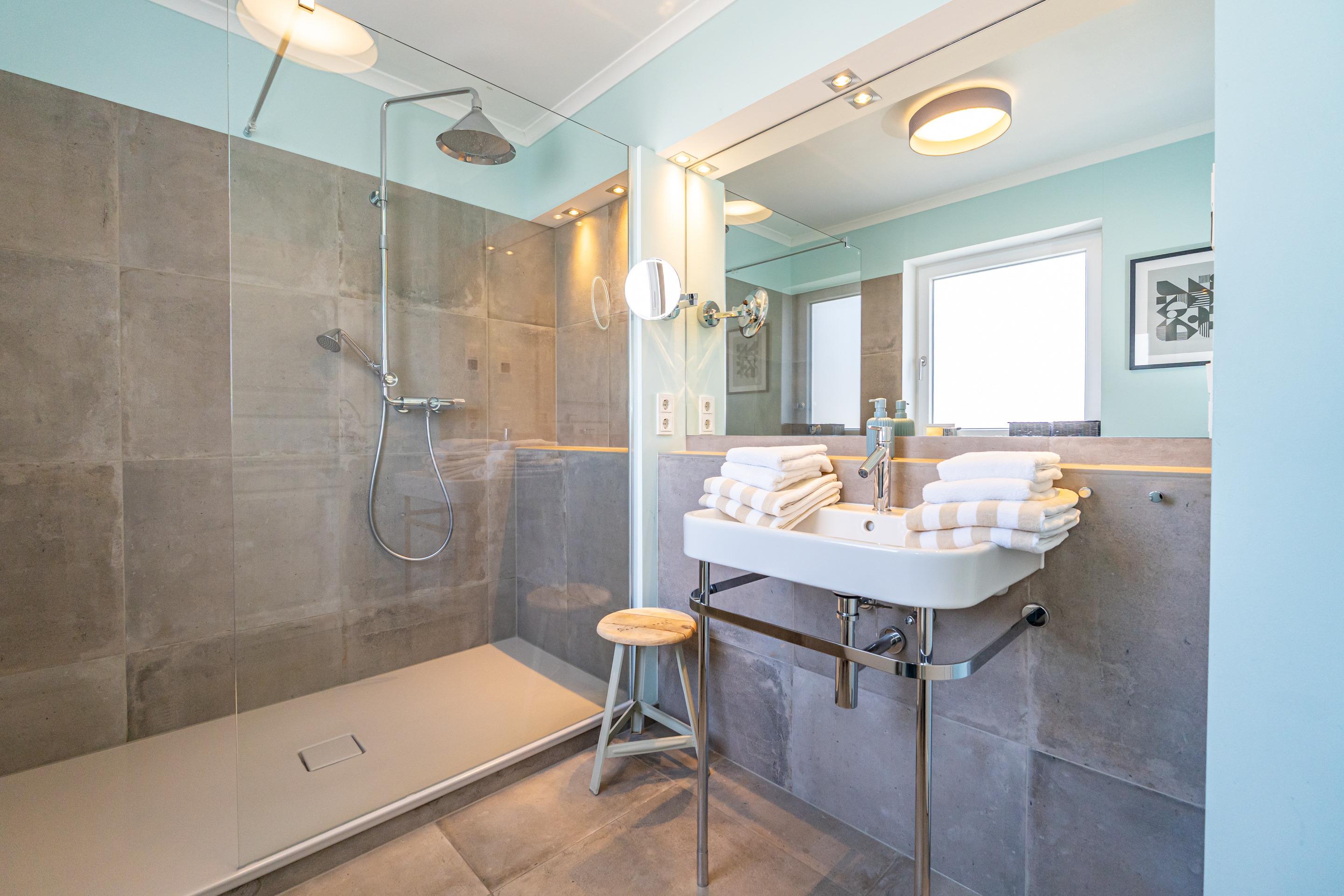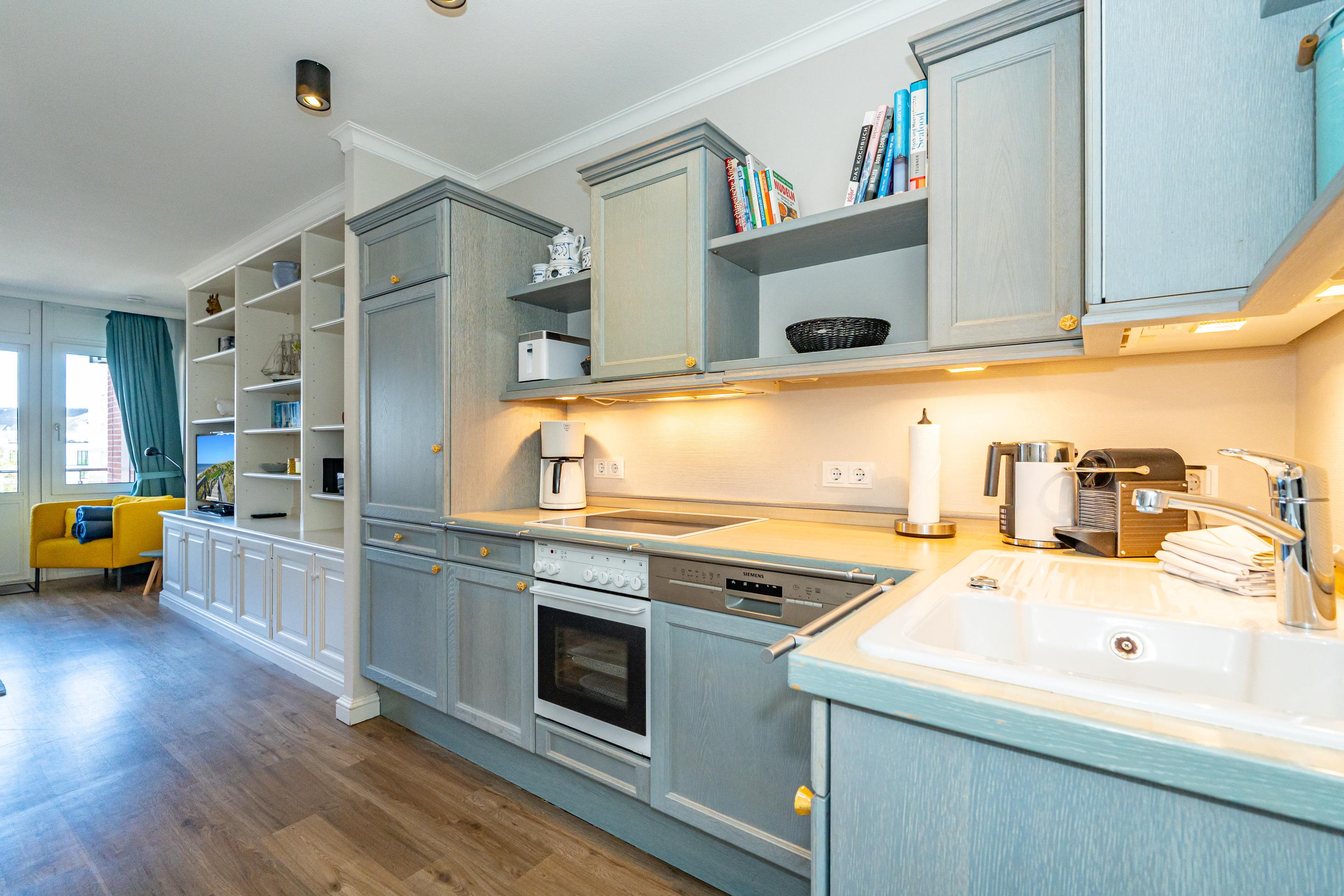 Mit pastelligen Farben und einem modernen Möbelmix bietet diese hochwertig ausgestattete Ferienwohnung "Sylter Glück" in Westerland auf einer Fläche von 75 m² Platz für maximal 4 Personen. Sie befindet sich in der 2. Etage und verfügt neben dem Wohnzimmer über ein Schlafzimmer sowie ein Badezimmer. Zur Ausstattung gehören ein Ostbalkon mit Balkonmöbeln, Auflagen, sowie ein offener WLAN Hotspot im Haus. Der Wohnbereich vereint eine gemütliche Schlafcouch (Liegefläche 1,40 x 2m), einen Flachbild-TV sowie eine voll ausgestattete offene Einbauküche mit Backofen, Geschirrspüler, Cerankochfeld sowie Nespressomaschine (Kapseln). Kühlschrank, Kaffeemaschine, Toaster und Wasserkocher gehören zur Grundausstattung. Vom Wohnzimmer aus hat man Zutritt auf den geschützten Balkon, der bei schönem Wetter zum sonnenbaden und verweilen einlädt. Für einen guten Start in den Tag sorgt das trendige großzügige Badezimmer, das nicht nur ein optischer Hingucker ist, sondern mit Regendusche, Fön und Handtuchtrockner entsprechende Annehmlichkeiten mit sich bringt.