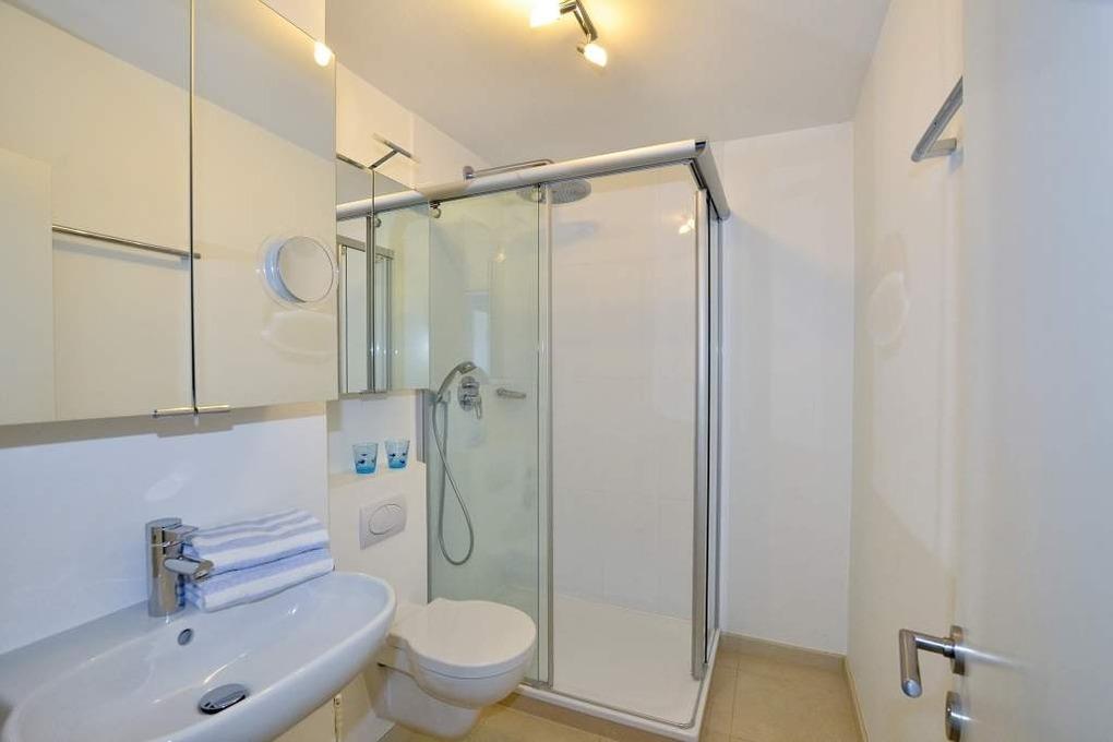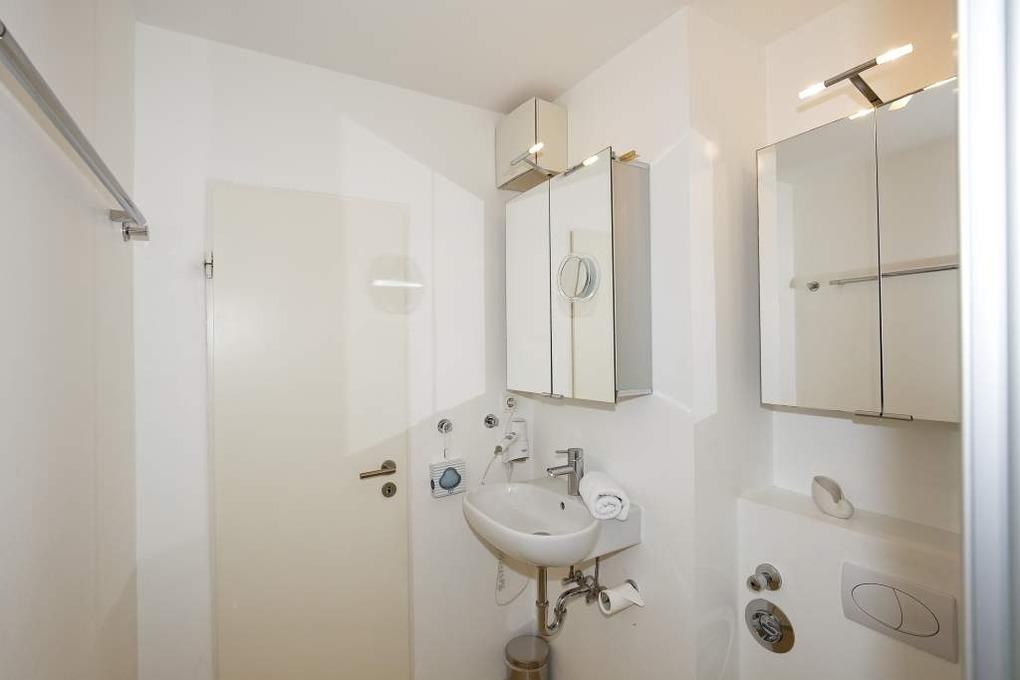 Das moderne Duschbad/WC hat einen Waschtisch, einen Handtuchtrockner und einen Fön.