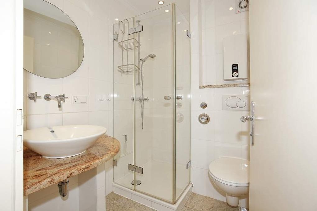Das Badezimmer ist mit einer Dusche, einem Waschtisch, einem WC , einem Fön und einem Schminkspiegel mit Licht ausgestattet.