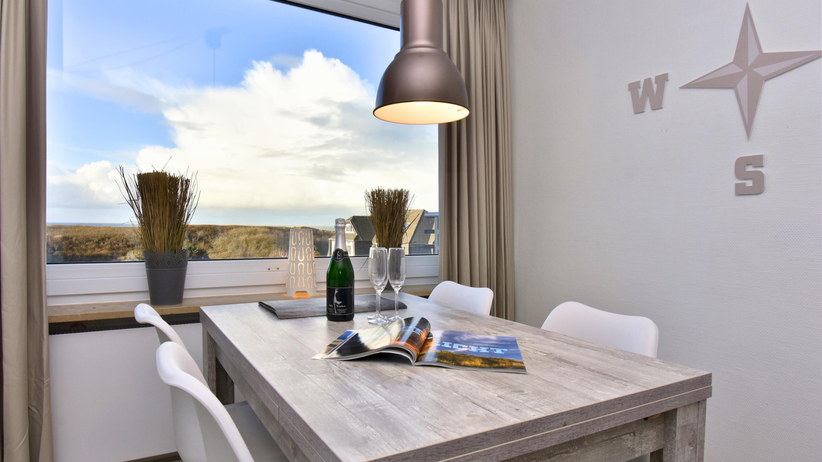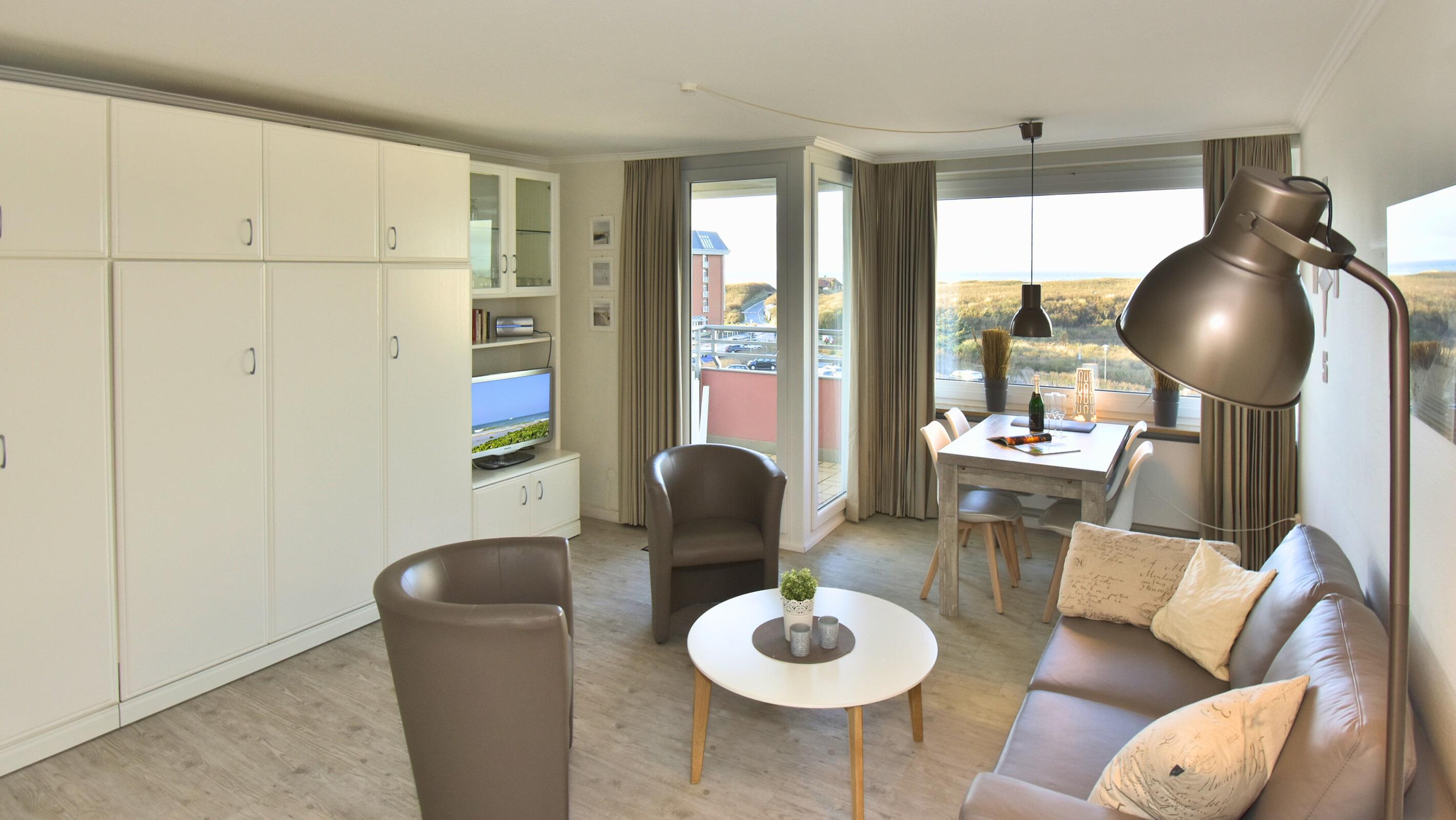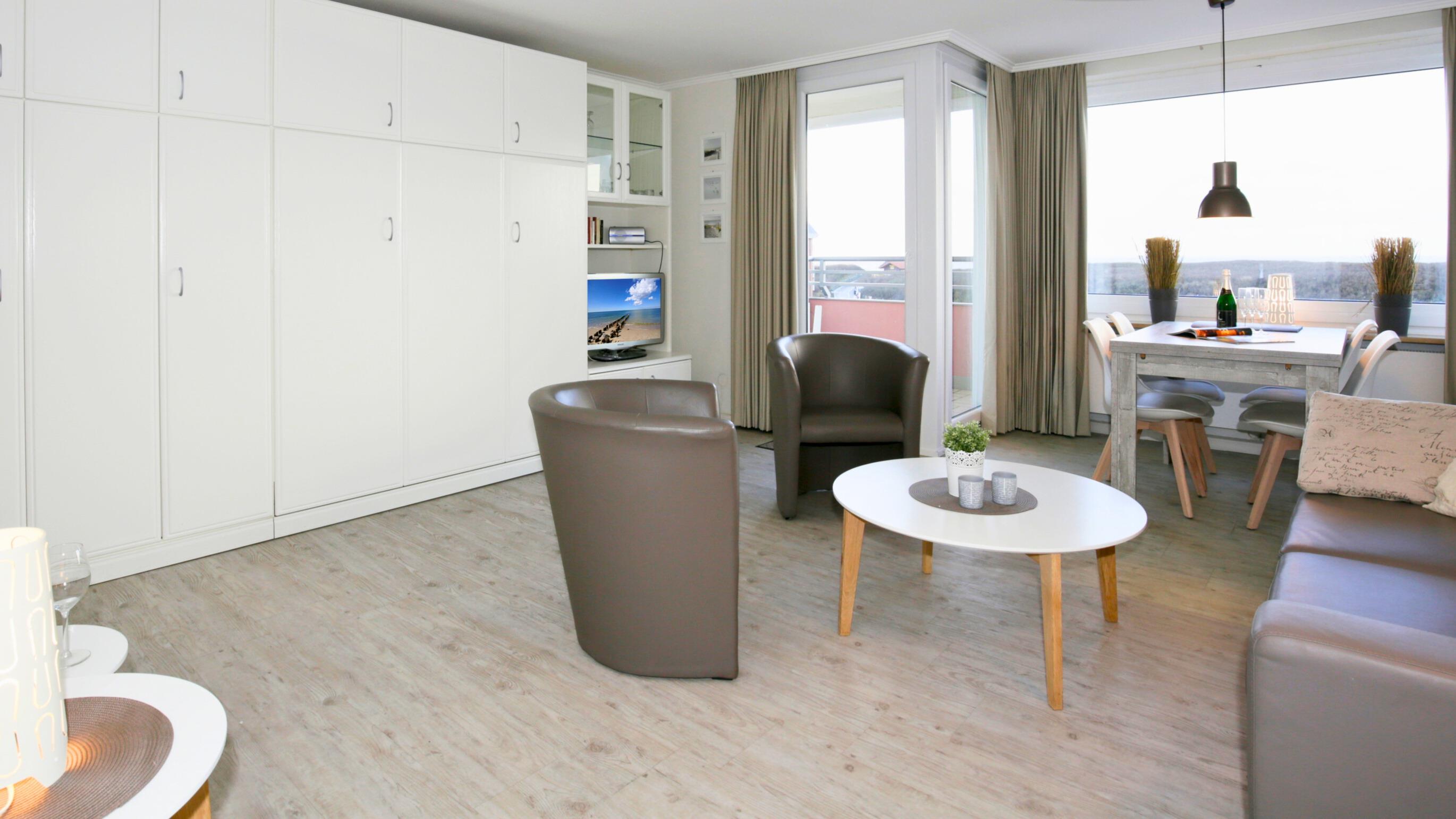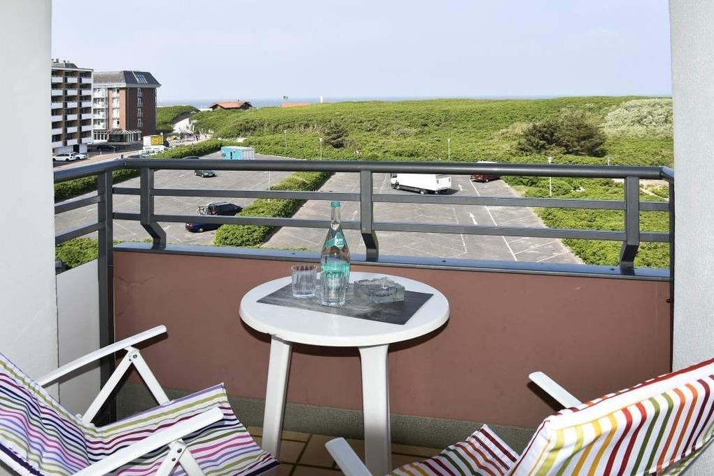 Geschmackvoll eingerichtete 2-Zimmer-Nichtraucher-Ferienwohnung, ca. 44 qm, in der 4. Etage zur Westseite für max. 4 Personen mit Westbalkon und Meerblick (Nachmittagssonne, mit Balkonmöbeln und Auflagen).
