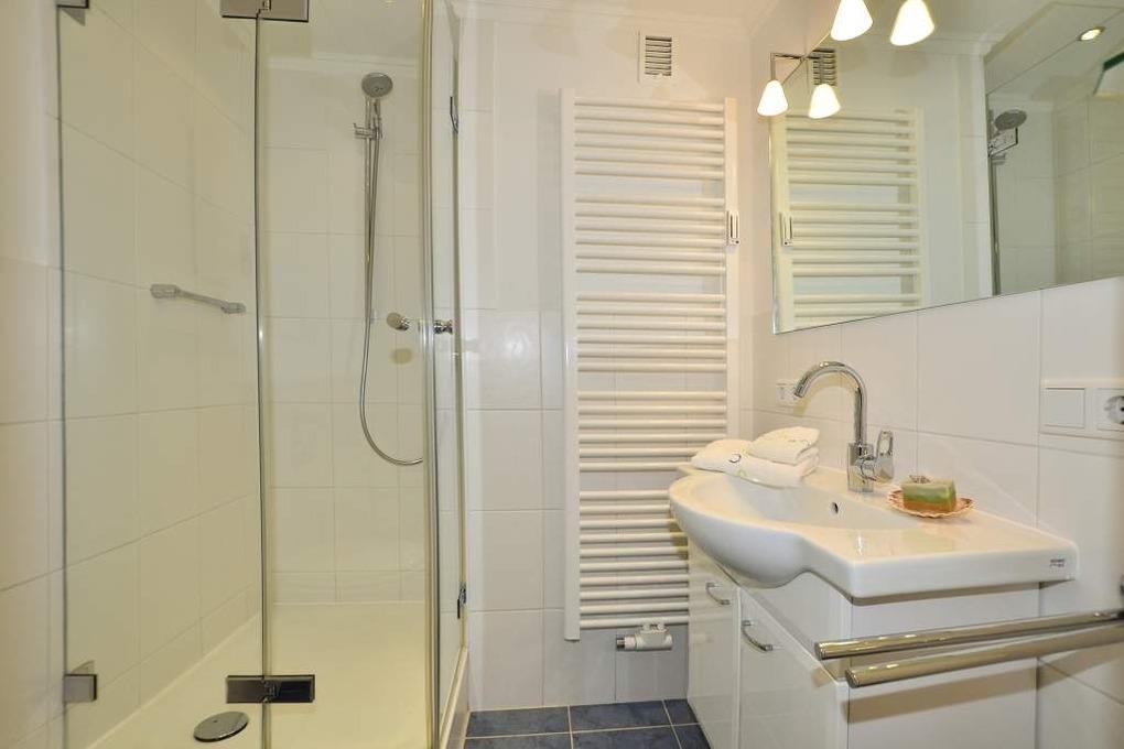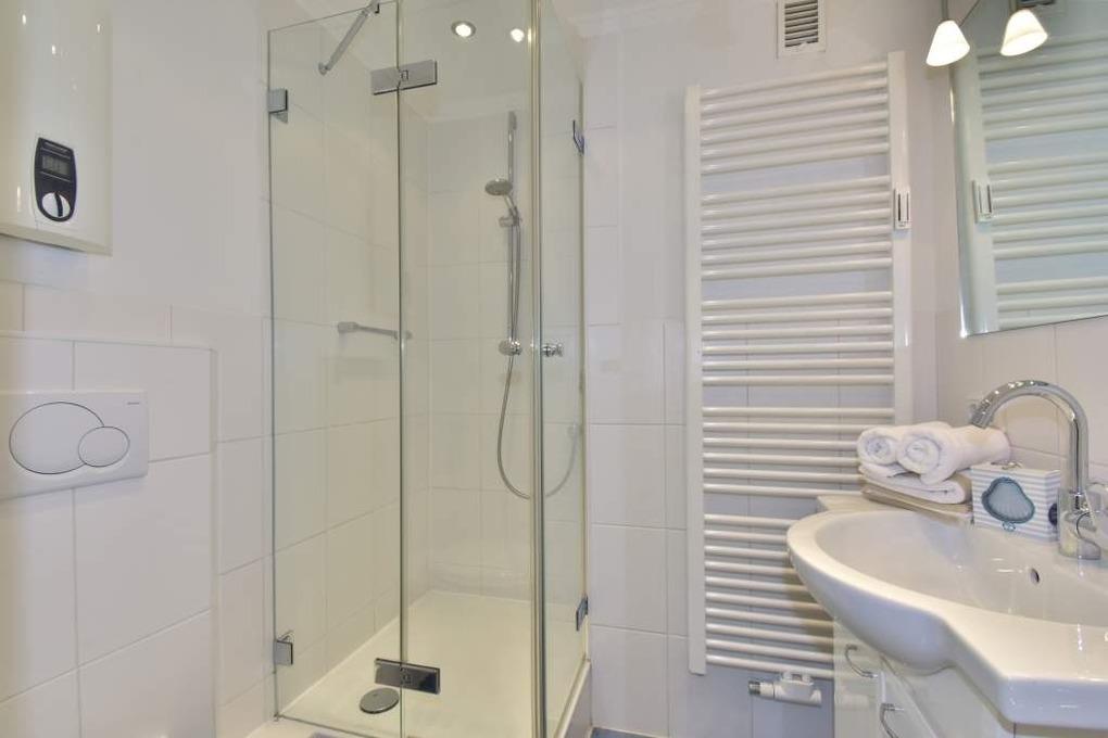 Im Bad befinden sich eine Dusche, ein WC, ein Waschtisch und ein Handtuchtrockner.