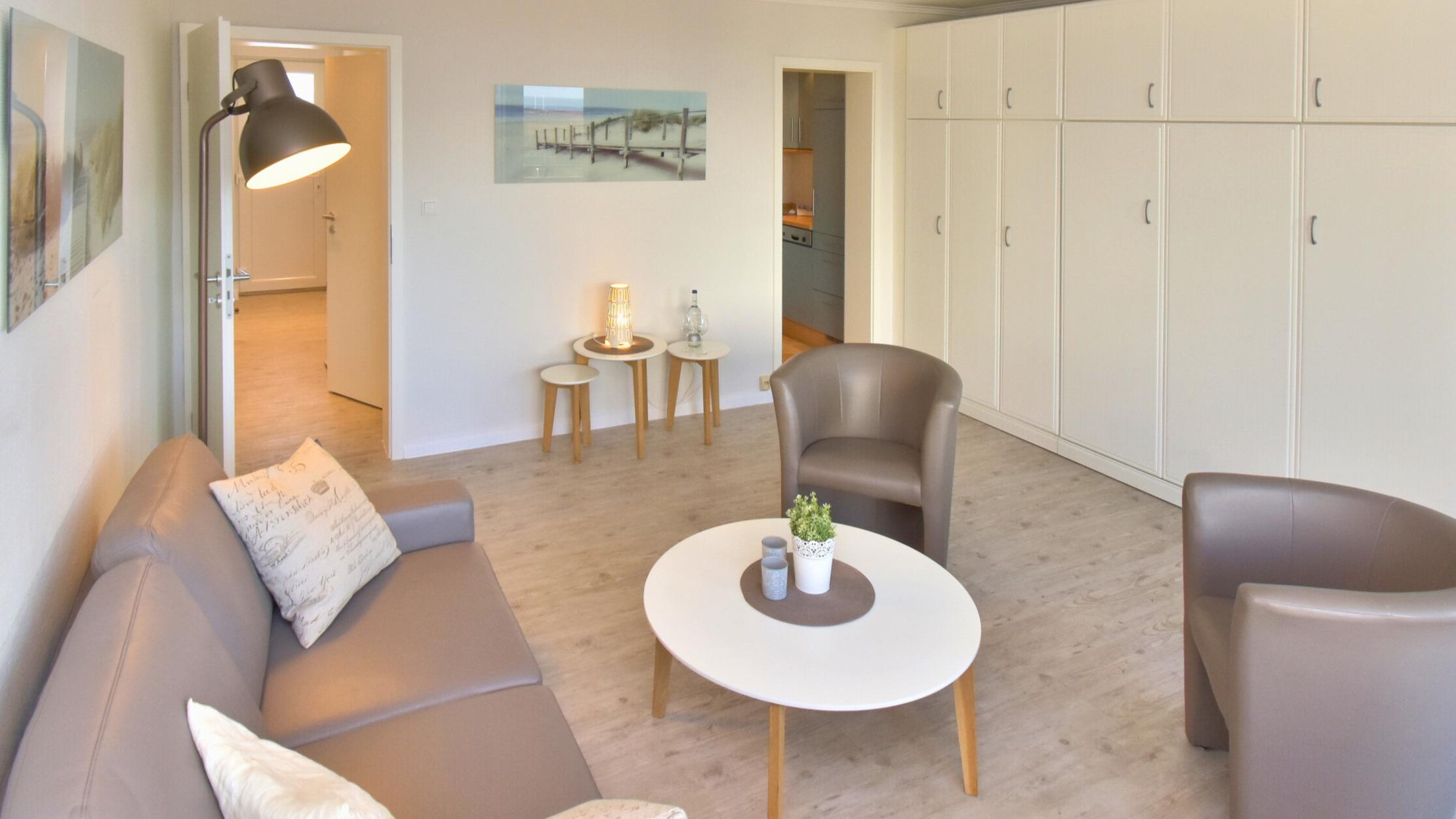 Der Wohnraum besteht aus einer Sitzecke (Zweisitzer-Couch, 2 Sessel), einem Doppelschrankbett, einem Essplatz und Kabel-TV.
