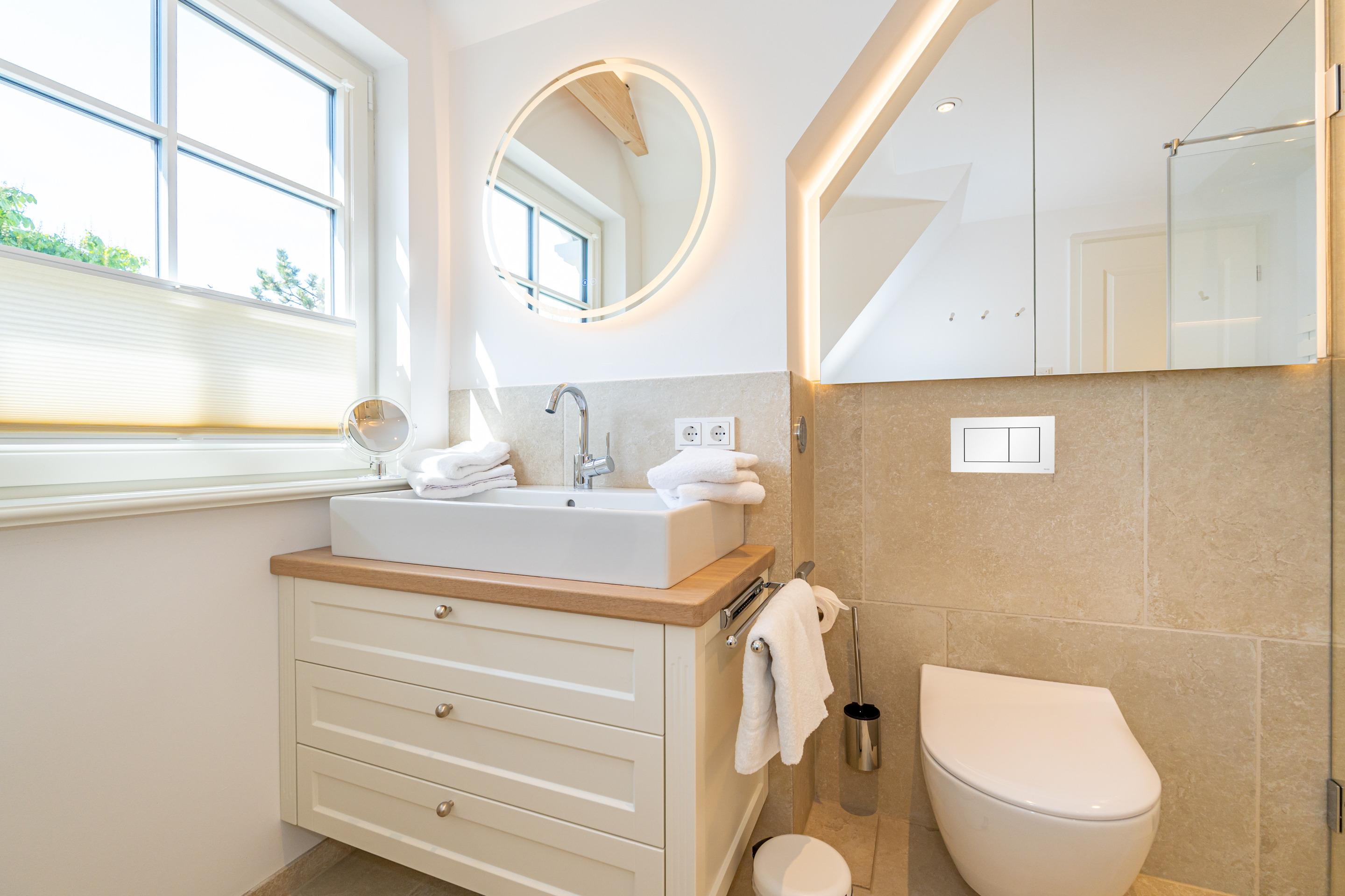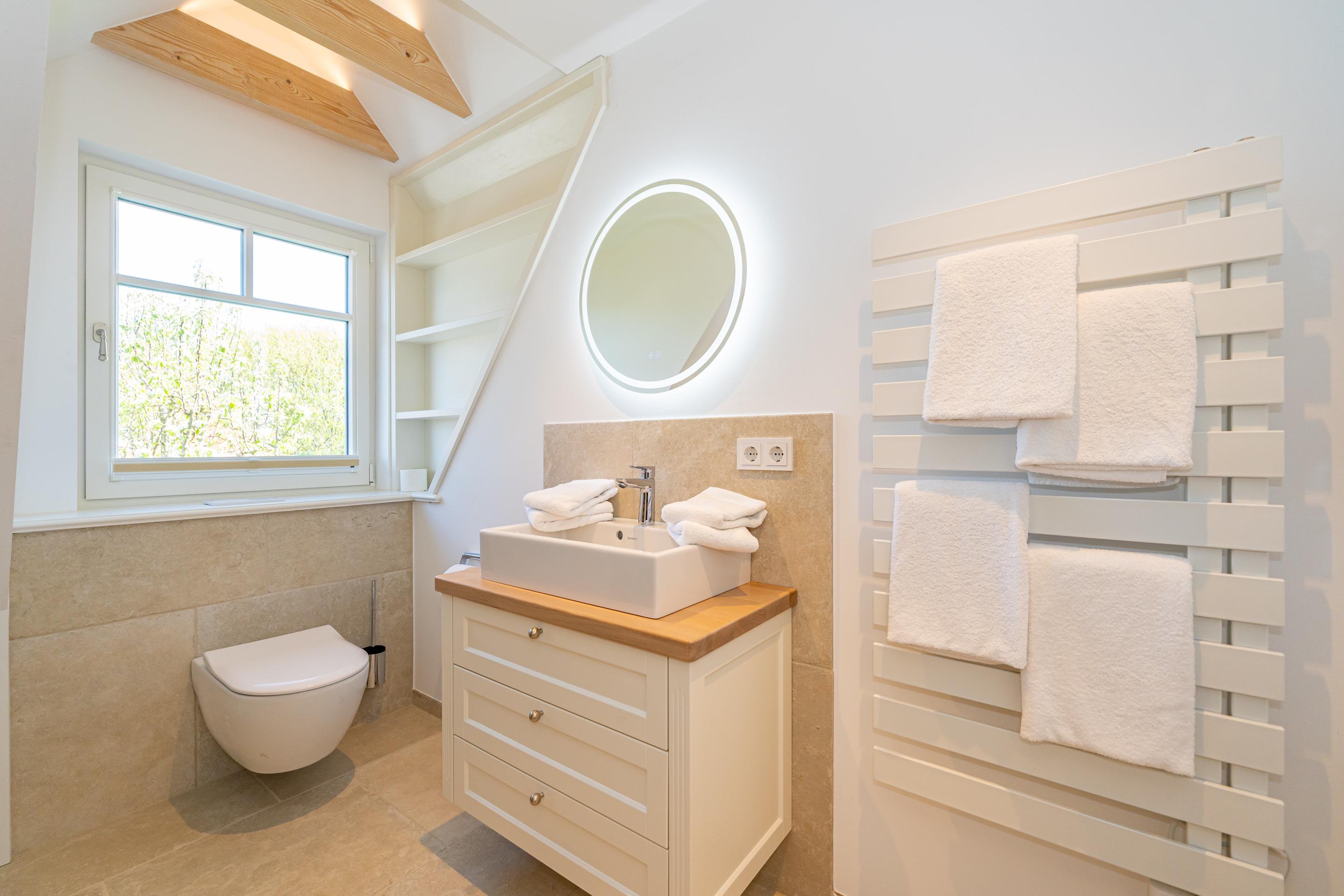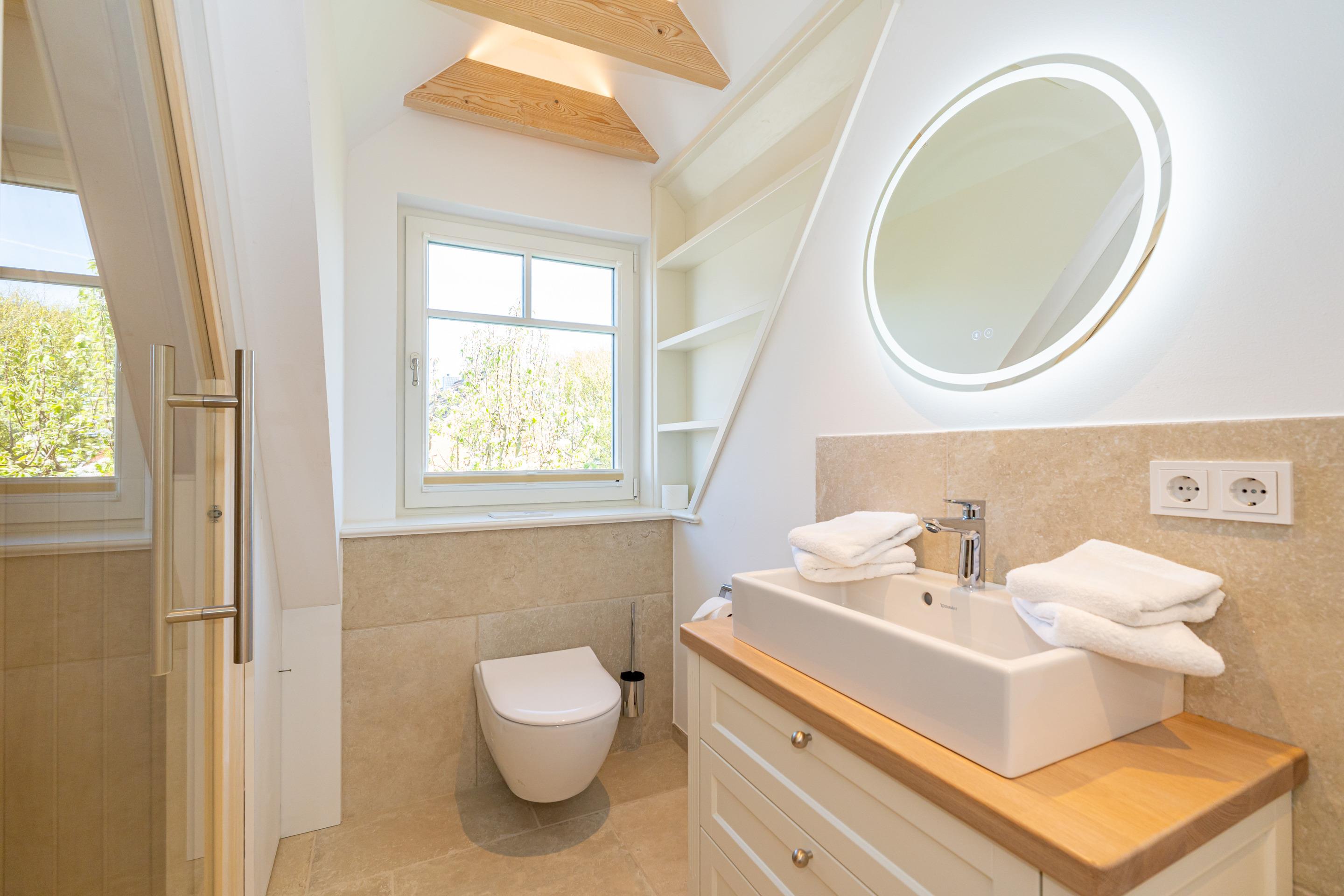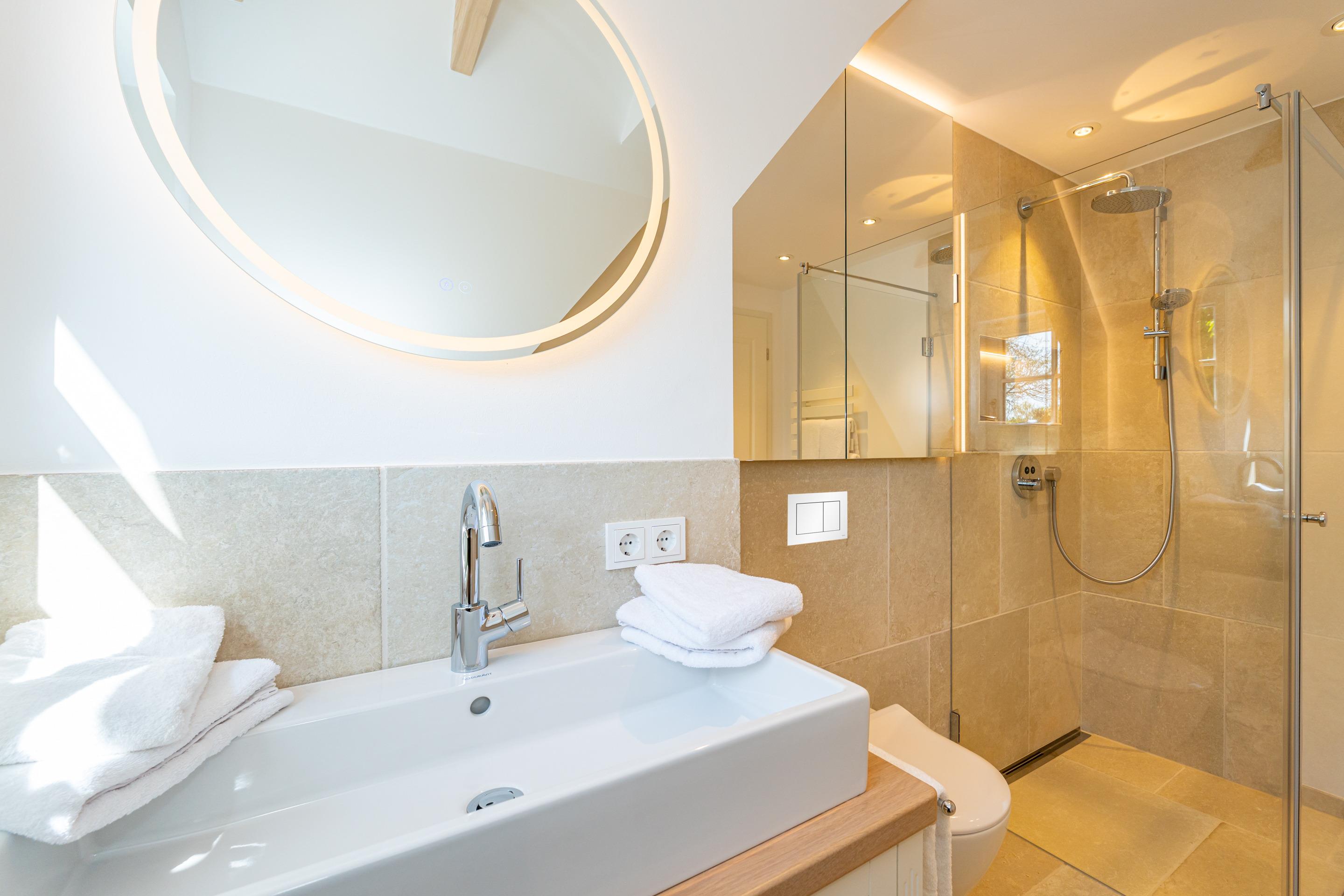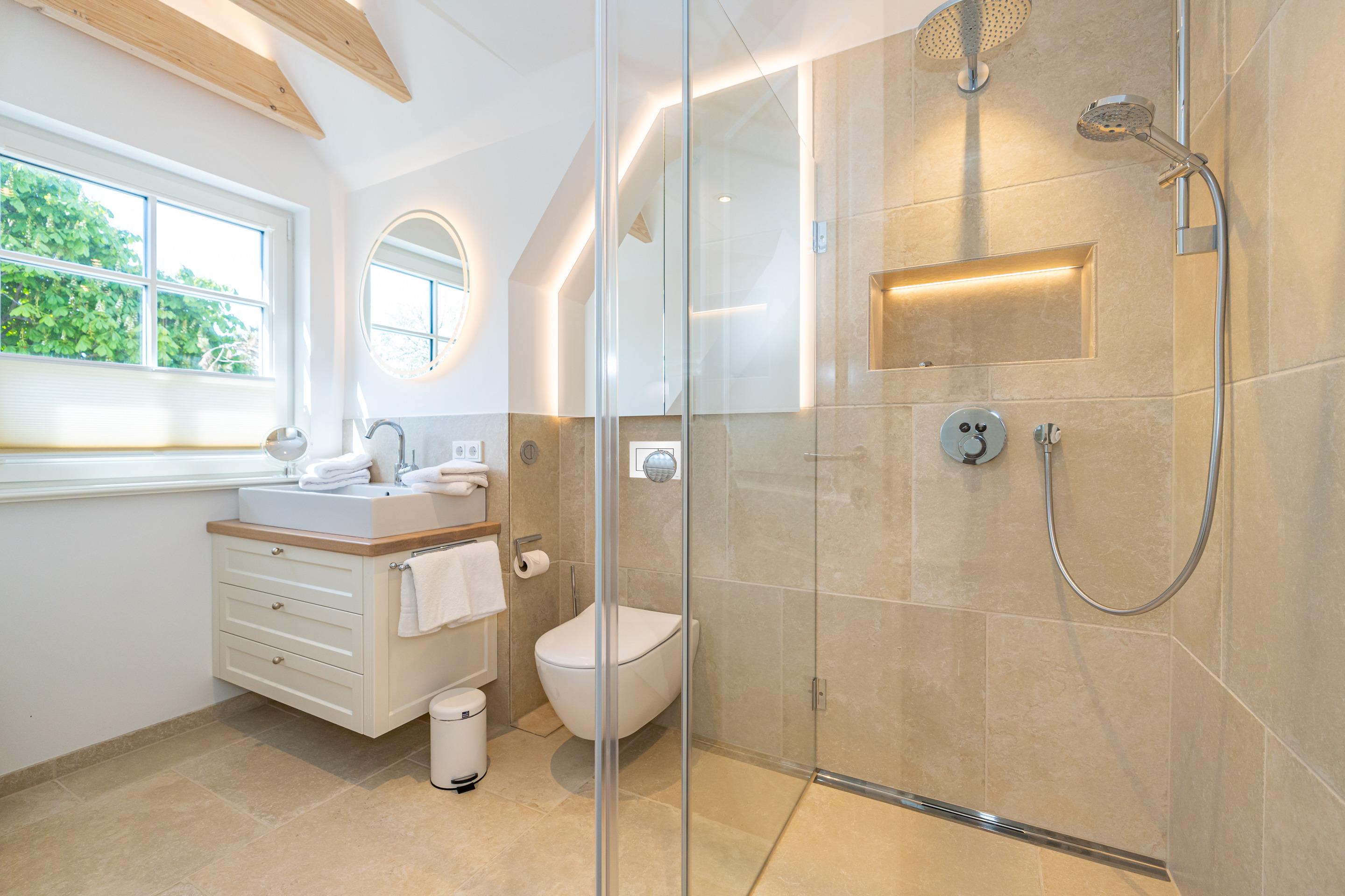 Extra-Duschbad mit bodengleicher Dusche, Waschtisch, Handtuchwärmer, Haartrockner, Kosmetikspiegel, WC, Außenfenster und Infrarotsauna -für entspannte Momente