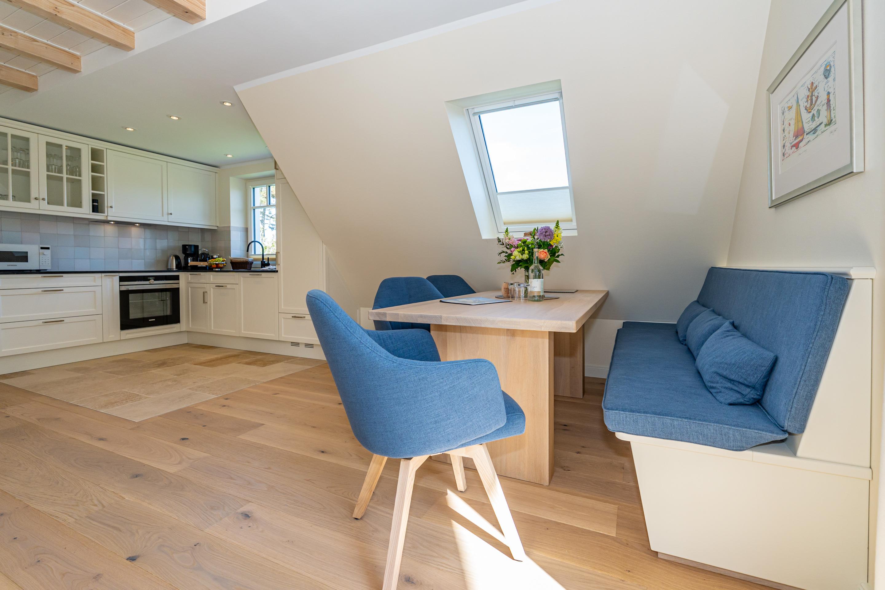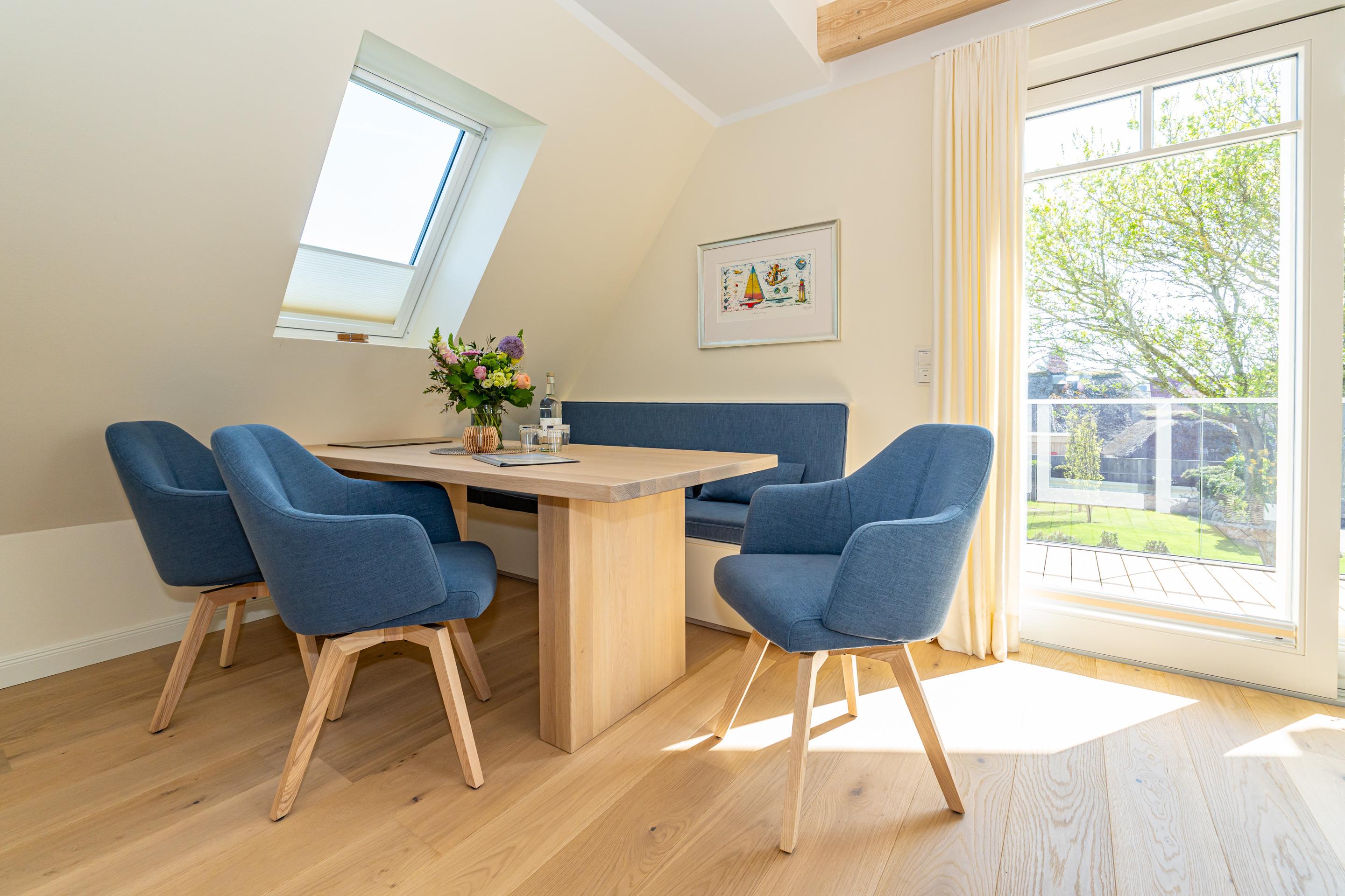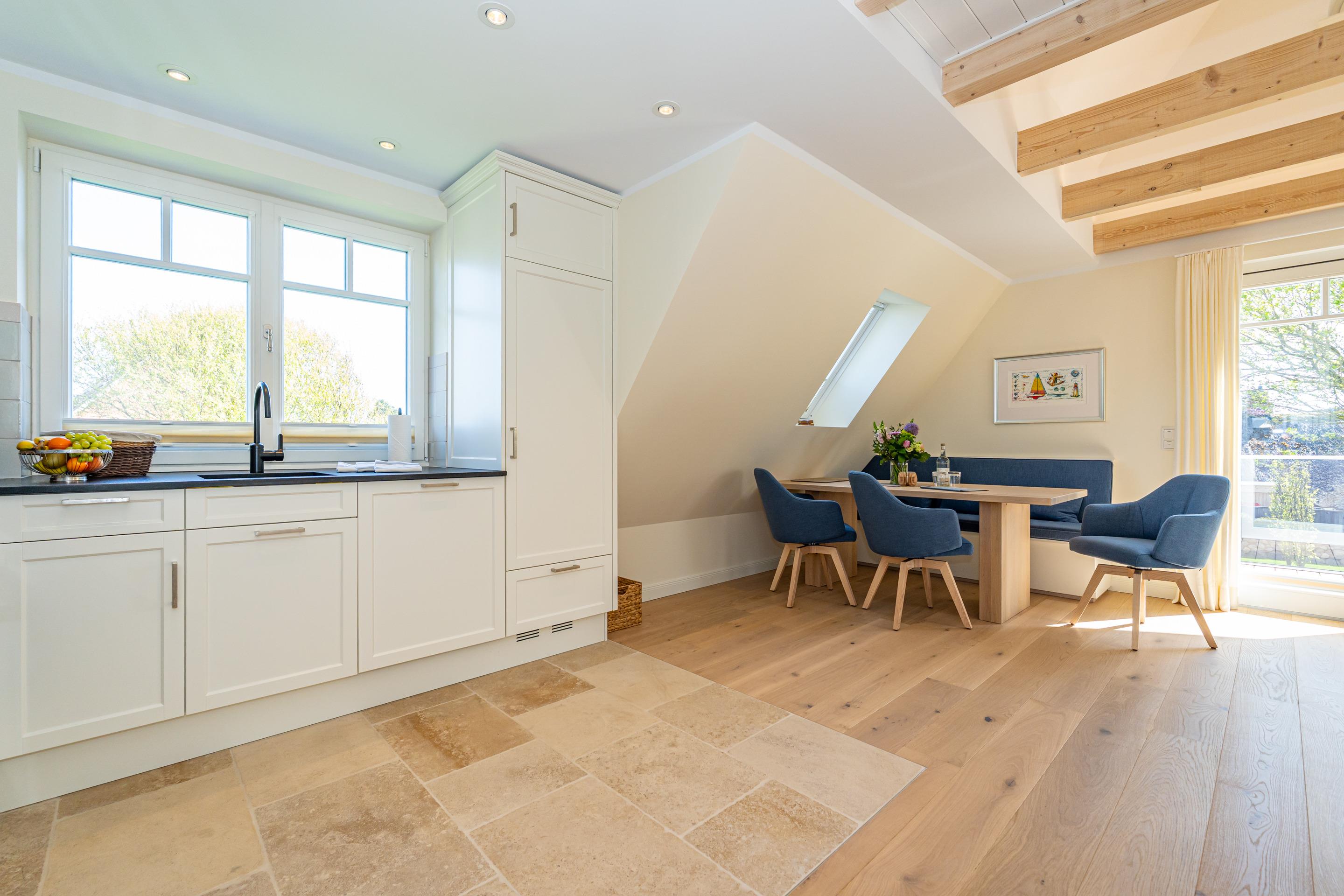 großzügiger Wohn-/Essbereich mit offener Küche, großzügiger Essplatz für bis zu 6 Personen mit direktem Zugang zur 10 m² großen Süd-Loggia inklusive Strandkorb und Sitzecke - ideal für entspannte Stunden an der frischen Nordseeluft