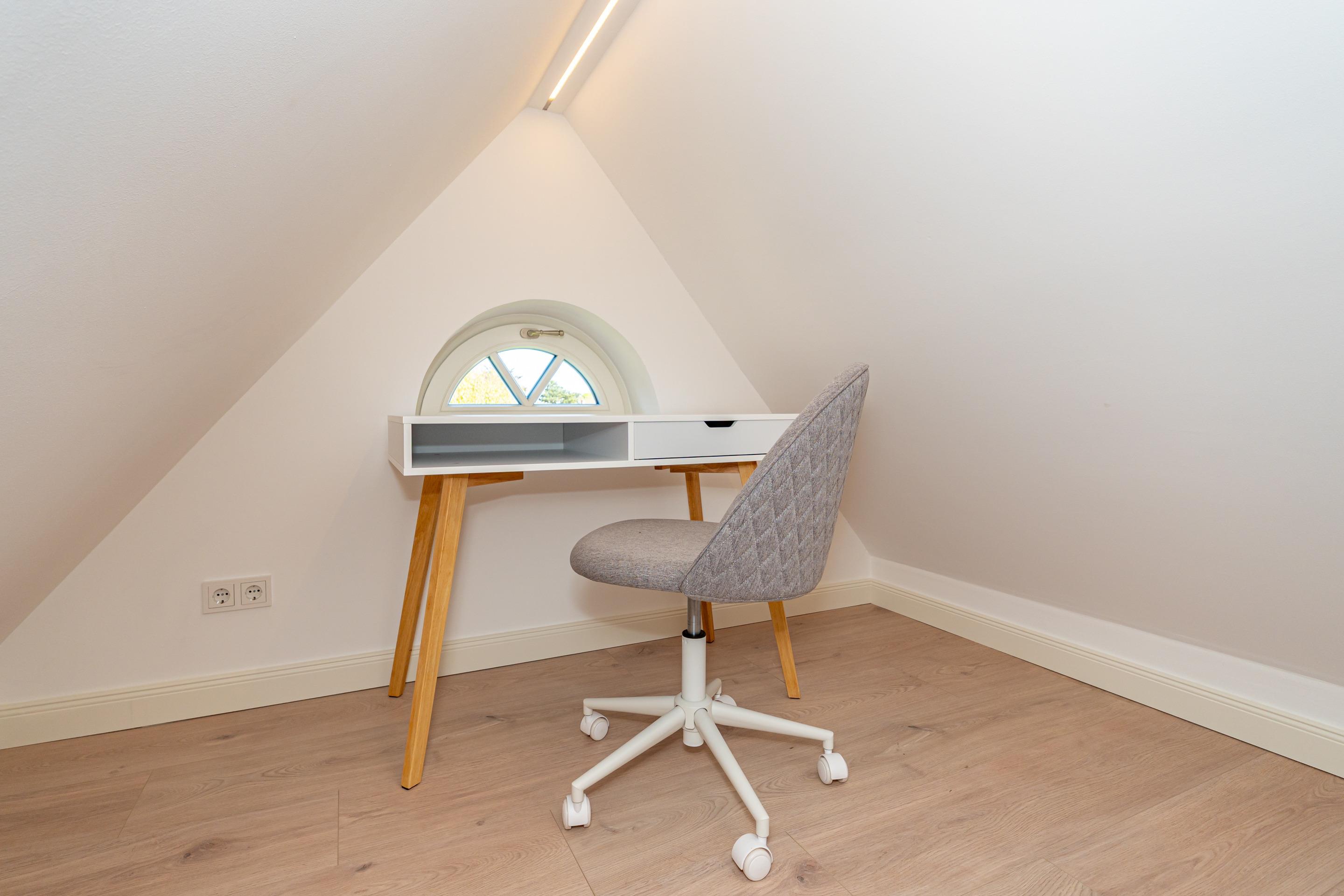 Galerie mit zwei Einzelbetten (200x 90 cm), Kuschelecke, Arbeitsplatz, kleines Bad mit WC und Waschbecken und Außenfenster