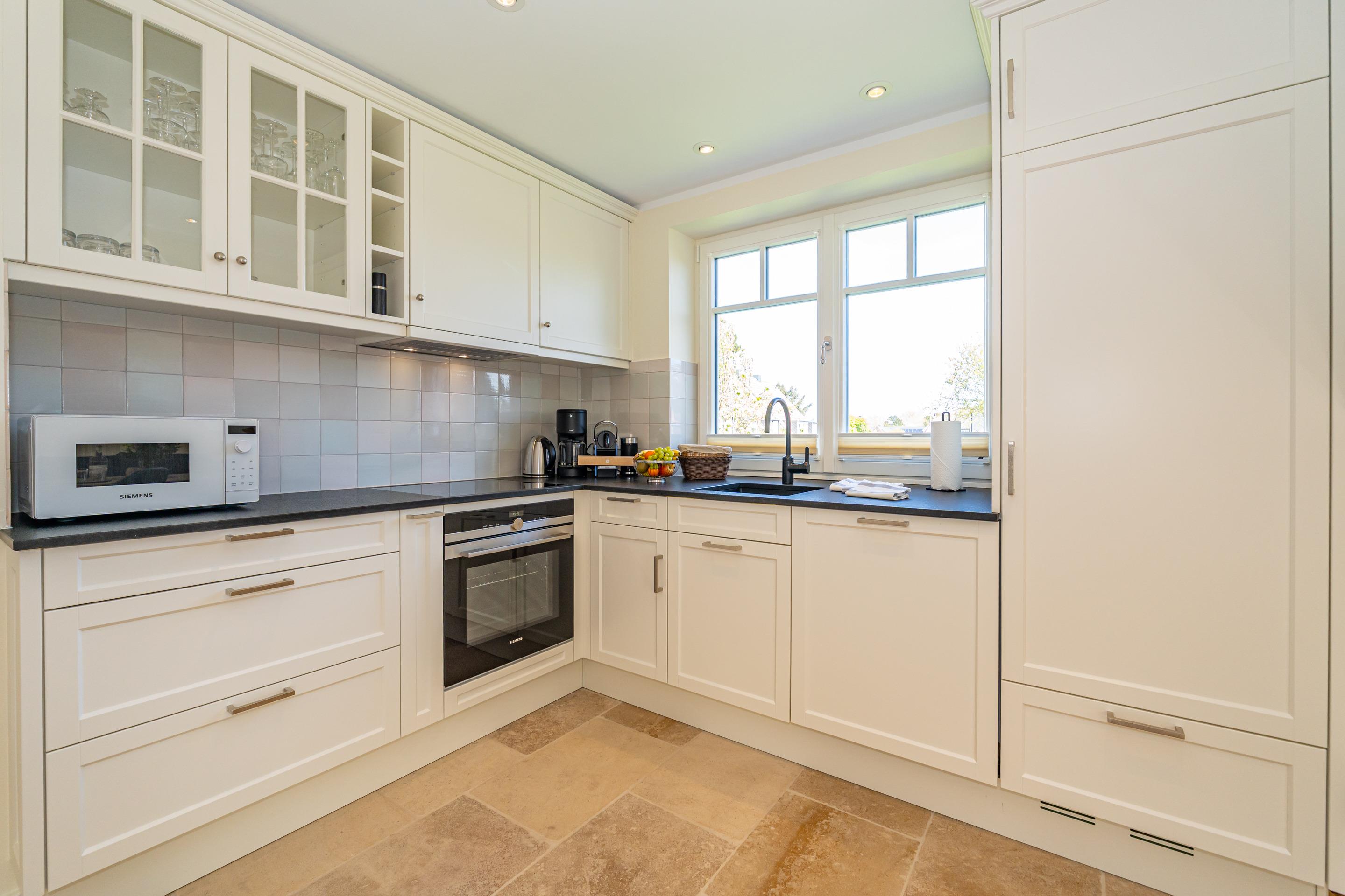 Einbauküche mit Kücheninsel und Naturstein-Arbeitsplatte mit moderner Vollausstattung (Geschirrspülmaschine, Induktionsherd, Backofen, Mikrowelle, WMF-Kaffeemaschine und Nespresso-maschine, WMF-Wasserkocher, Toaster, Eierkocher, "Zauberstab"