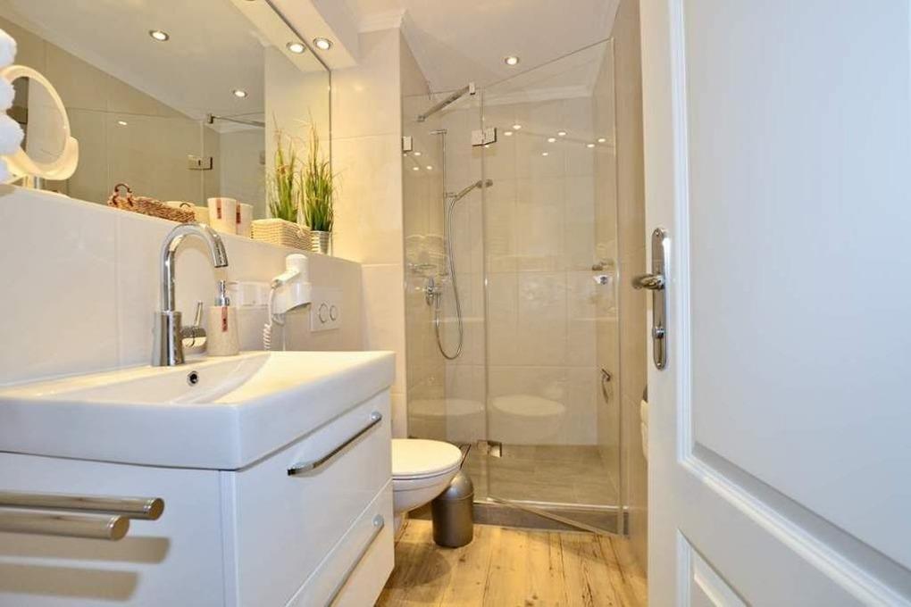 Im Bad befinden sich eine Dusche, ein WC, ein Waschtisch und ein Handtuchtrockner.