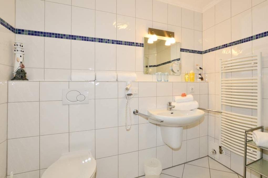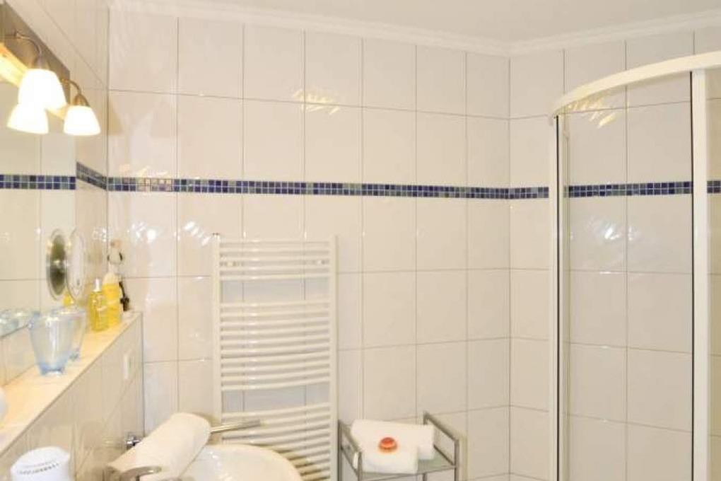 Das ebenfalls komplett sanierte Badezimmer besitzt eine bodentiefe Dusche mit moderner Hand- und Kopfbrause, Waschtisch, Handtuchtrockner, Fön, Kosmetikspiegel, WC.