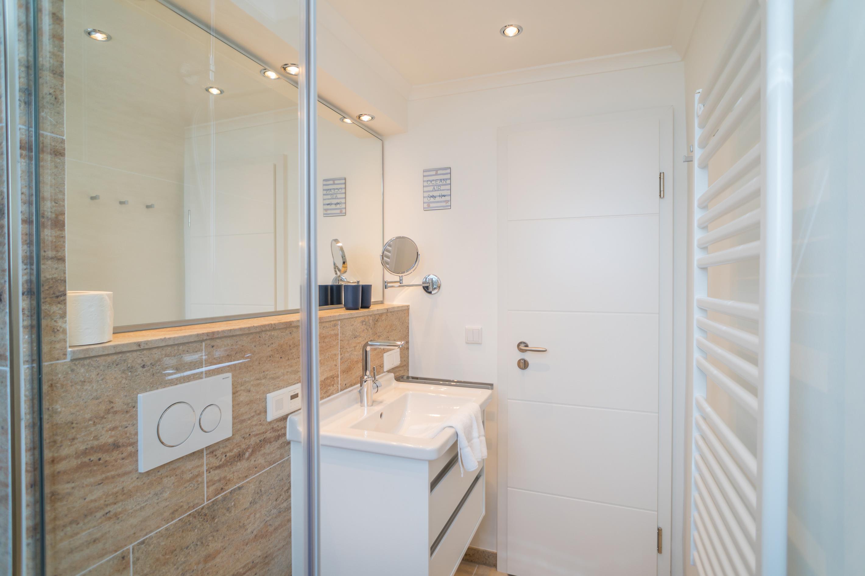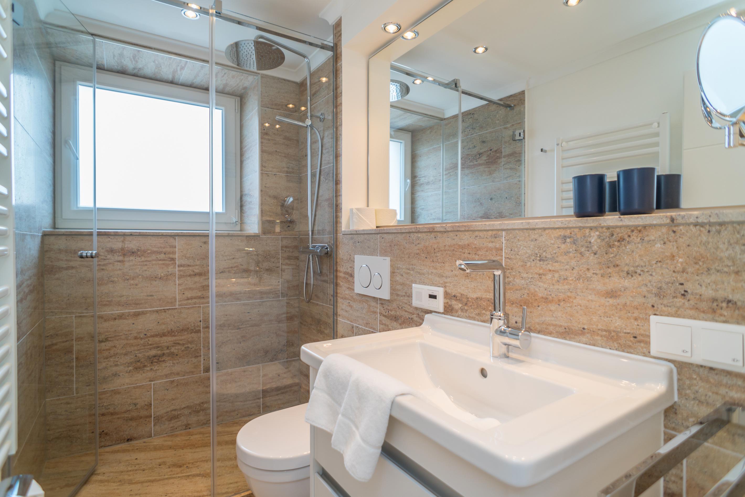 Im Bad befinden sich eine Dusche, ein WC, ein Waschtisch, ein Handtuchtrockner und ein Fenster.