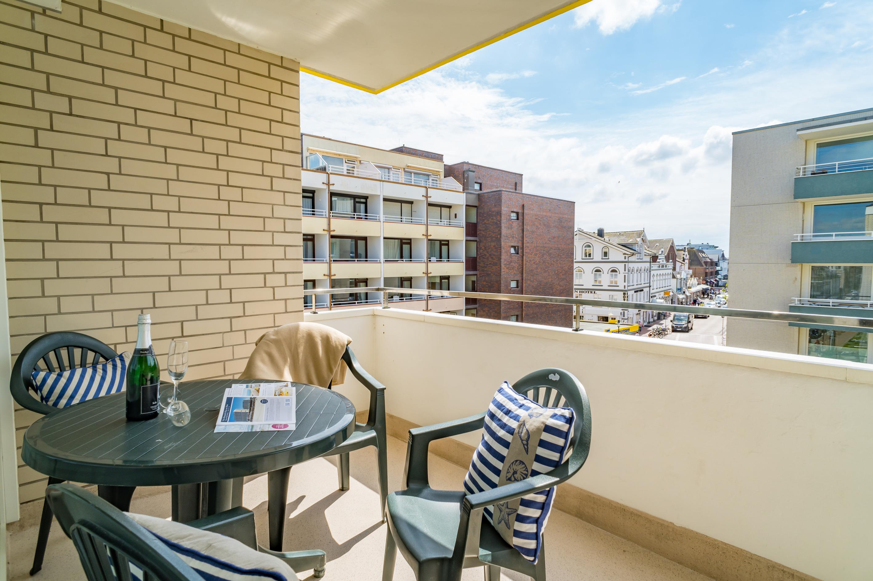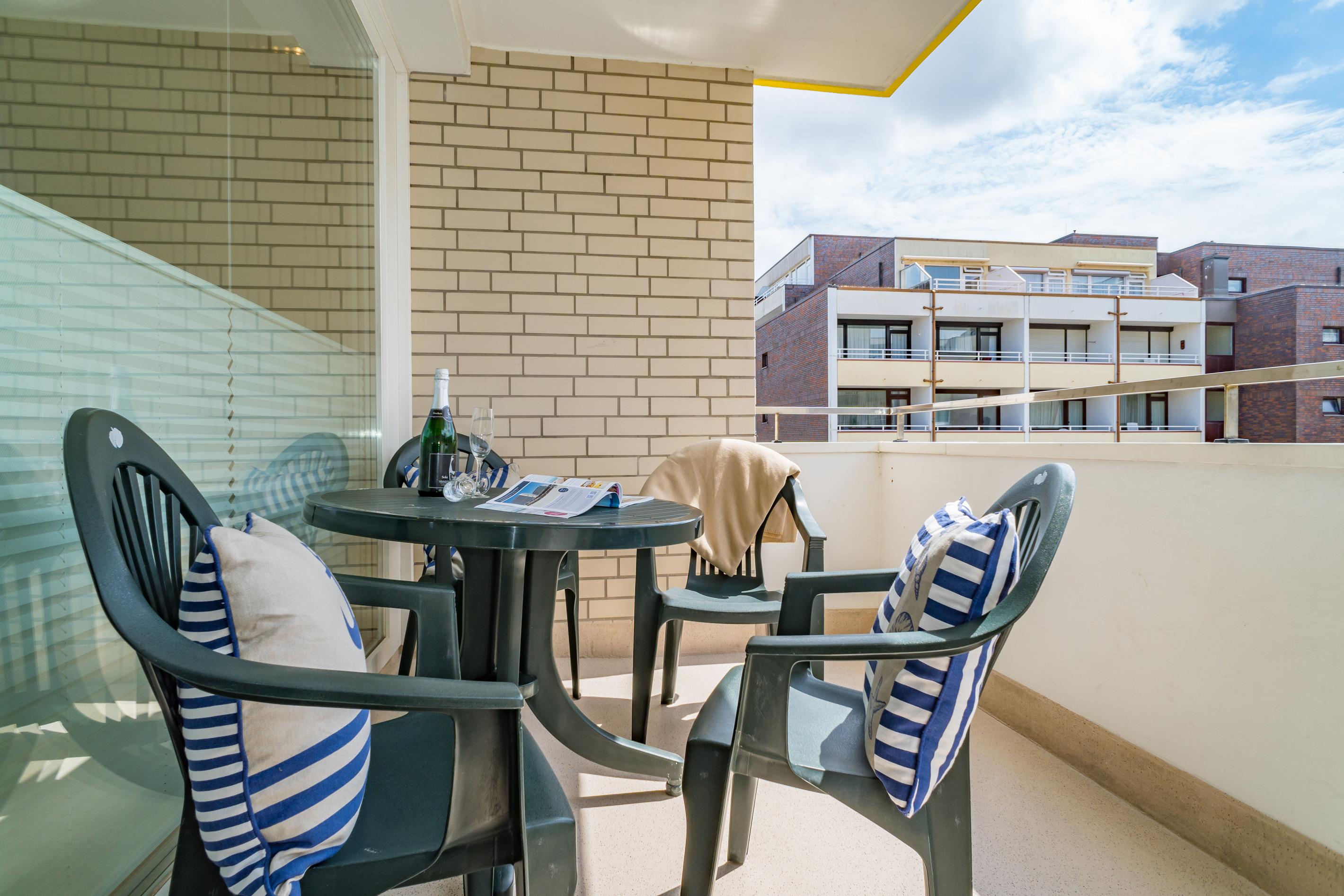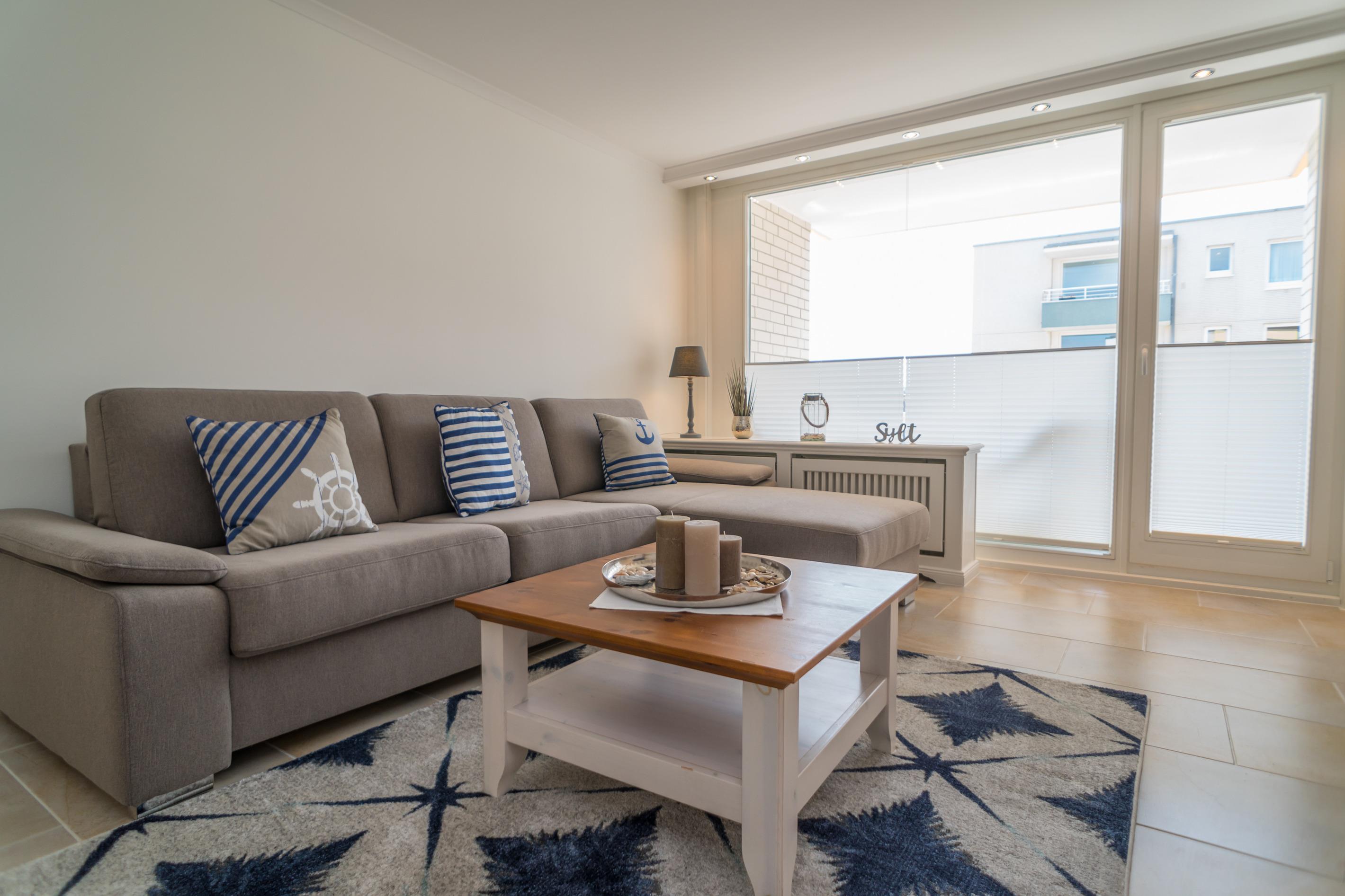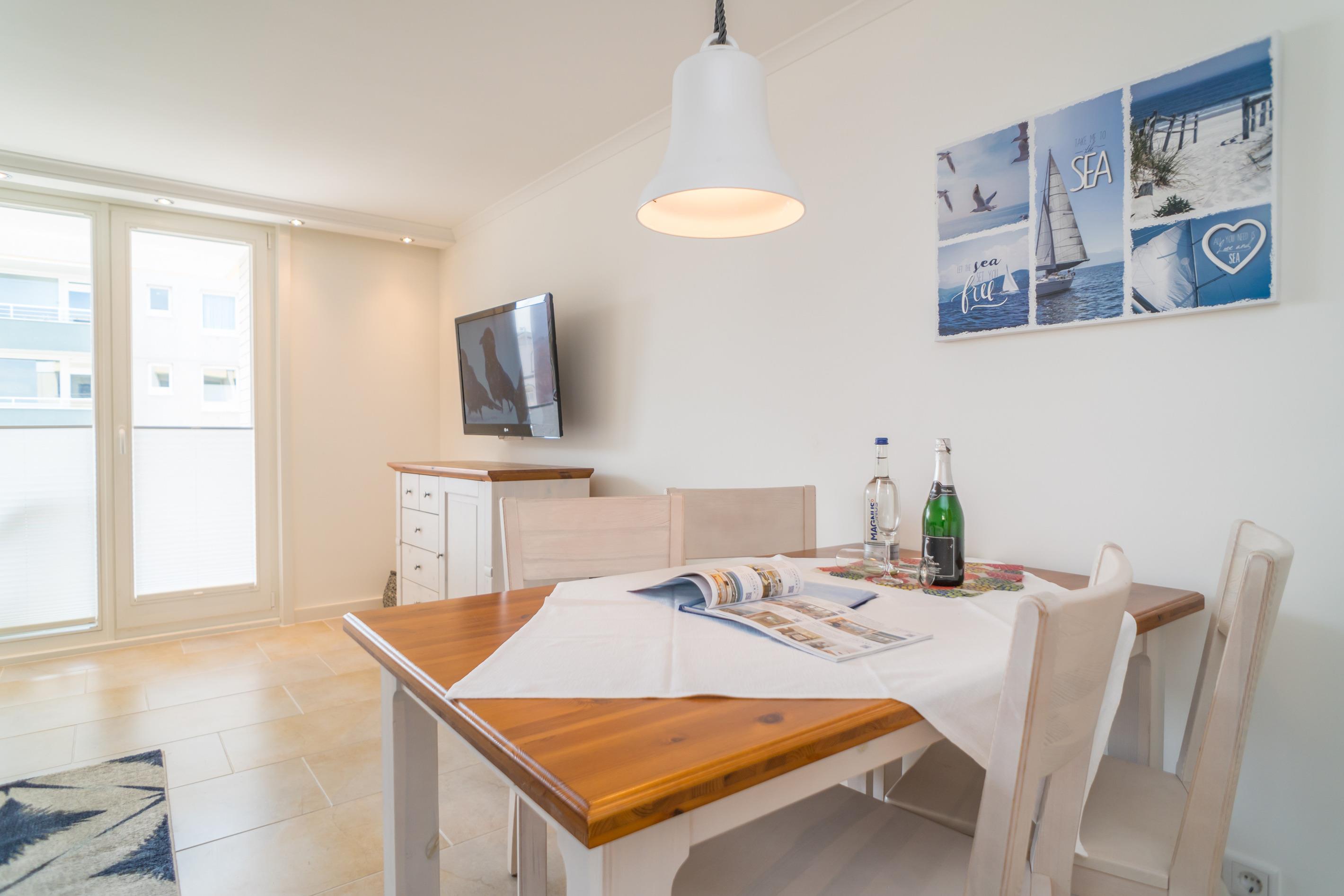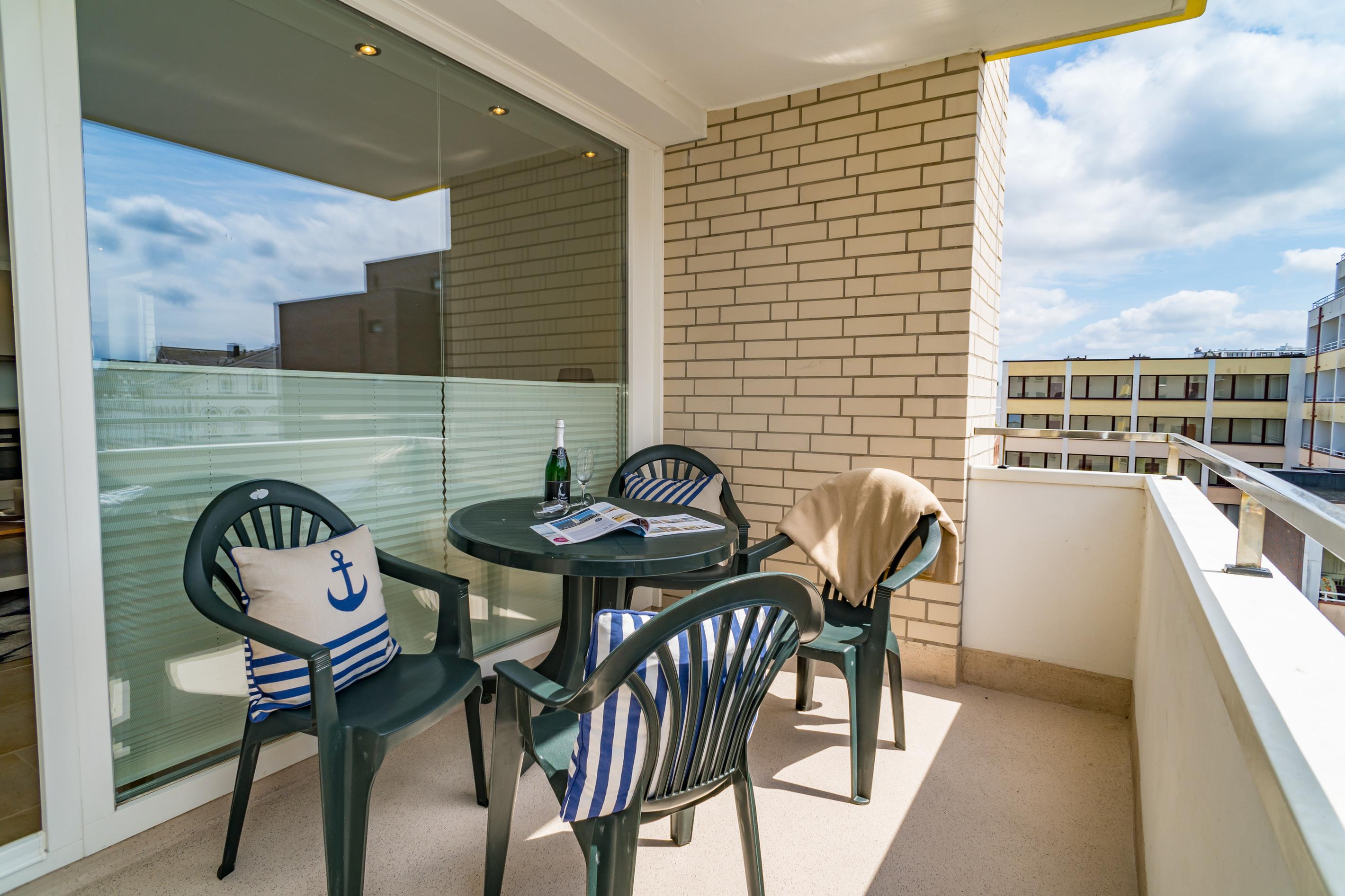 Hell und freundlich eingerichtete 2-Zimmer-Nichtraucher-Ferienwohnung (ca. 56 m²), 2020 renoviert, in der 3. Etage zur Südseite mit Südbalkon (mit Balkonmöbeln und Auflagen) für max. 4 Personen.