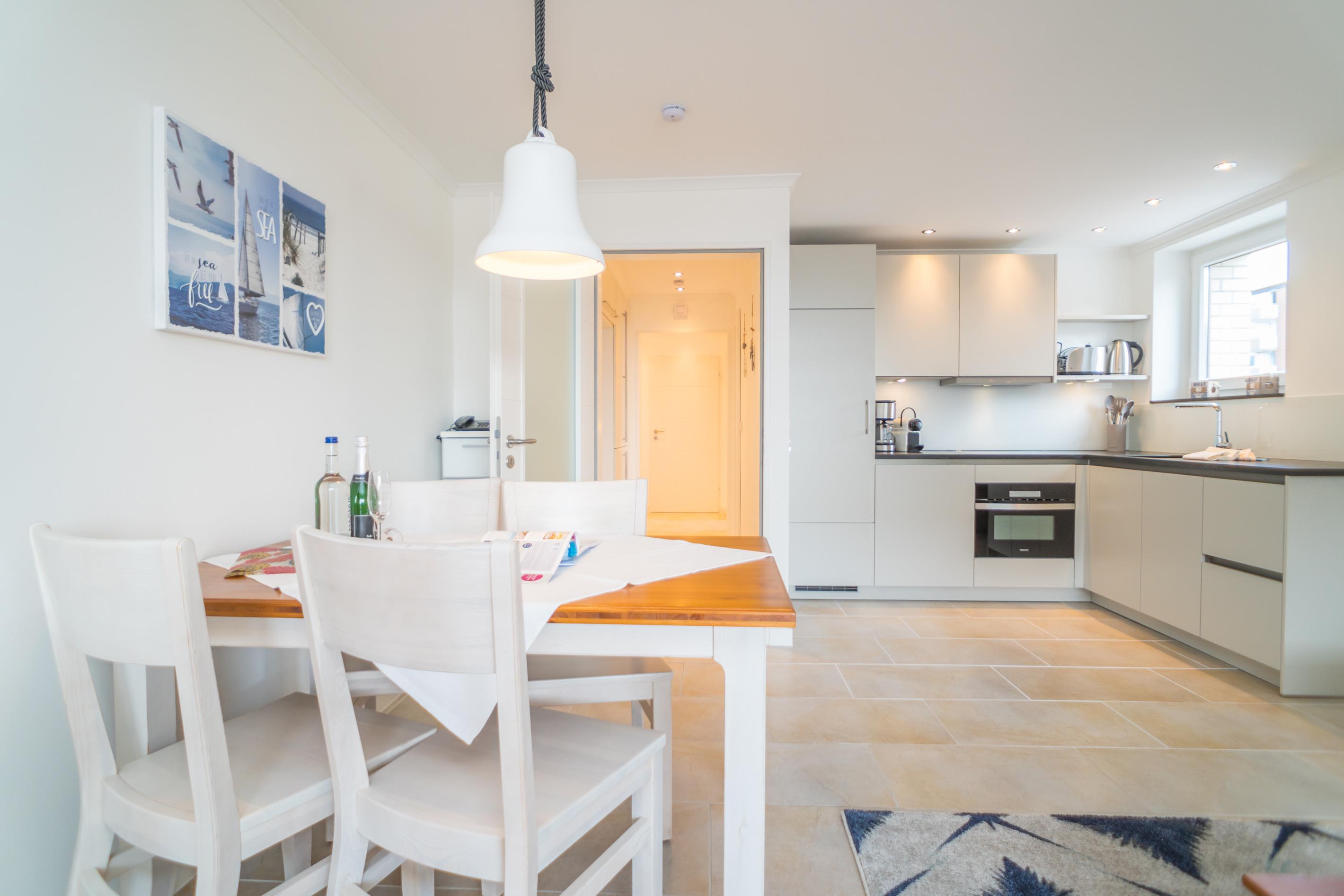 Die separate Küche hat ein Fenster, einen Herd mit Mikrowellenkombi und ein 4-Platten-Kochfeld, einen Geschirrspüler und einen Kühlschrank mit 3*-Gefrierfach. Kaffeemaschine, Nespresso-Maschine, Wasserkocher und Toaster gehören zur Grundausstattung.