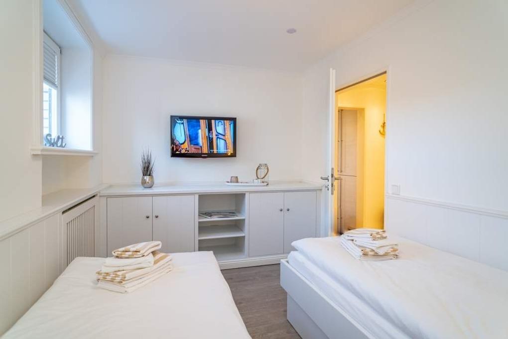 Das Schlafzimmer ist mit zwei auseinander stehenden Einzelbetten und einem Flachbild-TV ausgestattet.