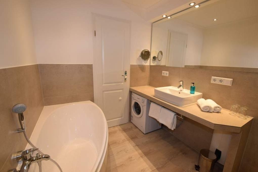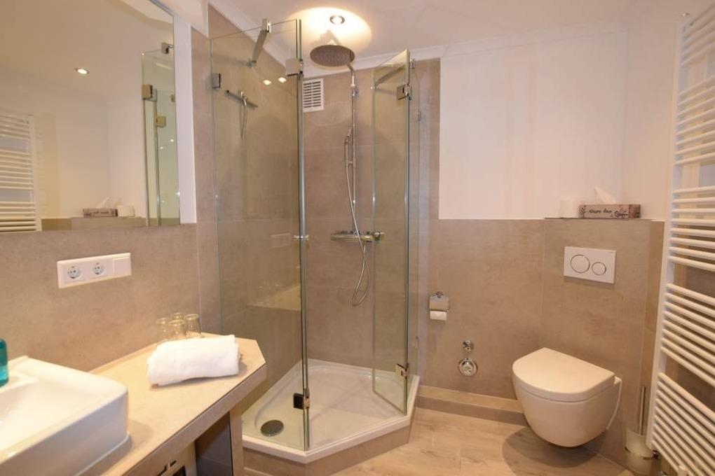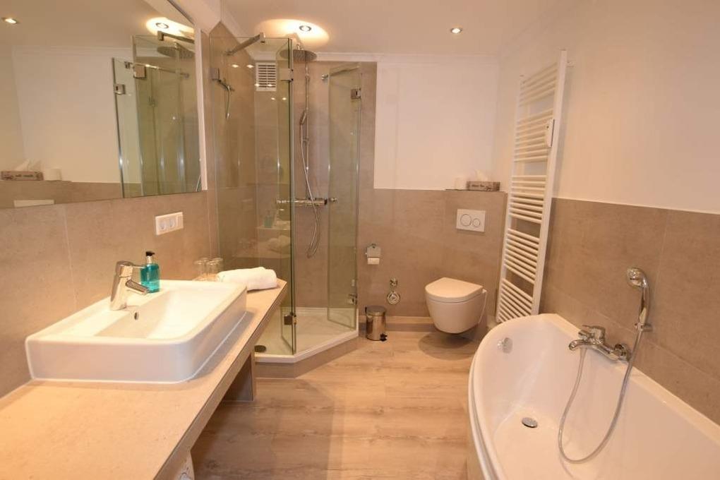 Das Schlafzimmer ist mit einem komfortablen Boxspring-Doppelbett (Liegefläche 1,80 x 2,00m, Einzelmatratzen) ausgestattet. Auf Wunsch kann das Bett in zwei Einzelbetten umgewandelt werden. Im neuen, großzügigen Badezimmer befinden sich eine Dusche mit extra flachem Einstieg, zusätzlich eine kleine Badewanne, ein Waschtisch, ein Handtuchtrockner, sowie WC.