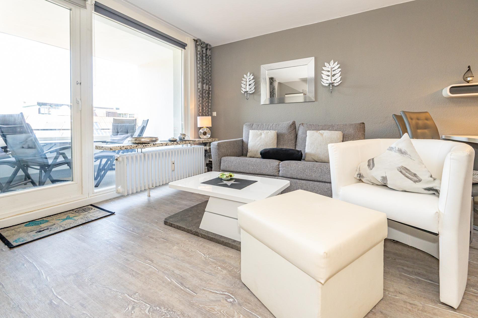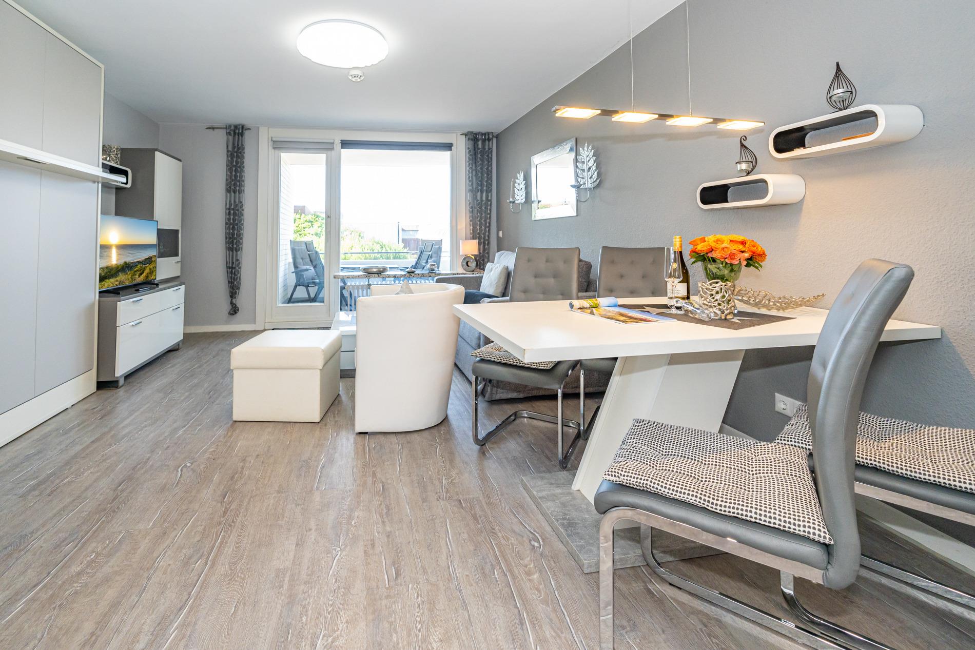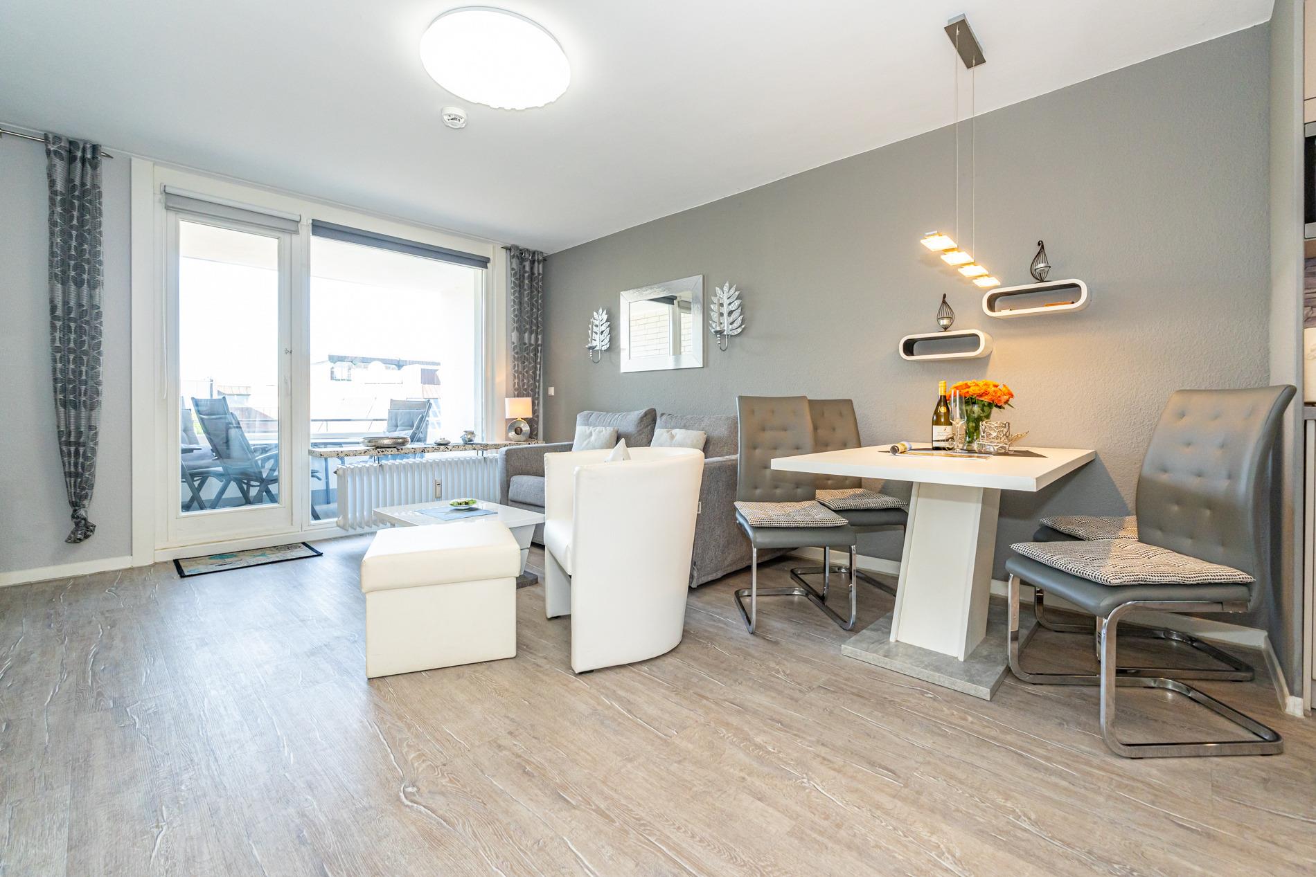 Die moderne 2-Zimmer-Nichtraucher-Ferienwohnung, hat ca. 44 m² und liegt in der 1. Etage zur Seeseite mit Westloggia (Nachmittagssonne, mit Balkonmöbeln und Auflagen) und bietet Platz bis zu 4 Personen.