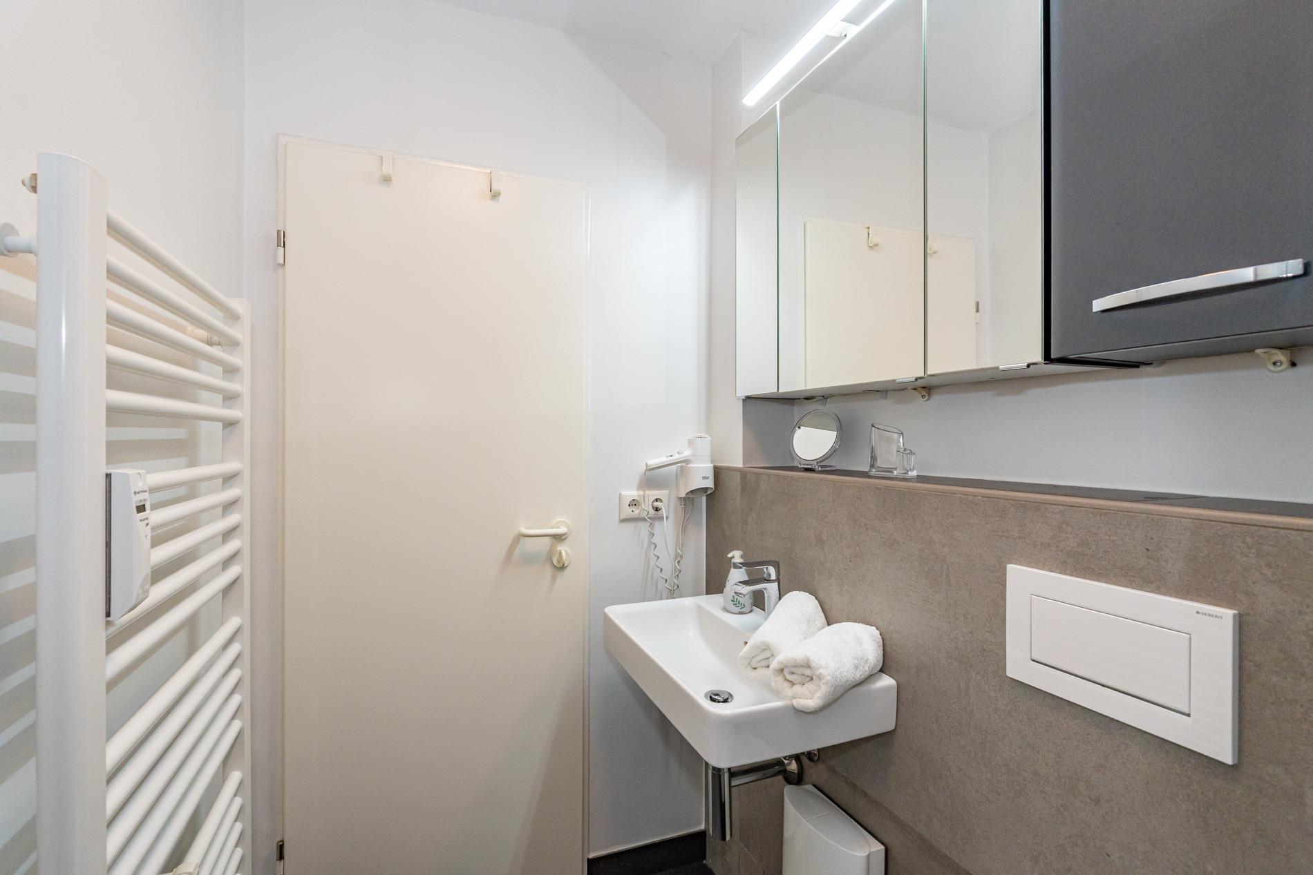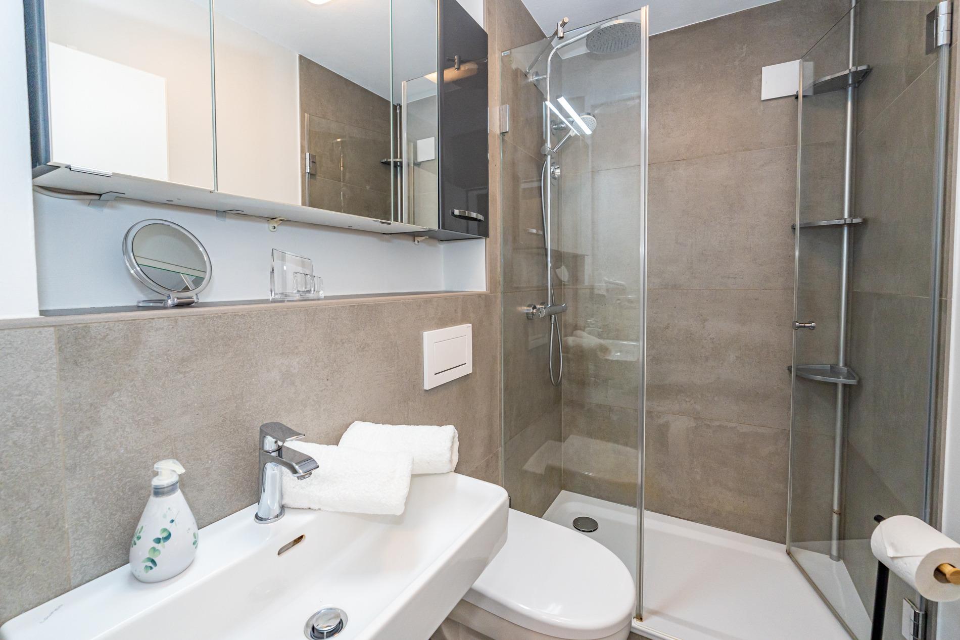 Das moderne Badezimmer ist mit Dusche, Waschtisch, Handtuchtrockner, Fön, Kosmetikspiegel und WC komplett ausgestattet.