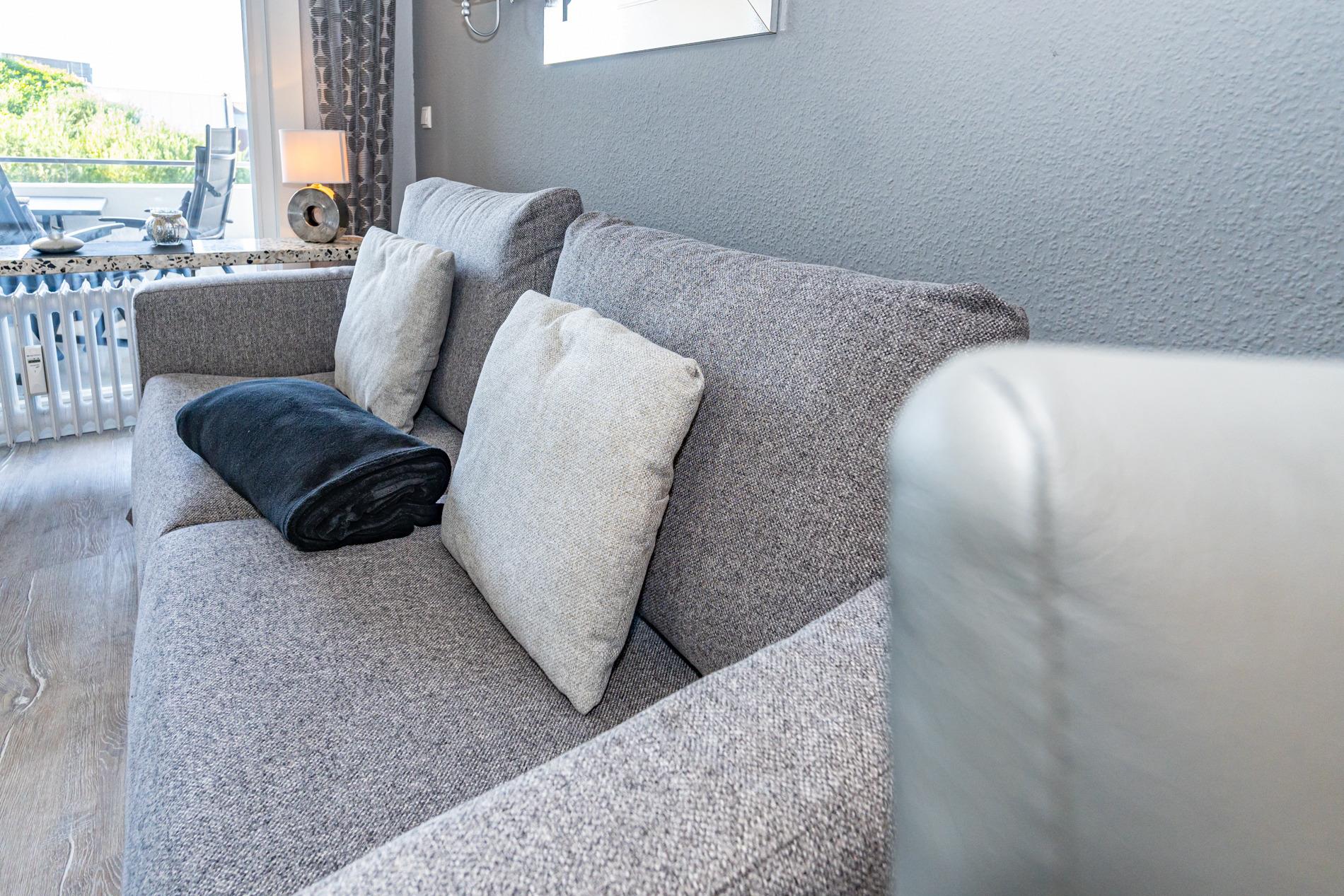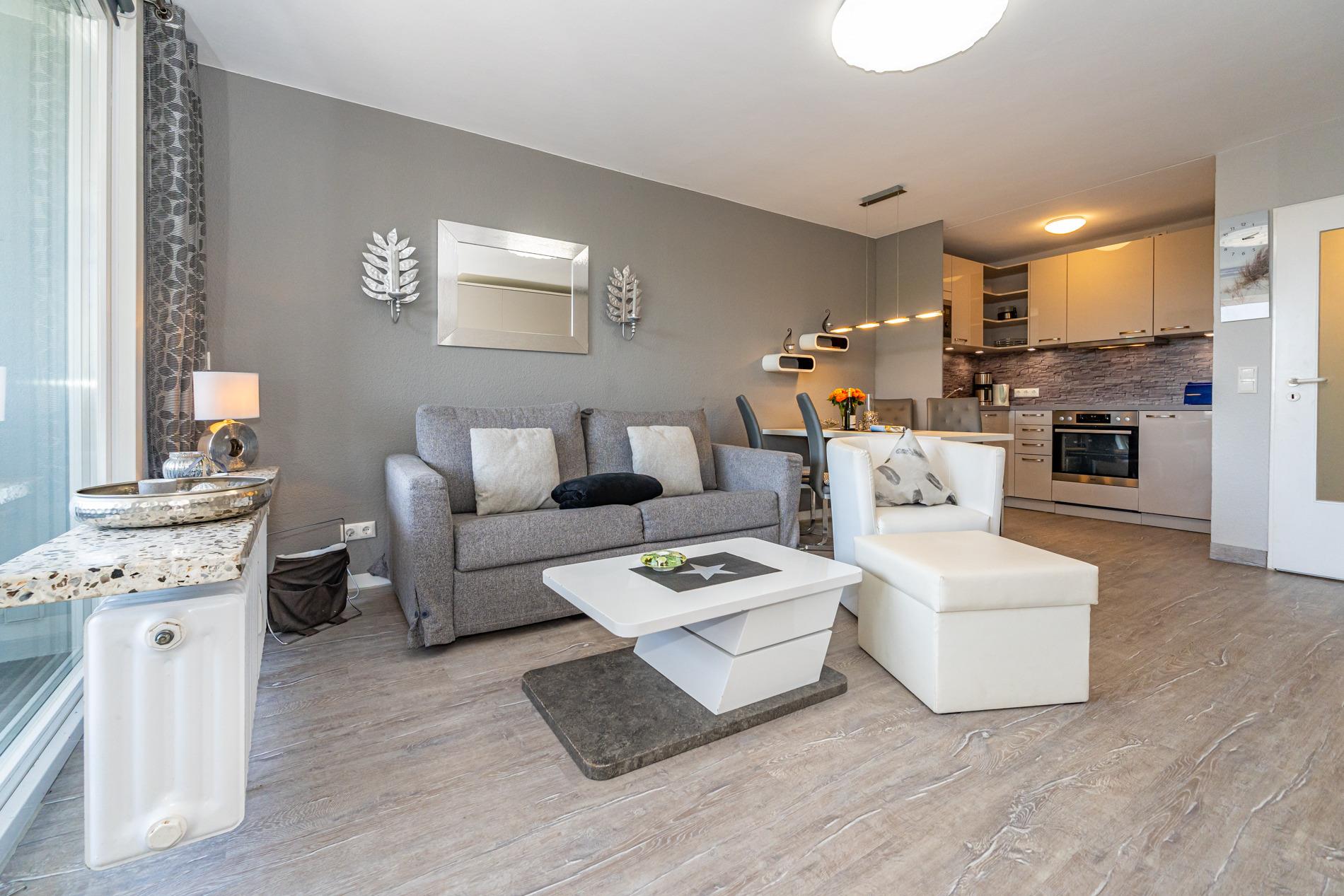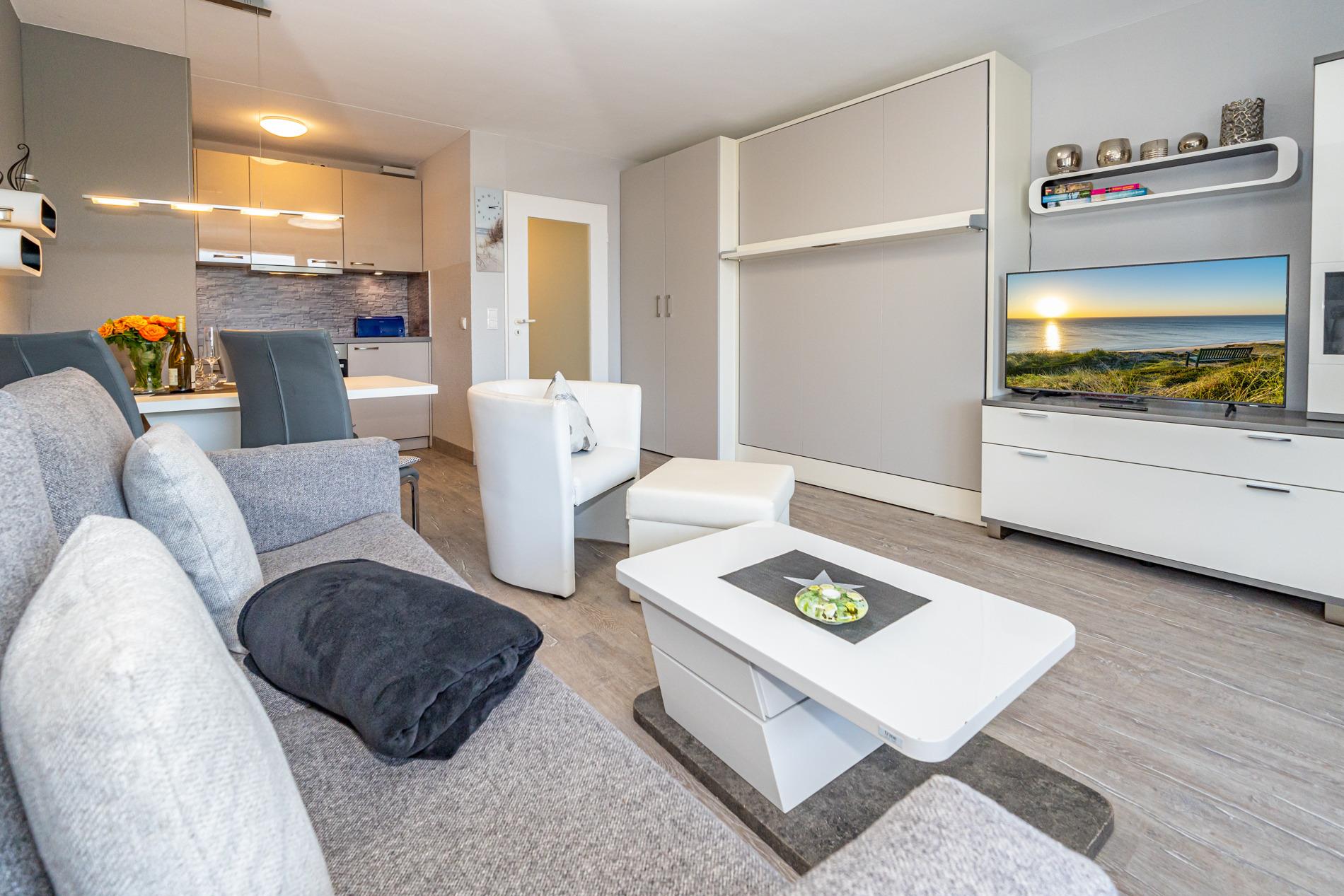 Der Wohnraum mit geschickter Raumaufteilung besitzt ein hochwertiges Sofa und einen bequemen Einzelsessel, sowie ein hochwertiges modernes Doppelschrankbett (Liegefläche ca. 1,60 x 2,00 m, durchgehende Matratze), dass am Tage einfach im Schrank verschwindet. Außerdem steht ein separater Essplatz, Sat-Flachbild-TV, WLAN und eine offene Einbauküche zur Verfügung.
