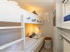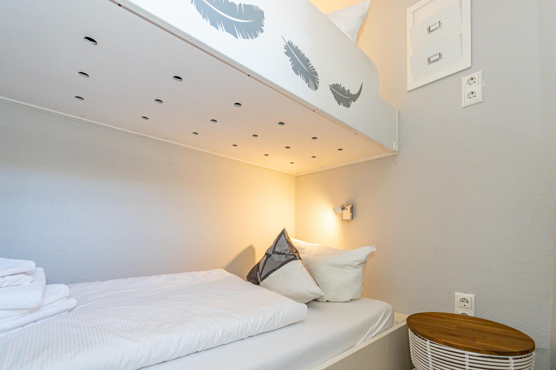Das kleine, feine Schlafzimmer hat ein Etagenbett mit guten Einzelmatratzen, das nicht nur Kinder zum Träumen einlädt.