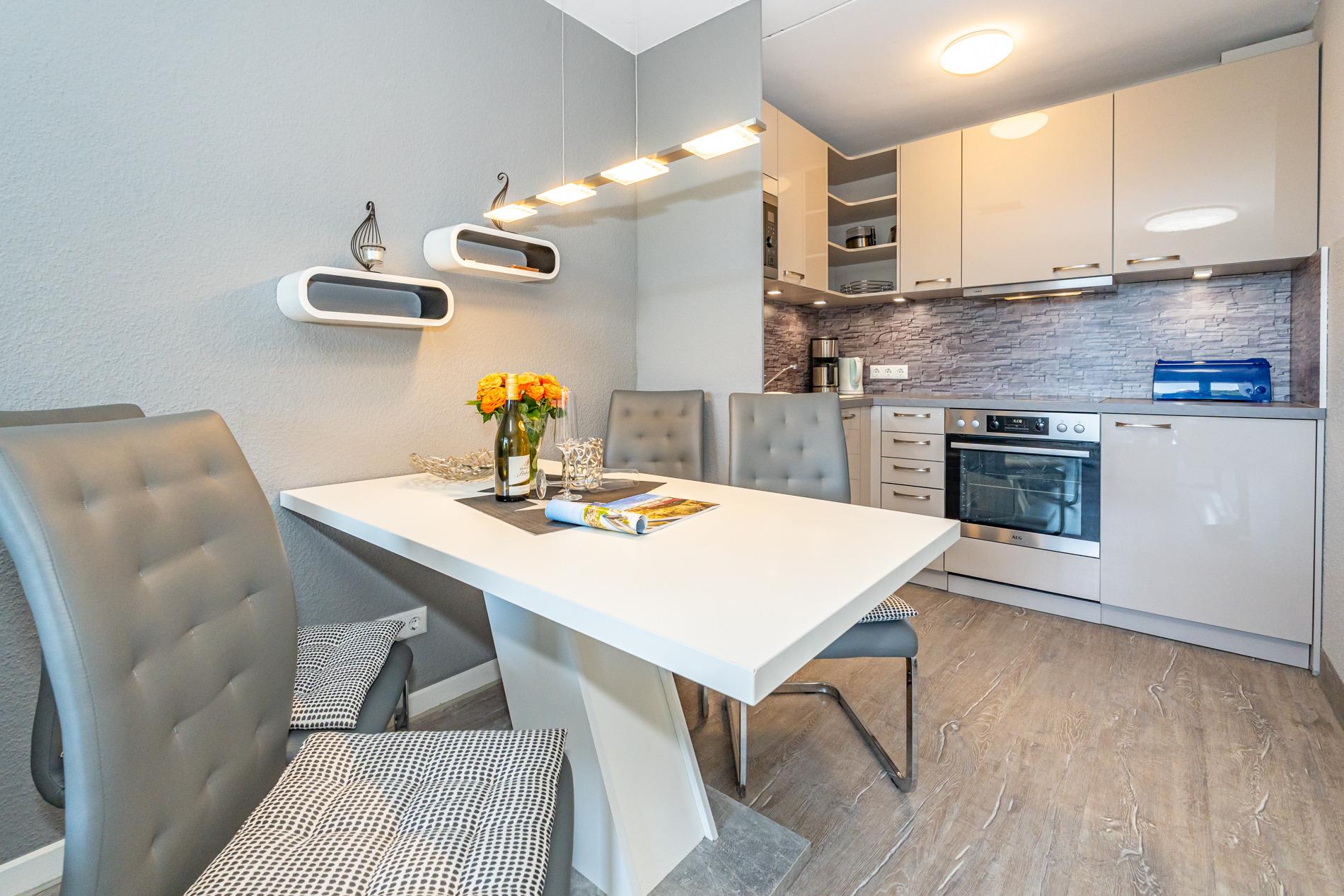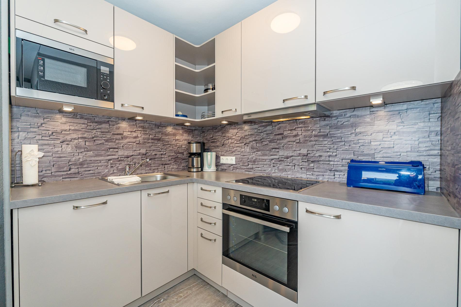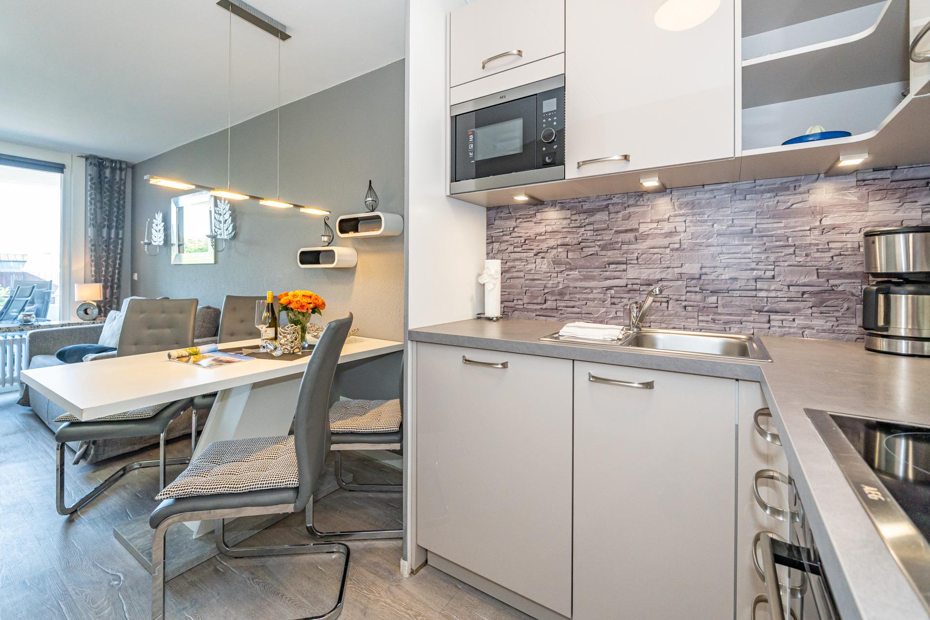 Die moderne Küche ist mit Geschirrspüler, Mikrowelle, Cerankochfeld (4 Kochfelder), Backofen, Nespresso-Maschine und einem Kühlschrank mit Gefrierfach ausgestattet und lässt keine Wünsche offen.