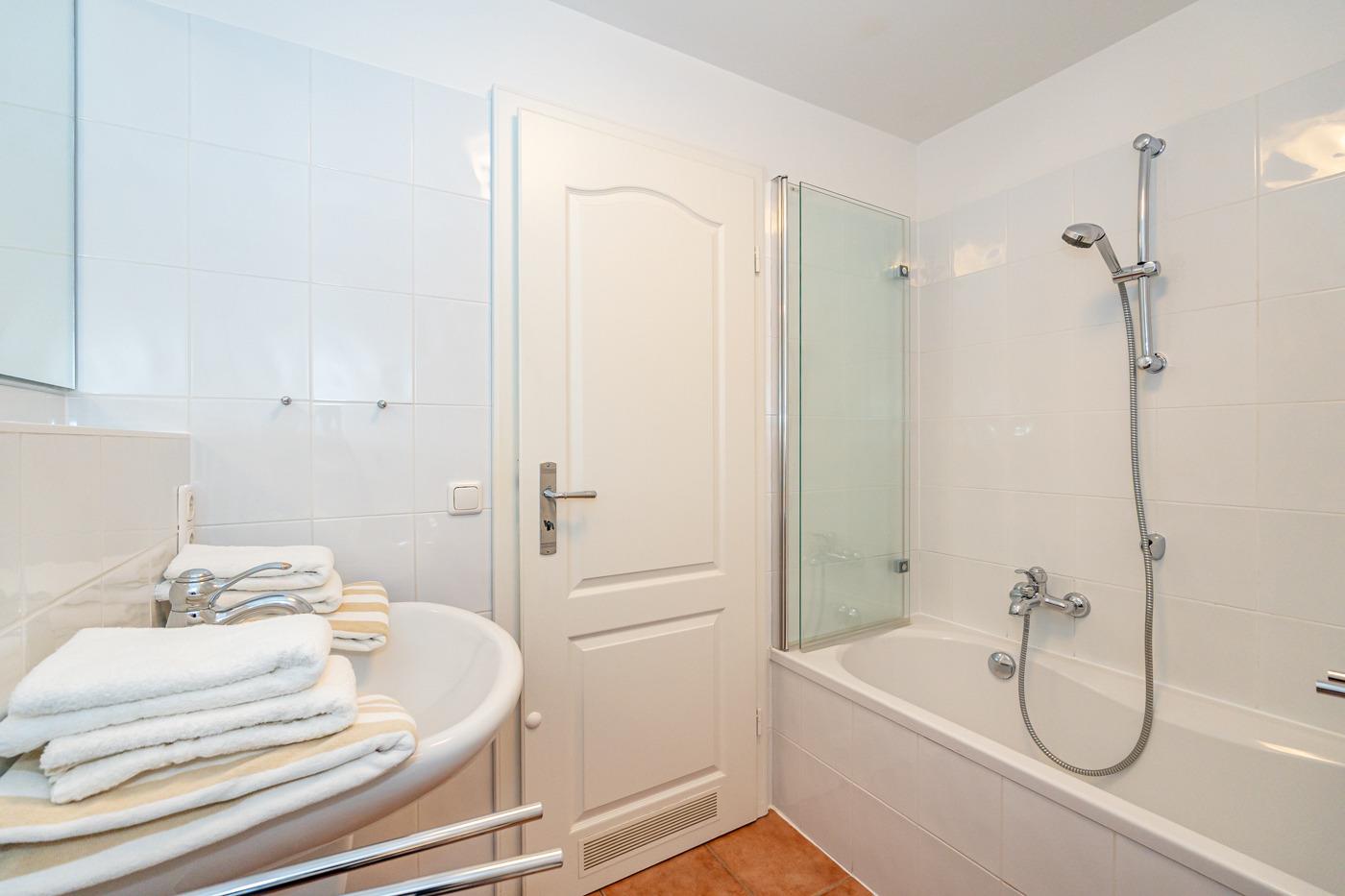 Das helle Wannenbad besitzt eine Badewanne mit Duschvorrichtung, Waschtisch, Handtuchtrockner, WC und Fön.
