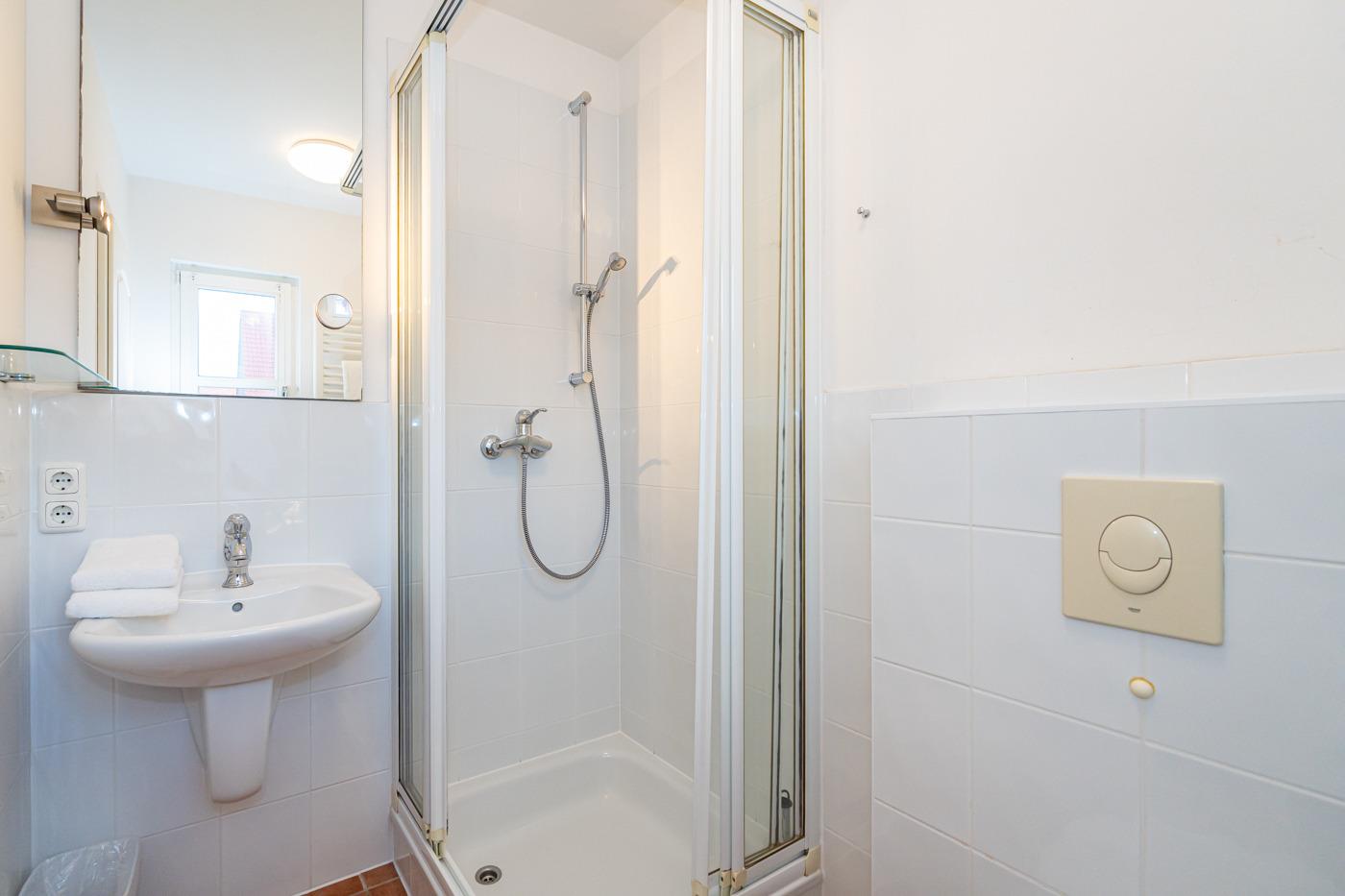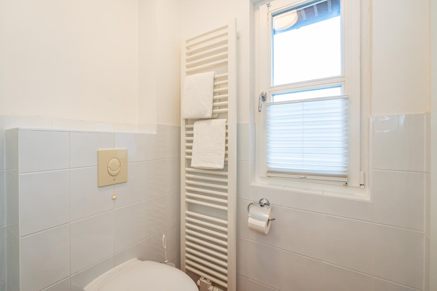 Das helle Badezimmer mit Fenster ist mit Dusche, Waschtisch, Handtuchtrockner, WC und Fön ausgestattet.