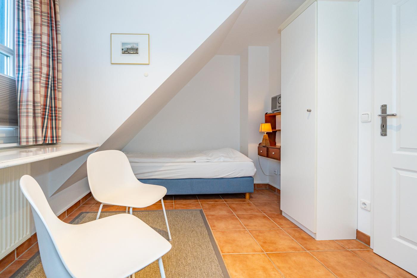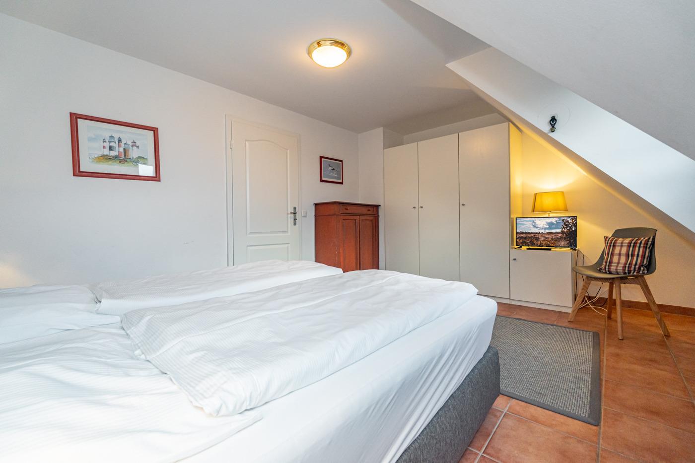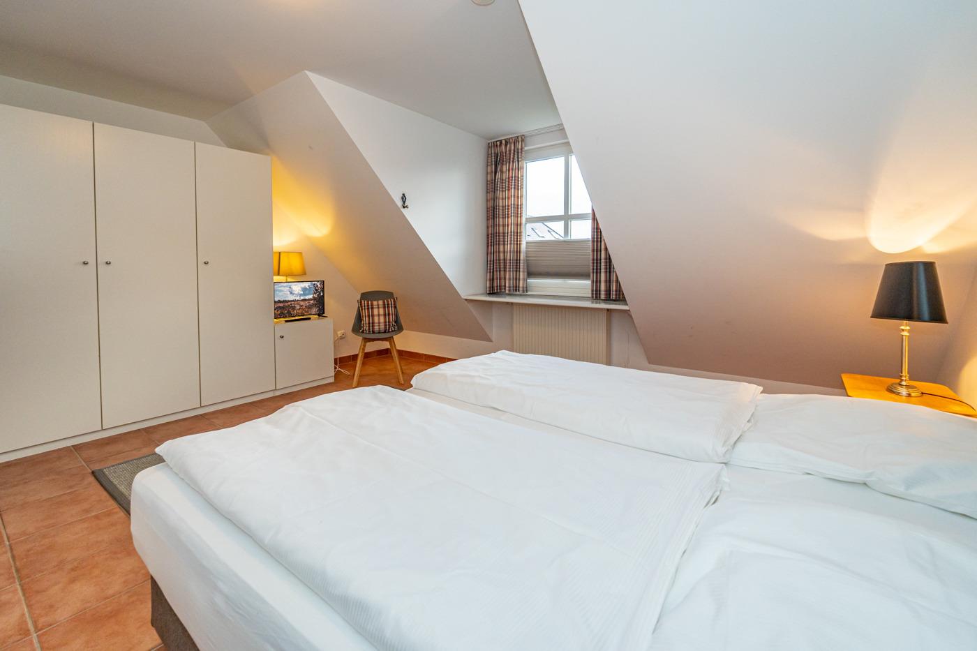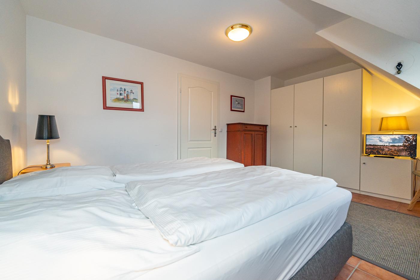 Im 1. Obergeschoss befinden sich ein großzügiges Schafzimmer mit Doppelbett (0,90 x 2,00 m), Kleiderschrank und TV, sowie ein Zweibett-Schlafzimmer (1,00 x 2,00 m) mit Kleiderschrank.