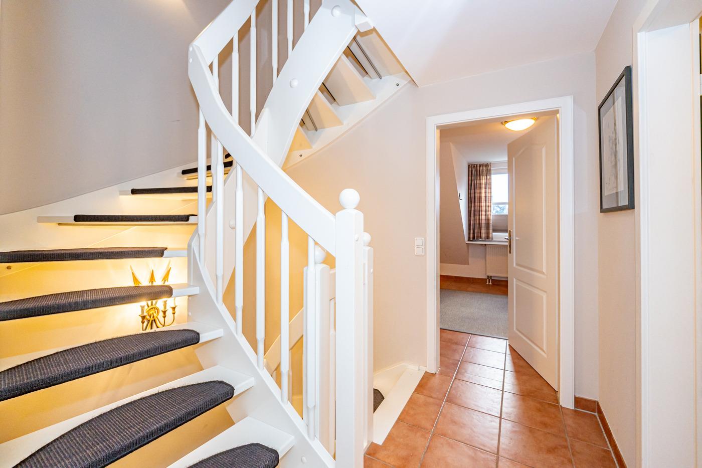Im Erdgeschoss gelangt man von der Diele in das exklusive Wohnzimmer mit offener Einbauküche, das Duschbad/WC und in den Hauswirtschaftsraum mit Waschmaschine und Trockner.