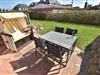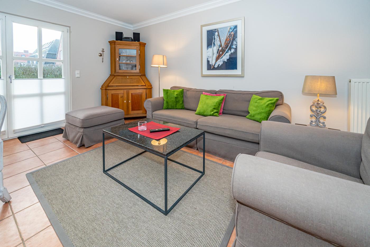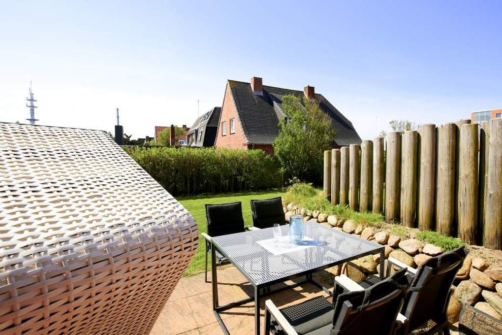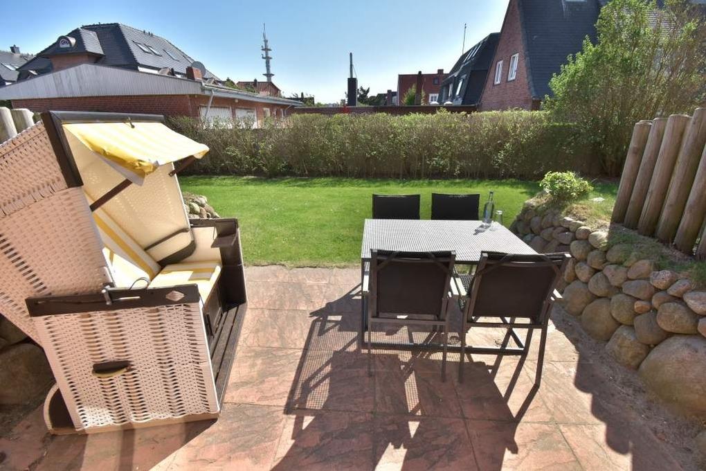 Vom Wohnzimmer betritt man die nach Süden ausgerichtete Sonnenterrasse mit Saison-Strandkorb (ca. April-Oktober) und Gartenmöbeln.