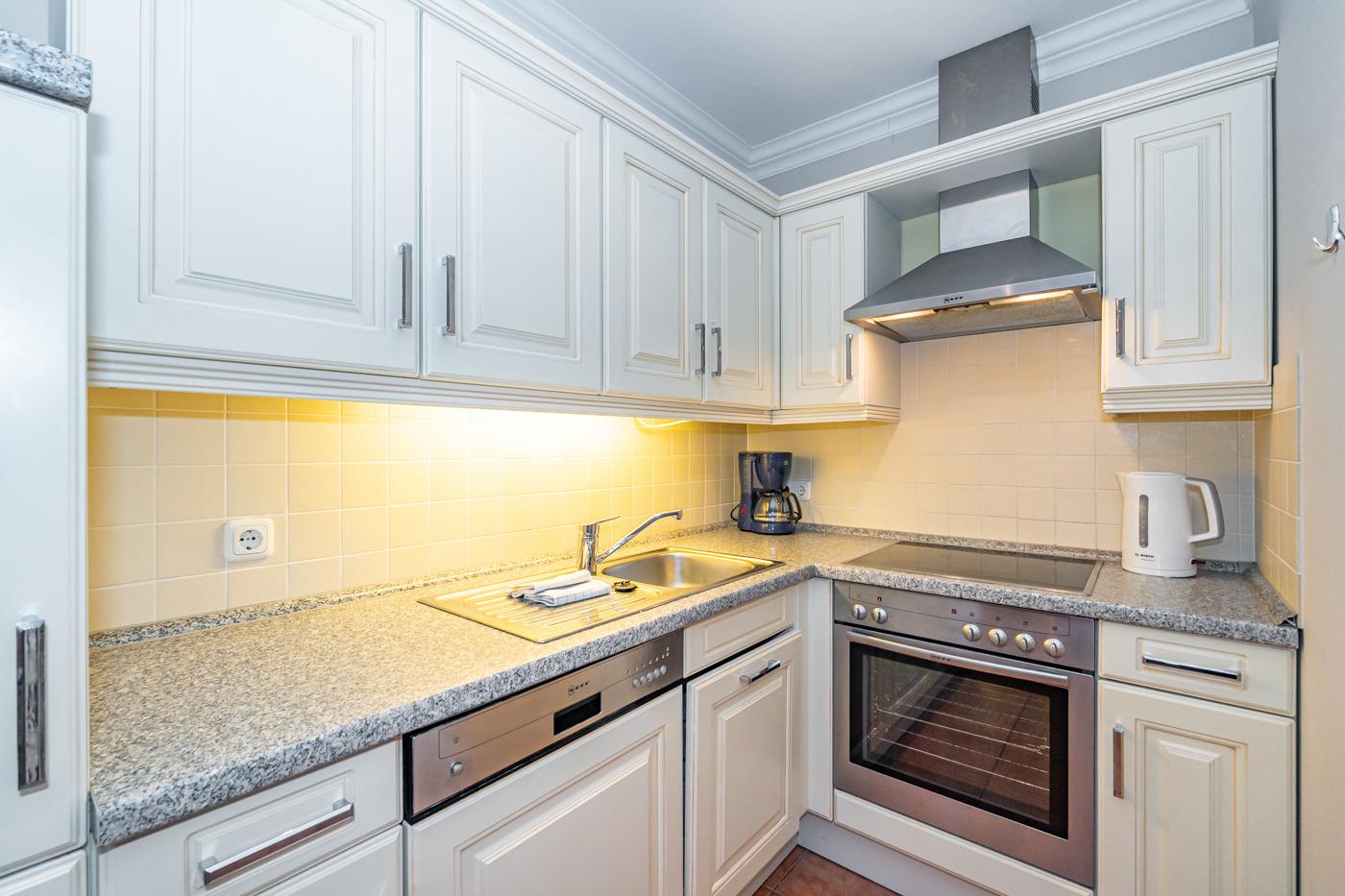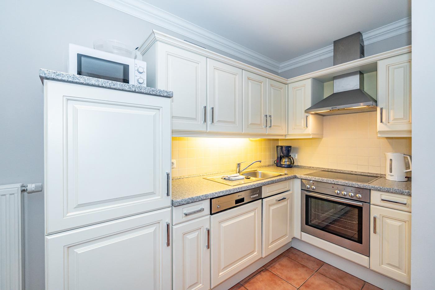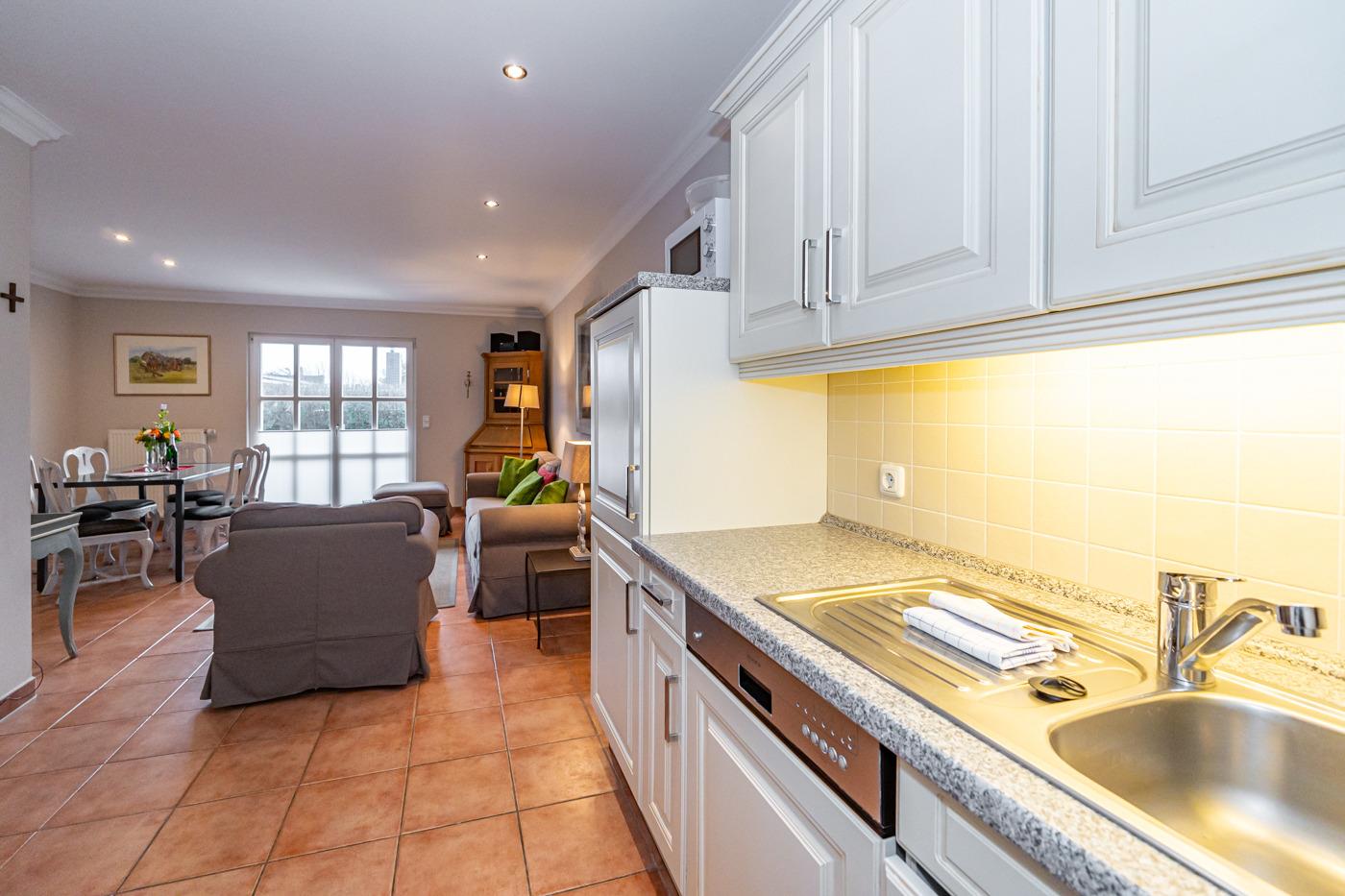 Die offene, vollausgestattete Einbauküche hat einen Geschirrspüler, einen Herd mit Backofen, 4-Platten-Ceranfeld und einen Kühlschrank mit 3-Sterne-Gefrierfach.