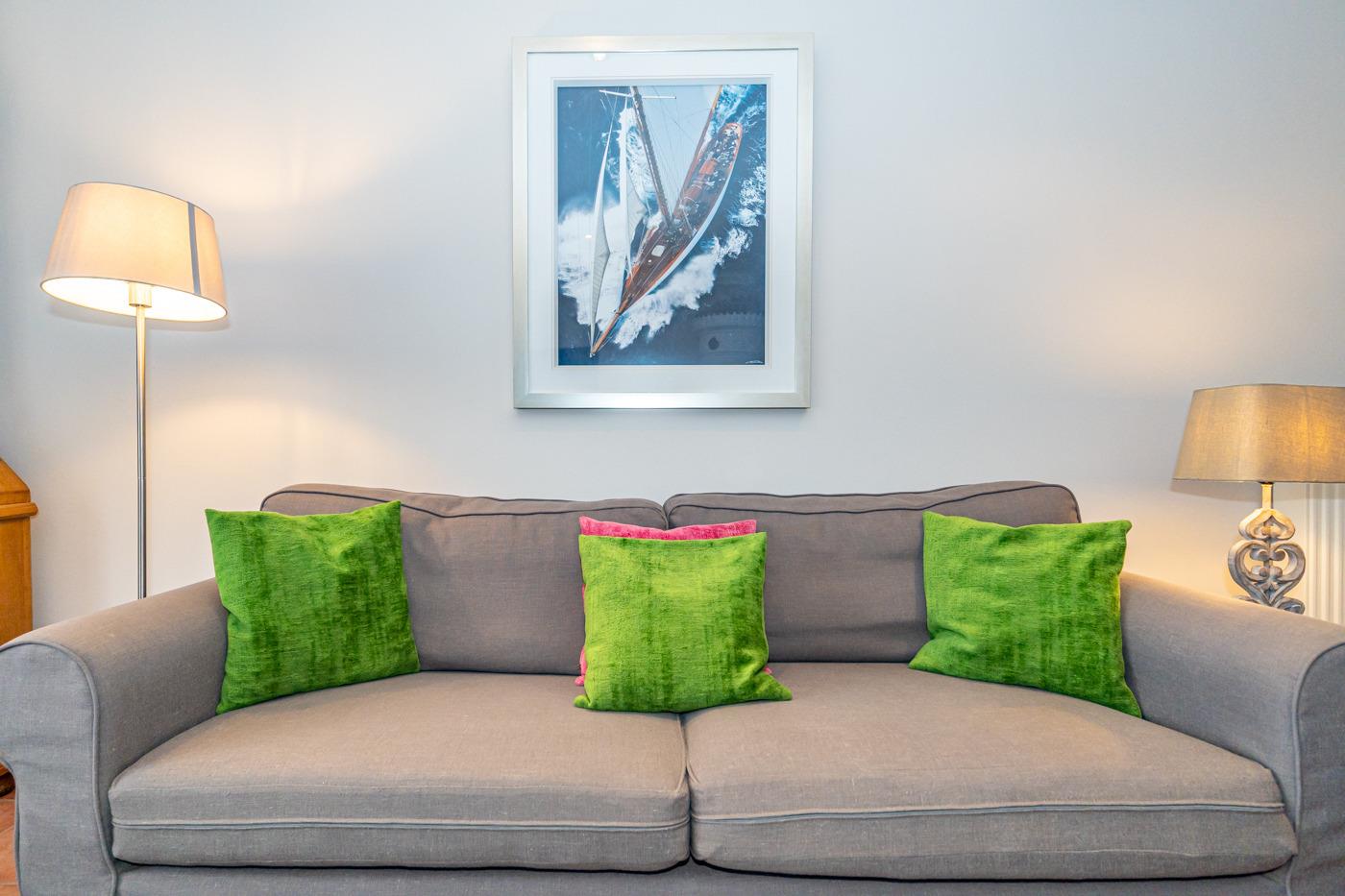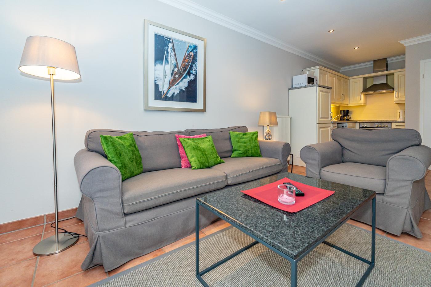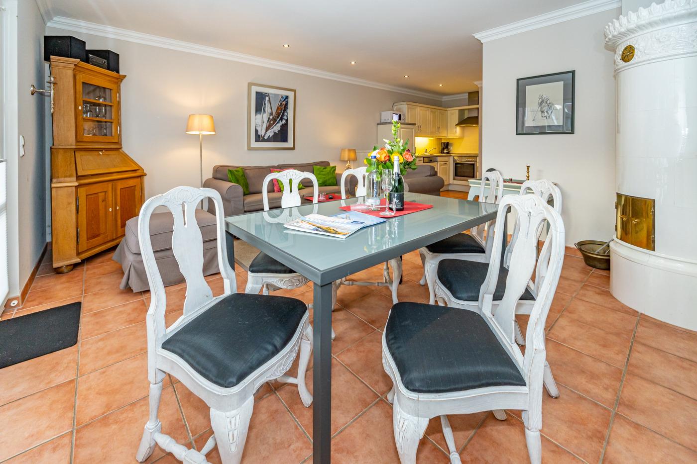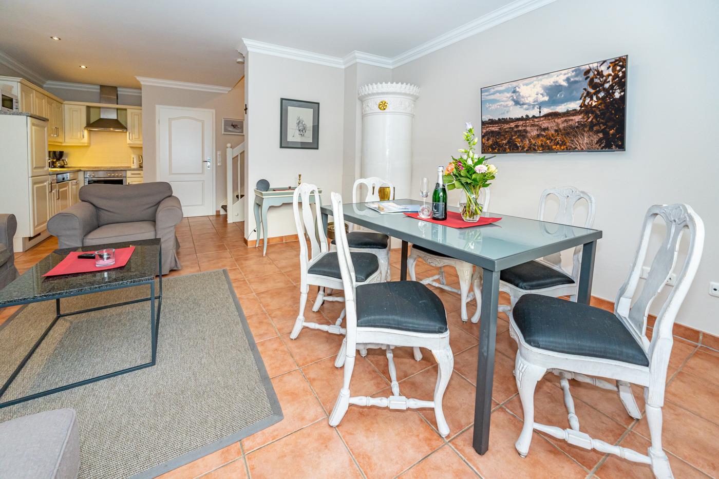 Das Wohnzimmer ist mit einer edlen Couchgarnitur (Zweisitzer-Couch und 1 Sessel mit Fußhocker), Essplatz für 6 Personen, weißem antiken Kachelofen, Kabel-Flachbild-TV, Radio/CD-Player und einer cremefarbenen Küche im Landhausstil ausgestattet. Kostenlose Internetnutzung per W-Lan.