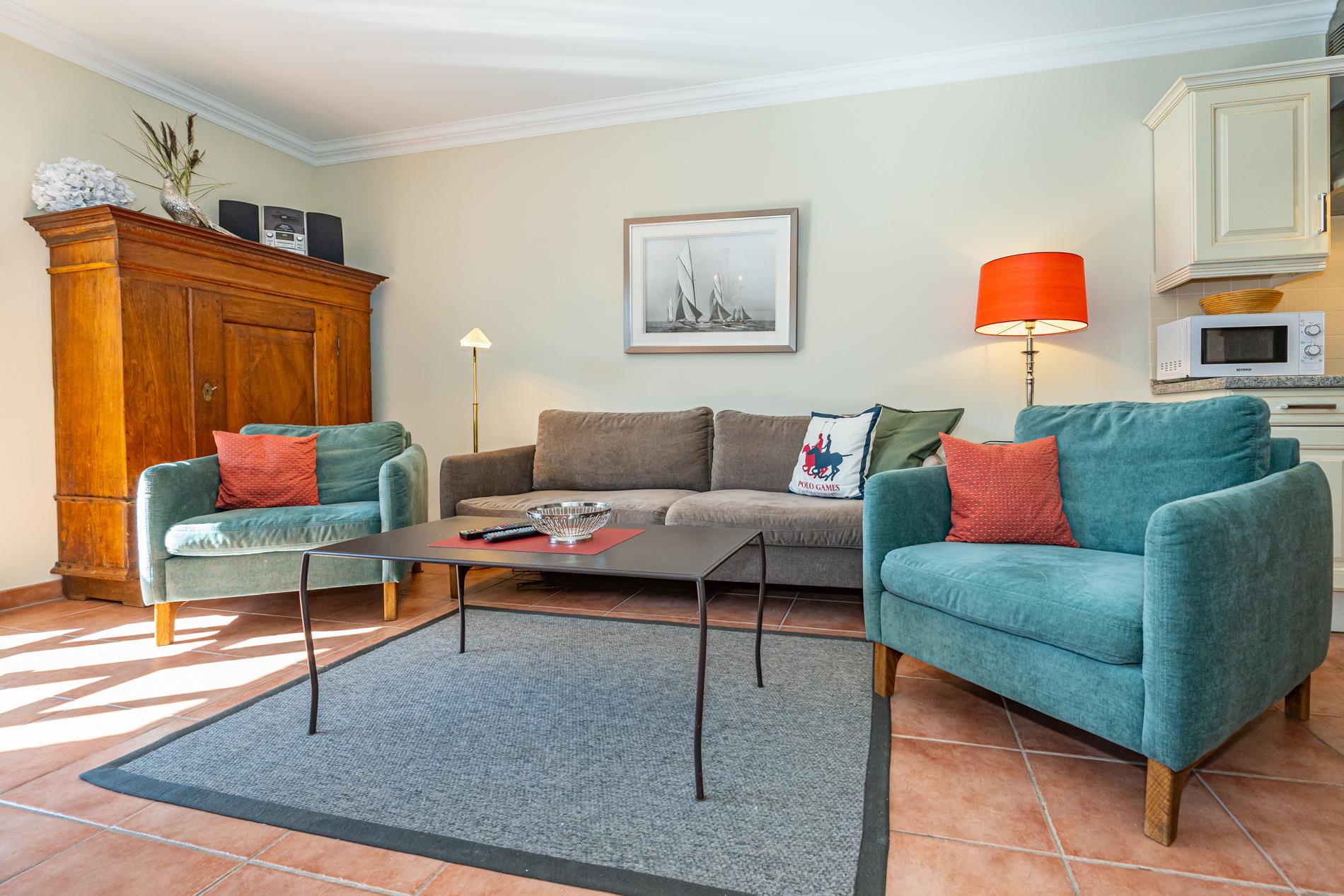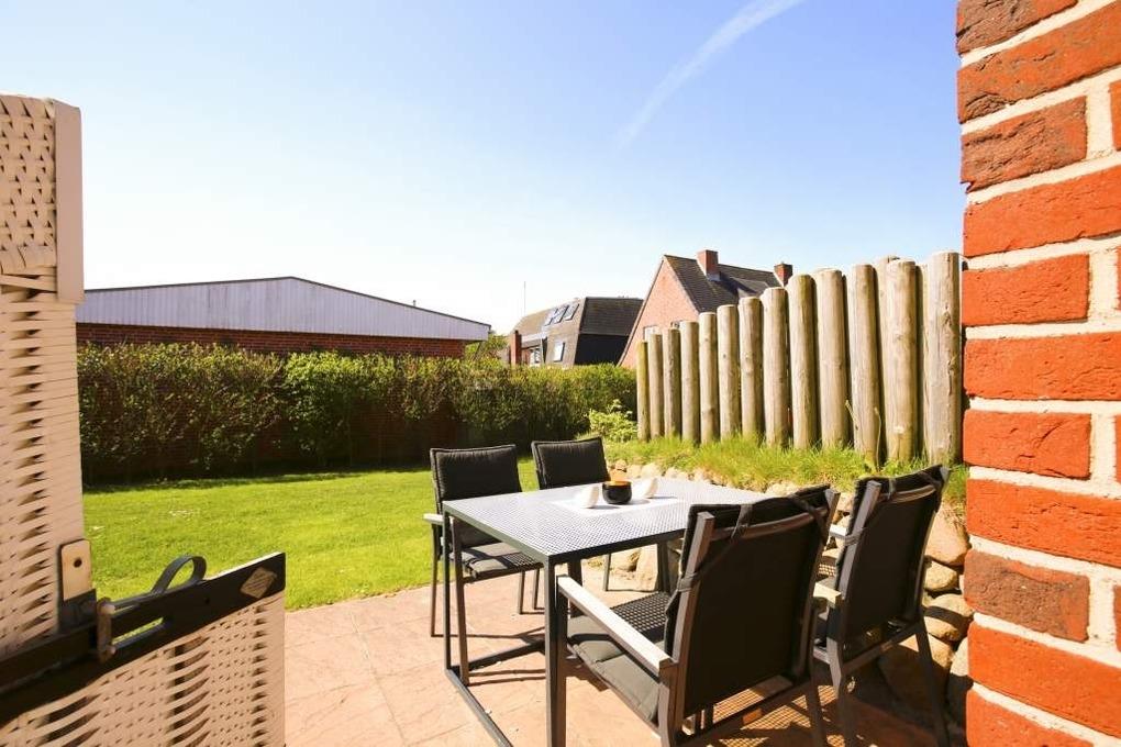 Vom Wohnzimmer betritt man die nach Süden ausgerichtete Sonnenterrasse mit Saison-Strandkorb (ca. April-Oktober) und Gartenmöbeln.