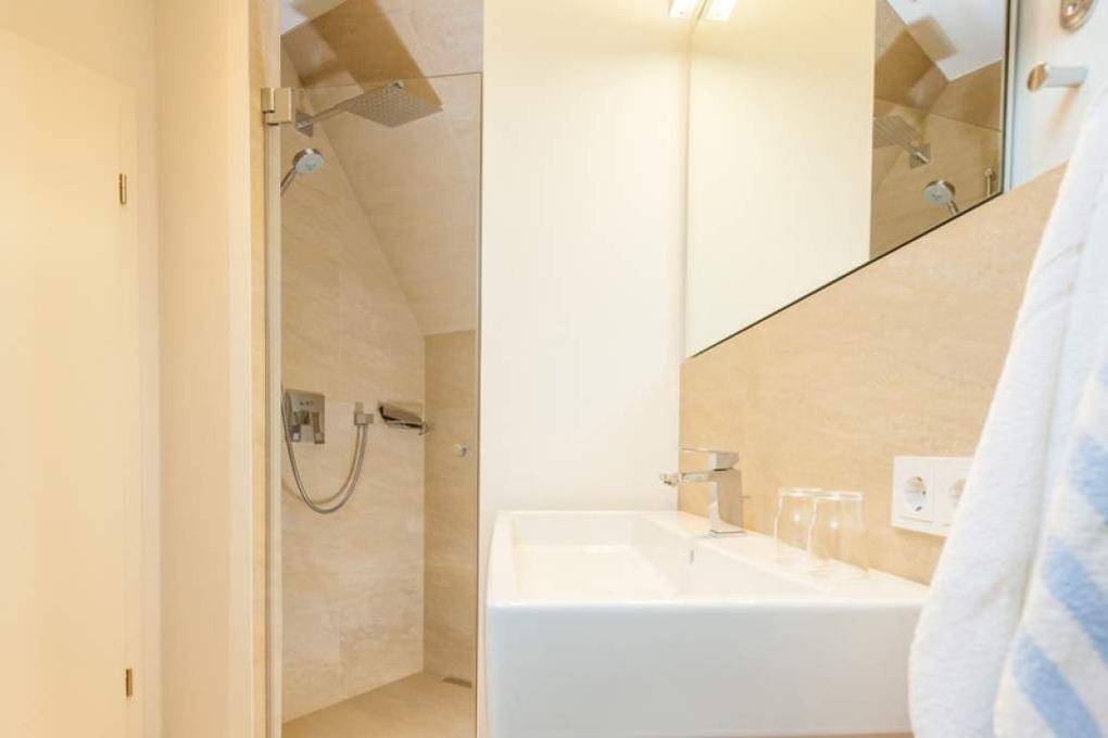 Das neue Bad lässt mit moderner Regendusche, Fön, Kosmetikspiegel, Waschtisch, Handtuchwärmer und WC keine Wünsche offen.