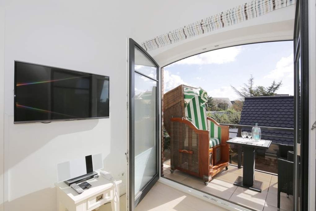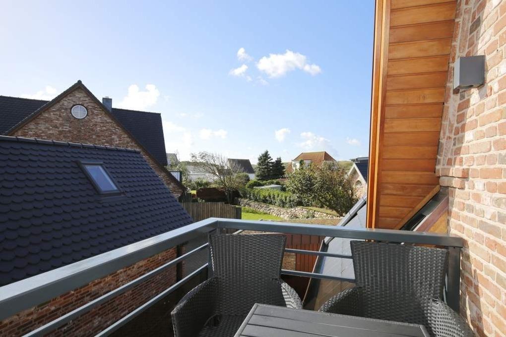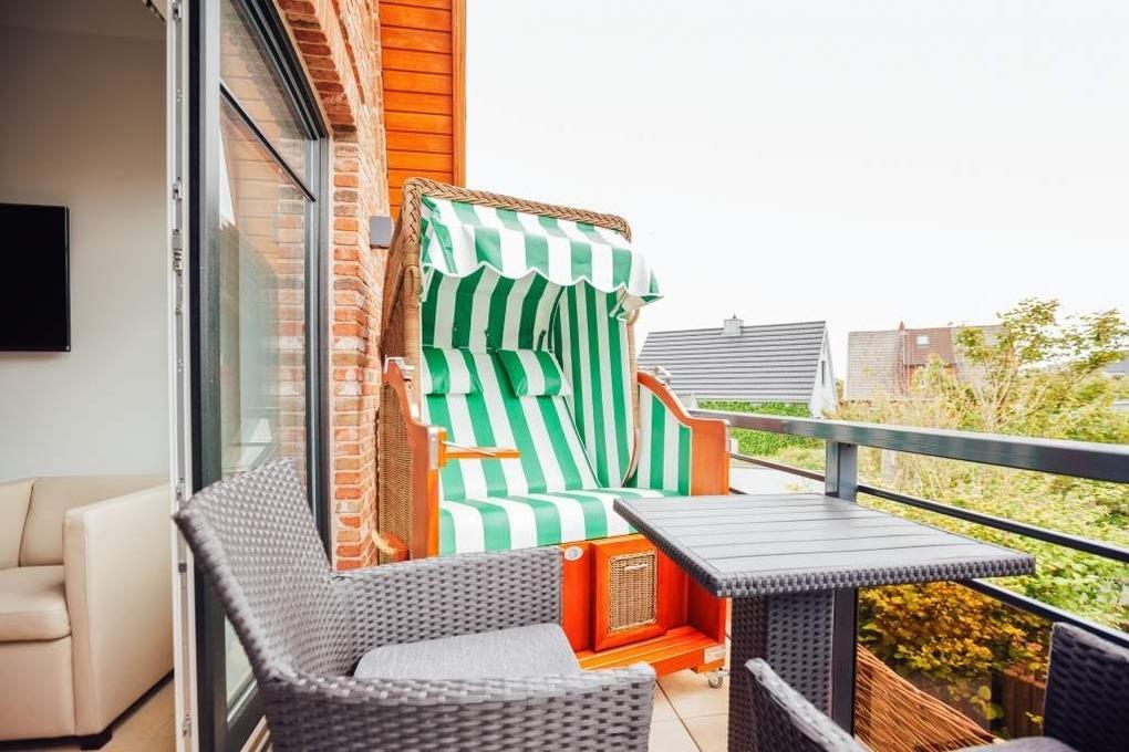 Luxuriöse 3-Zimmer-Maisonette-Nichtraucher-Ferienwohnung, ca. 68 qm, im 1. Obergeschoss, ein Südostbalkon mit Strandkorb, für 4 Personen.