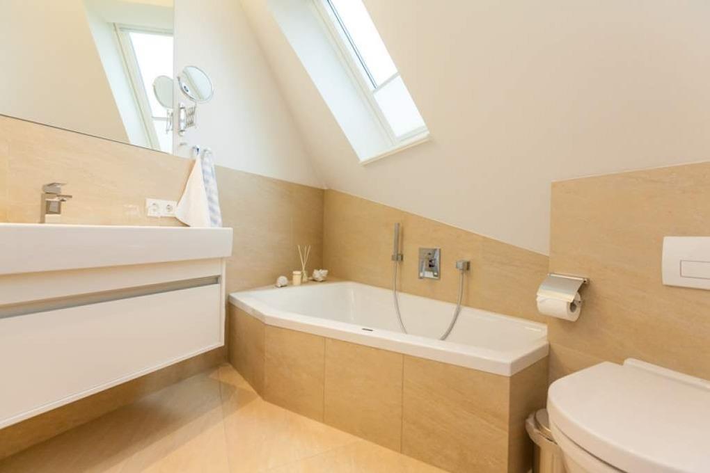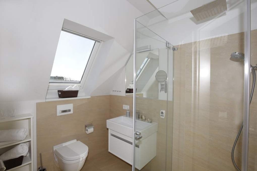 Im Dachgeschoss befindet sich ein geräumiges Doppel-Schlafzimmer mit Boxspringbett, ein weiterer Flachbild-TV und ein Vollbad „en Suite“ mit Badewanne, Dusche mit Regendusche, Fön, Kosmetikspiegel, Waschtisch, Handtuchwärmer und WC.