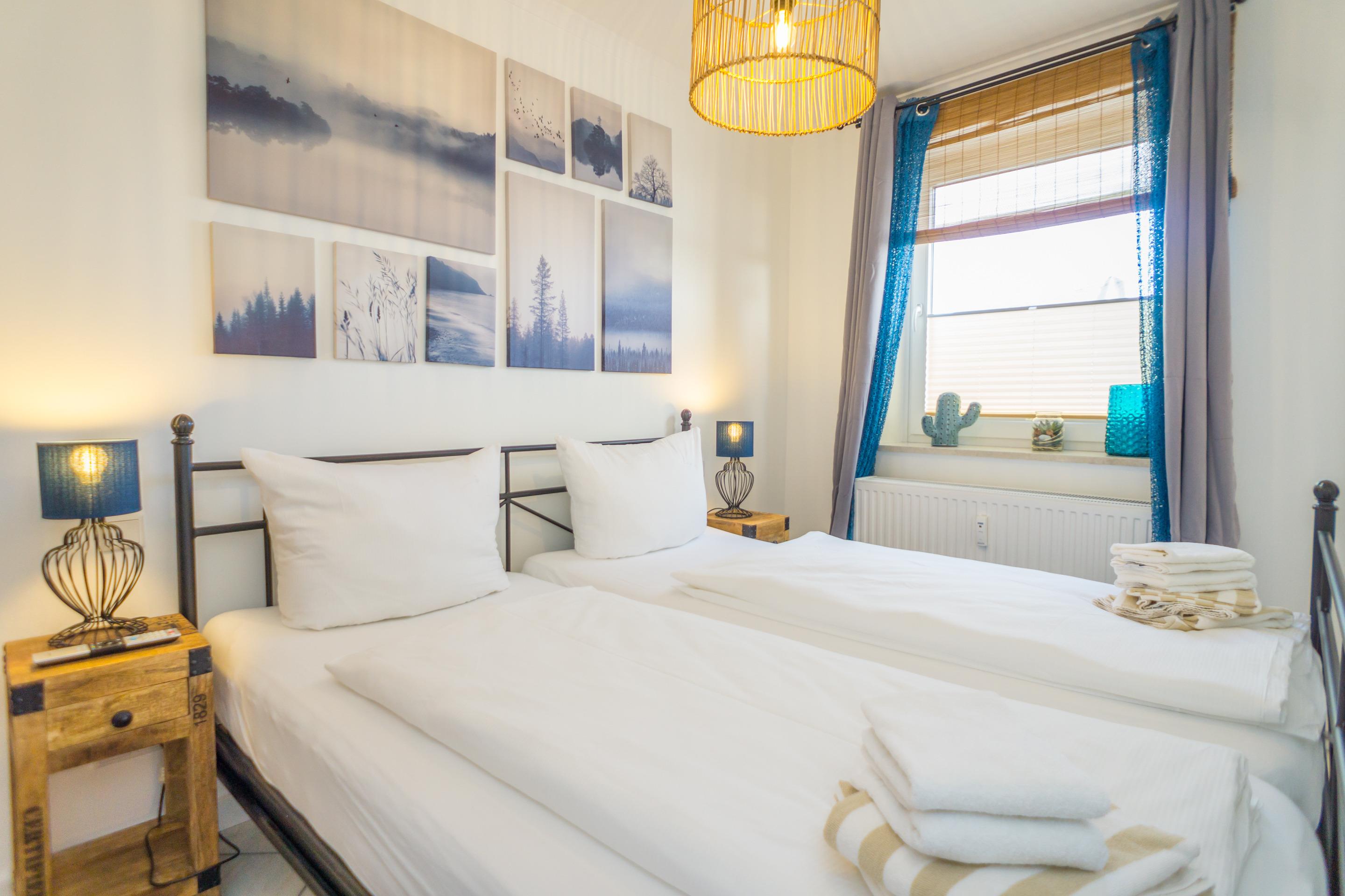 Diese einzigartige 3-Zimmer-Ferienwohnung (ca. 50 qm, max. 4 Personen und Haustier) in der 4. Etage verfügt über einen modernen Aufzug und einen frisch renovierten Laubengang. Nach einem Blick nach Westen auf die Nordsee und dem Öffnen der Haustüre gelangen Sie durch den Flur, an der hochwertigen Küche (4-er Ceran-Kochfeld, Geschirrspüler, Kühl-/Gefrierkombination, Kaffee- [&] Espressomaschine, Wasserkocher, Toaster, Mikrowelle), dem ersten Schlafzimmer (TV und komfortables Boxspring-Doppelbett mit 2 Matratzen je 2,0m x 0,80m mit durchgehendem Topper und 0,60m Komfortliegehöhe ) und dem Bad (Sitzbadewanne, WC, Waschtisch [&] Handtuchheizkörper) vorbei in das gemütliche Wohn- [&] Esszimmer (TV, Audio-Anlage, Sitzgruppe [&] Essgarnitur). Von hier aus gelangen Sie in das zweite Schlafzimmer (TV, großes Doppelbett mit 2 Matratzen je 2,0m x 0,90m) und auf den Balkon.