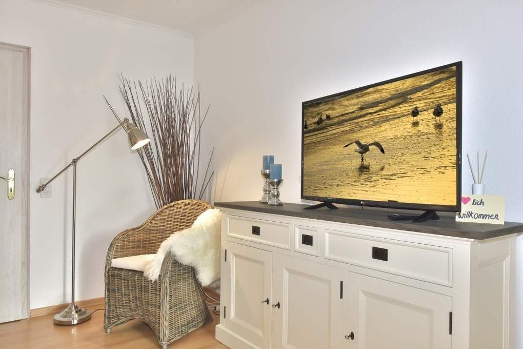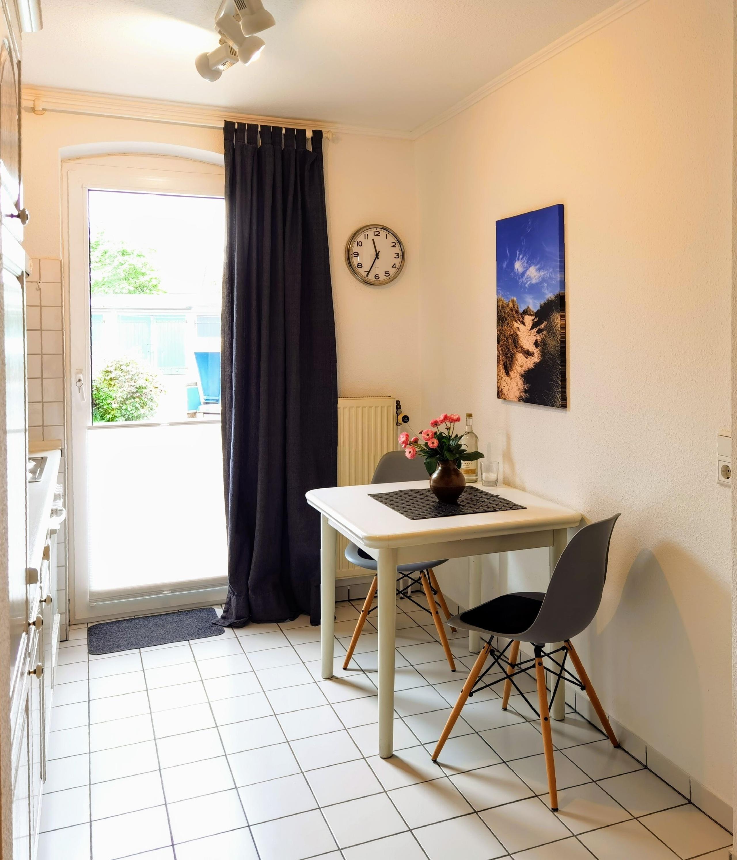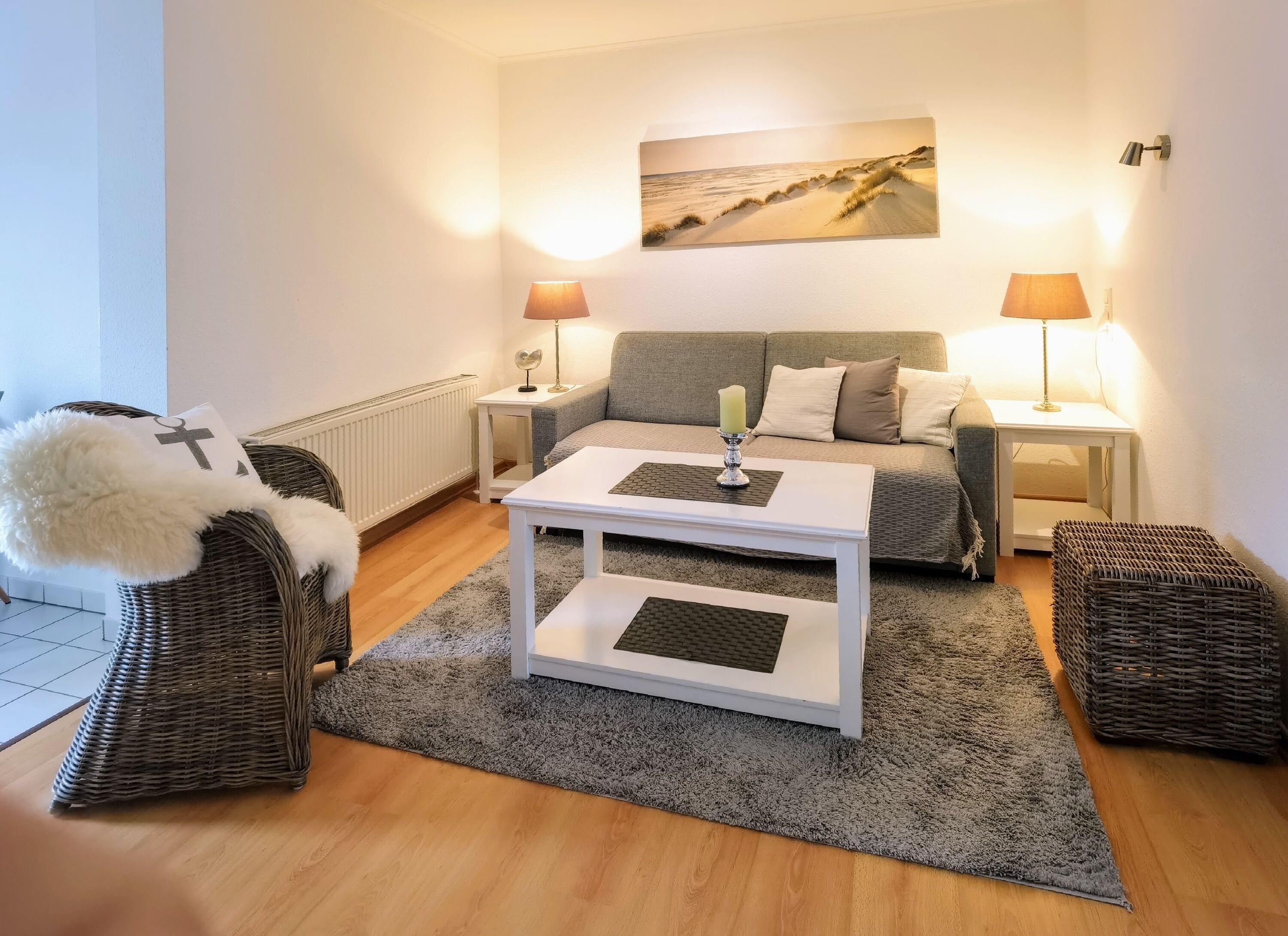 2-Zimmer-Nichtraucher-Ferienwohnung, ca. 50 qm, im EG mit Südterrasse (mit Terrassenmöbeln und Auflagen und Saison-Strandkorb) für max. 3 Personen.