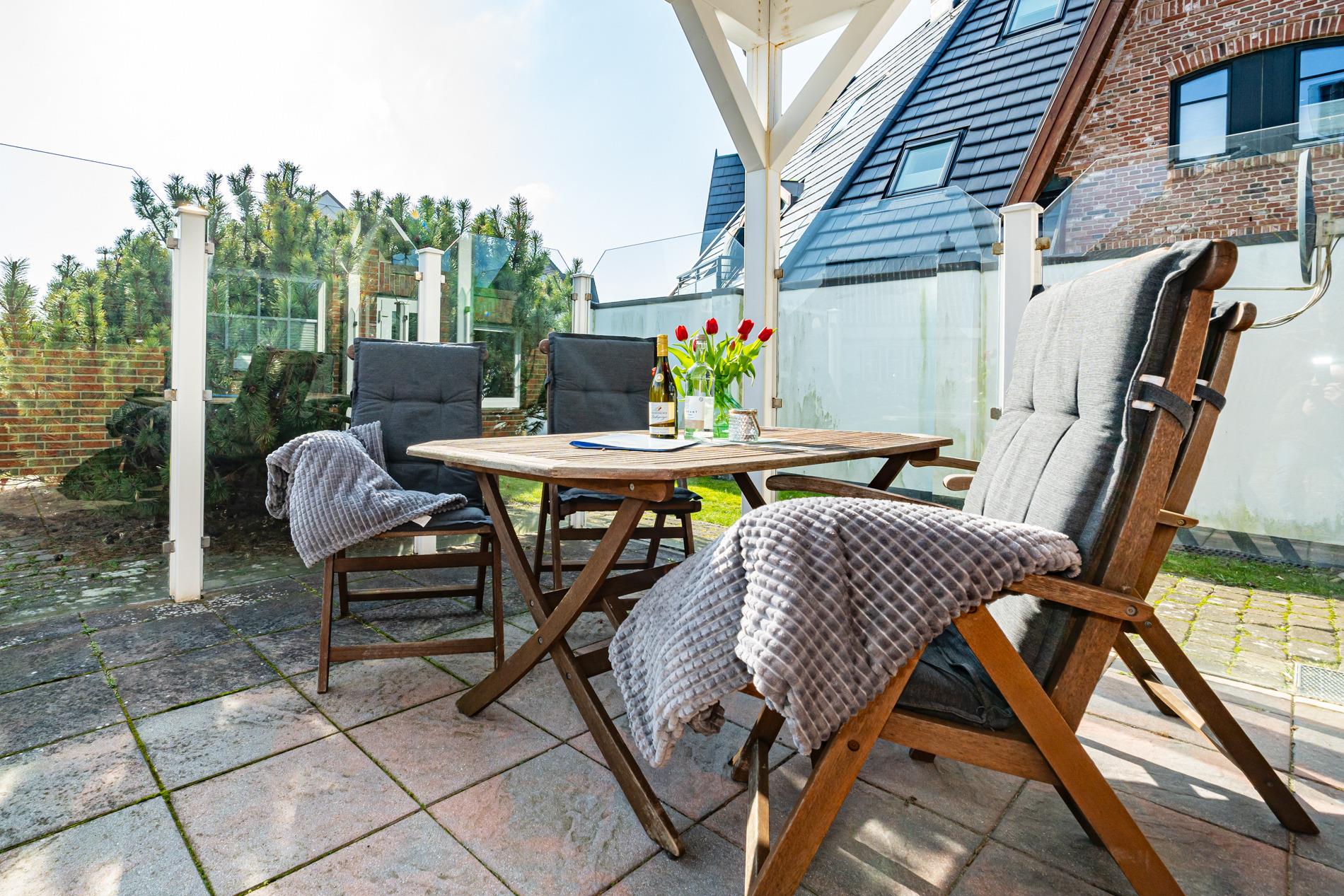 Exklusives Hausteil mit großem Garten, zwei Sonnenterrassen, Sauna [&] PKW-Stellplatz – Ihr Urlaubsrefugium am Südstrand von Westerland!