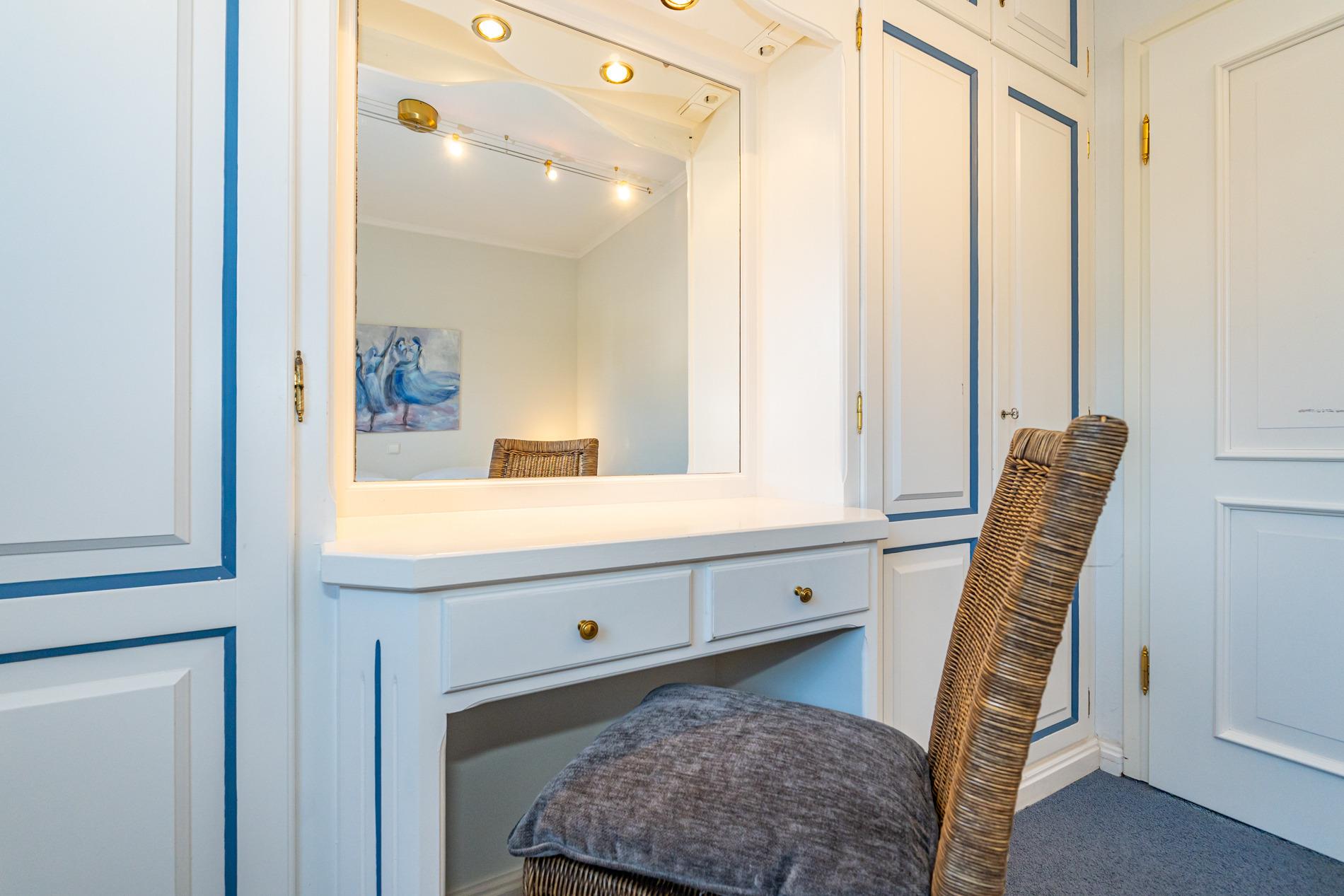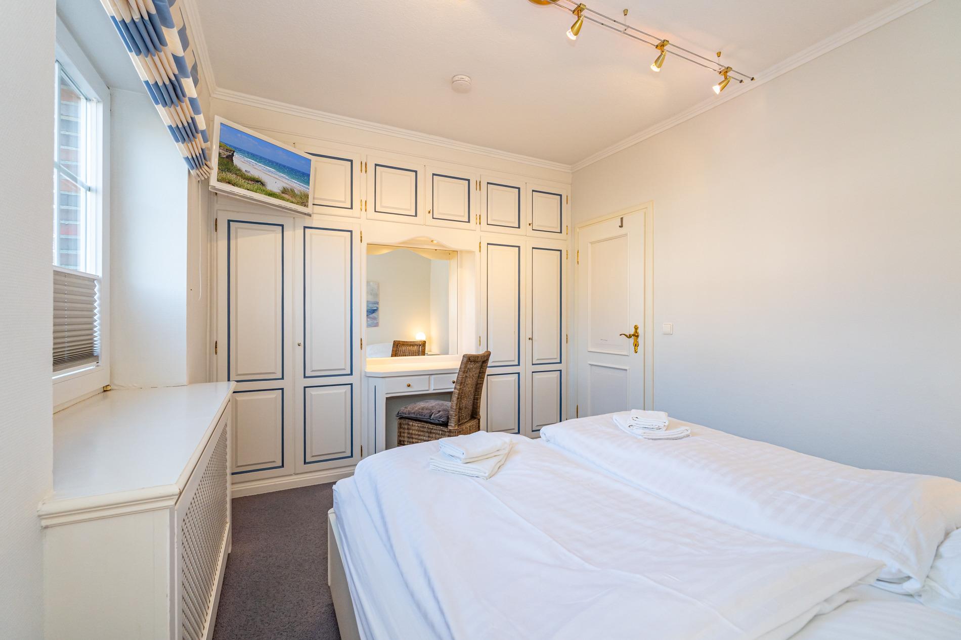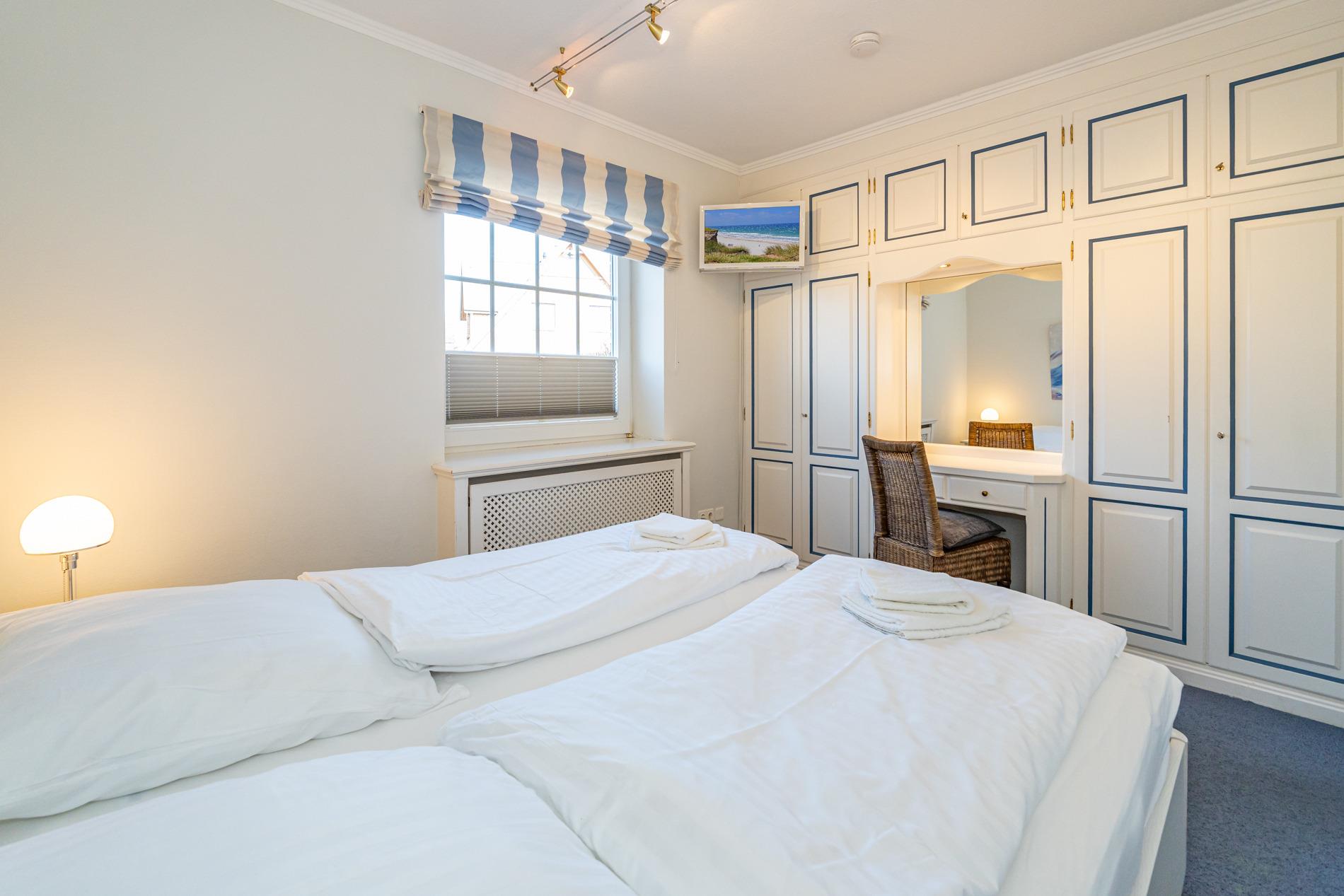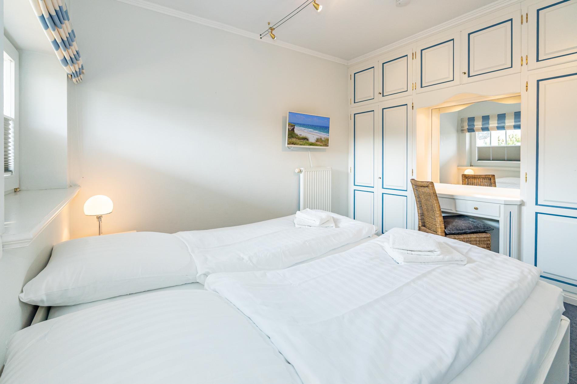 Zwei geschmackvoll eingerichtete Schlafzimmer verfügen jeweils über ein Doppelbett (1,80 x 2,00 m) mit separaten Matratzen, hochwertige Einbauschränke und Kosmetiktische.