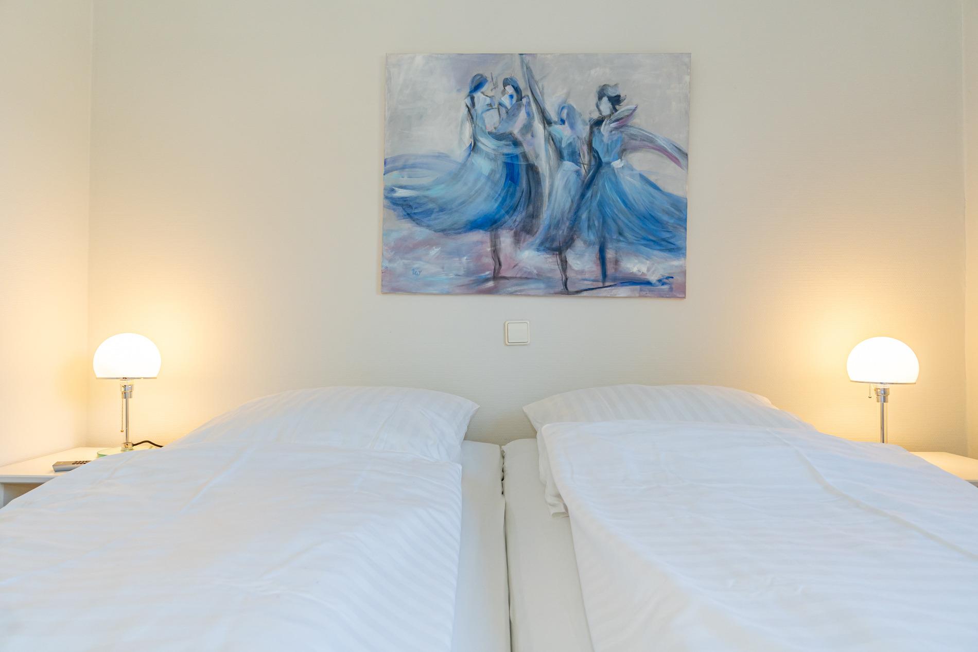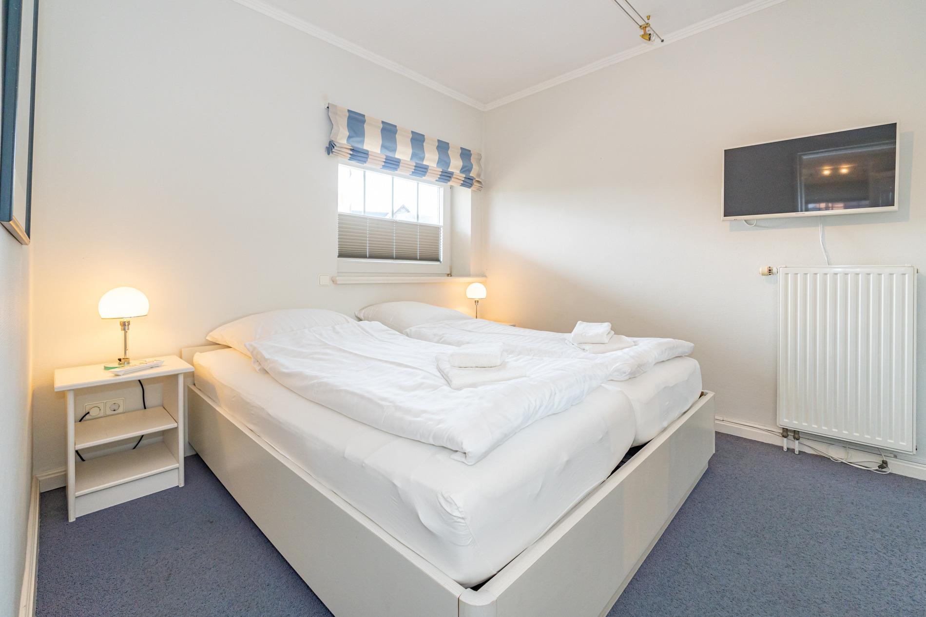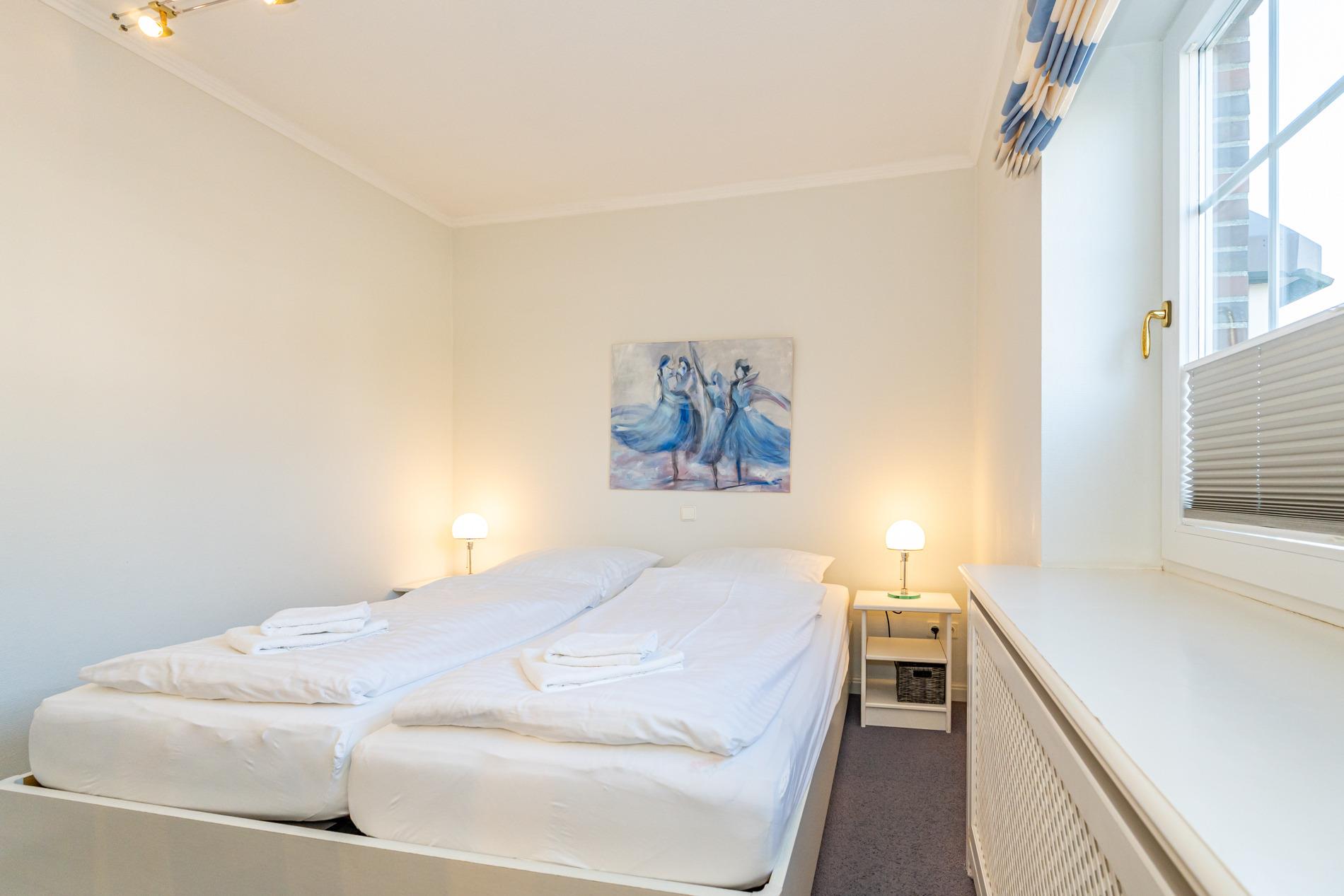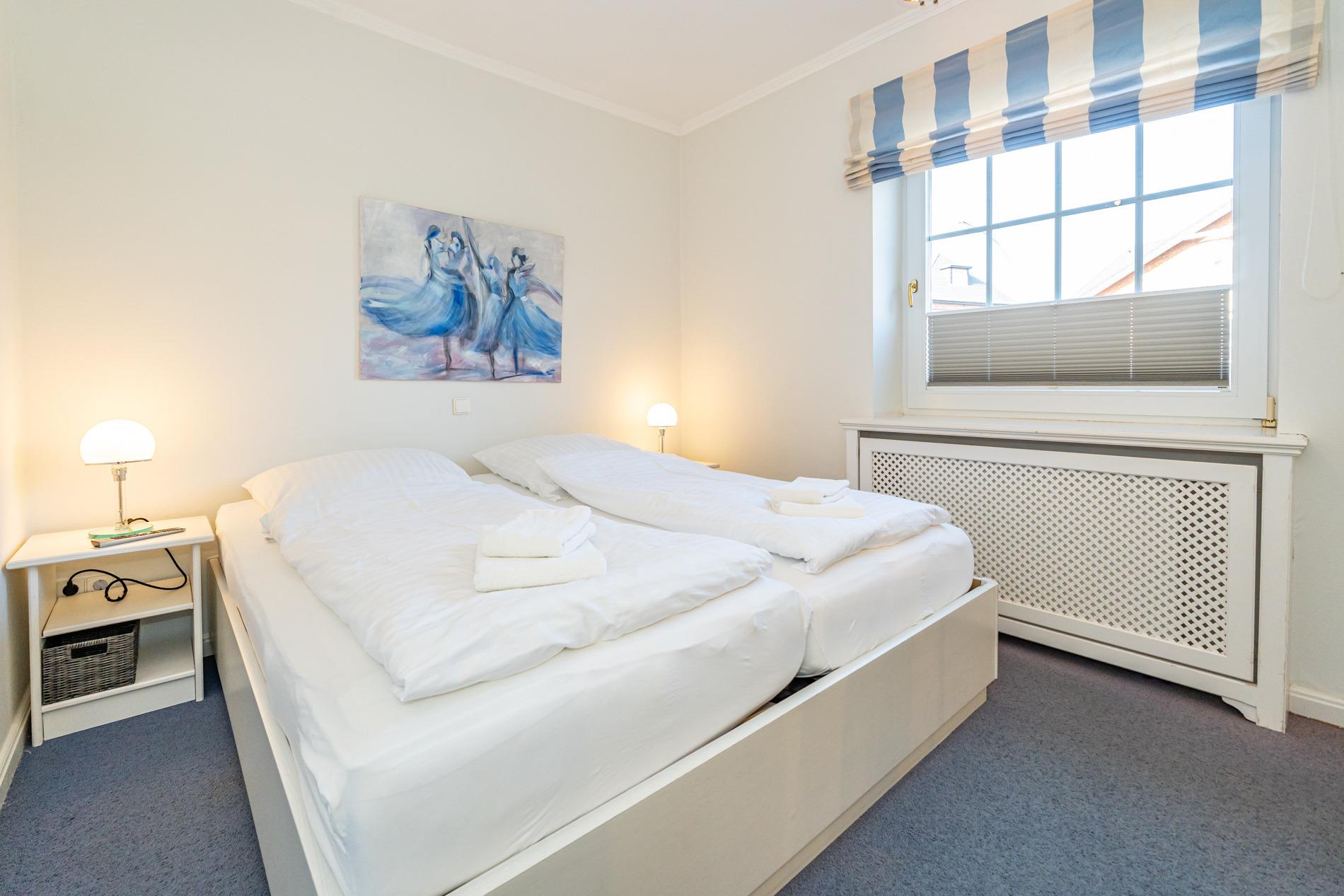 Zwei geschmackvoll eingerichtete Schlafzimmer verfügen jeweils über ein Doppelbett (1,80 x 2,00 m) mit separaten Matratzen, hochwertige Einbauschränke und Kosmetiktische.