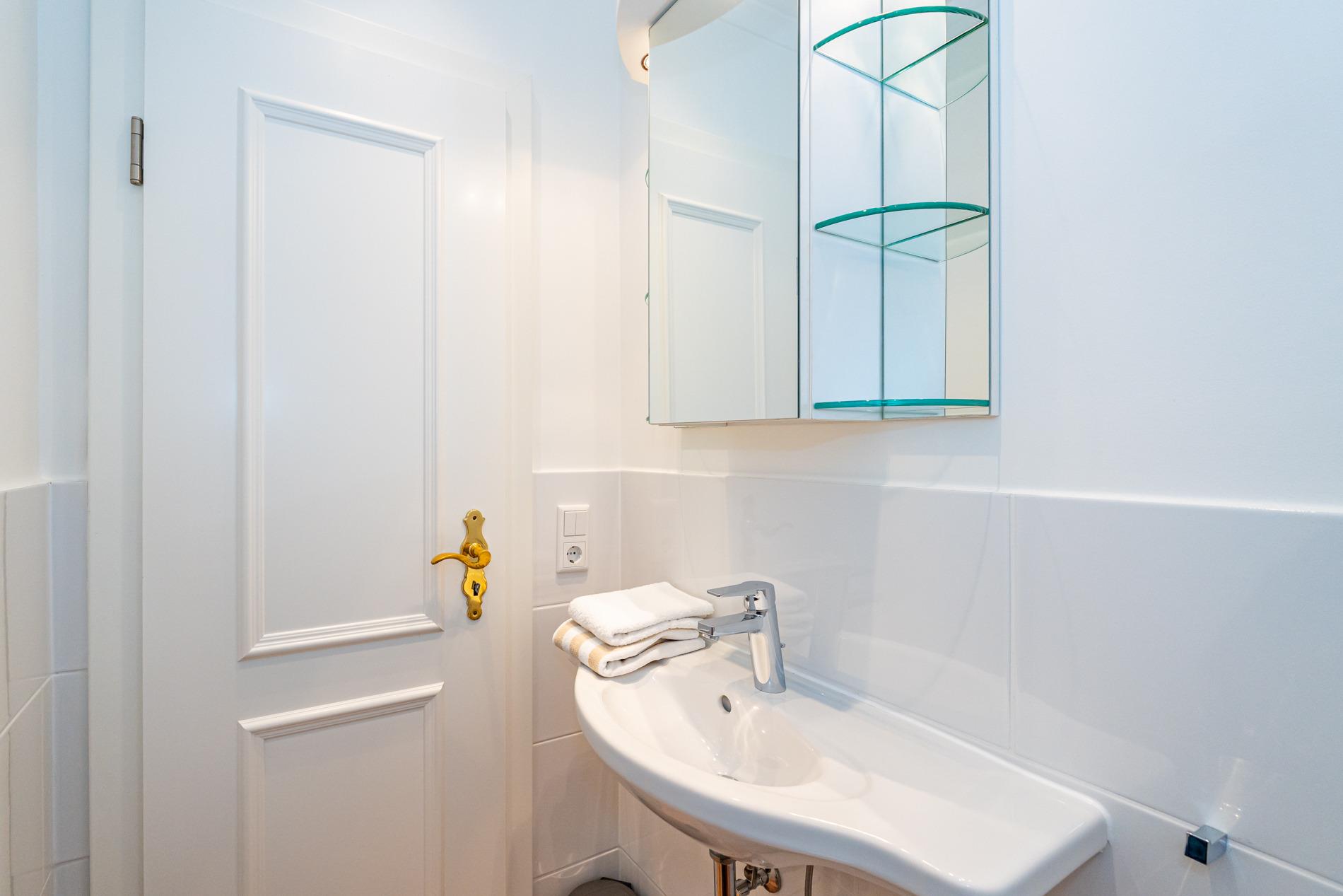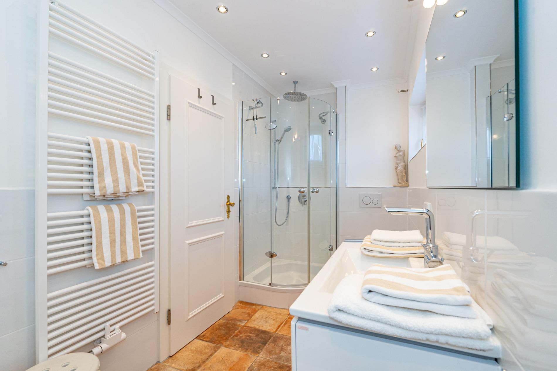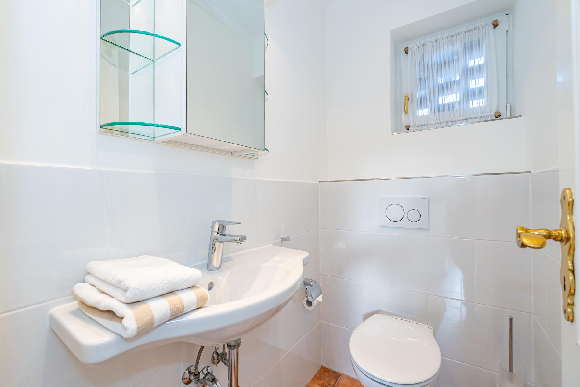 Das Badezimmer bietet Komfort mit Badewanne, Dusche, Waschtisch, Handtuchtrockner, Föhn und WC. Ein separates Gäste-WC steht zusätzlich zur Verfügung.